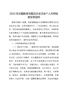 2023年主题教育专题民主生活会个人对照检查发言提纲按照市委统一部署,我紧紧围绕此次主题教育专题民主生活会的会议主题,在深化理论学习、广泛征求意见、深入谈心谈话、剖析典型案例的基础上,结合思想和工作实际,对照实施方案明确的六个方面重点查摆内容,着力查找存在的突出问题,深挖问题产生的根源,明确努力方向和整改措施。现将有关情况报告如下,请同志们批评指正。一、对照检查发现的主要问题(一)理论学习方面。一是理论学习的深度不够。虽然能够深入领会XXX新时代中国特色社会主义思想,深刻感悟两个确立决定性意义,但对照XXXXXX关于以学铸魂、以学增智、以学正风、以学促干的要求,在主题教育学习过程中还存在急用急学、现用现学的问题,在工作中经常满足于完成规定动作,存在着集中学习少、专题讨论少、剖析问题少的情况,学习的针对性、时效性、系统性需要加强。对于学什么、怎么学缺乏明确的认识,没有完全做到融会贯通、举一反三,对新理论、新观点、新战略学习研究也不够深入,在系统把握、扩展延伸上下功夫不够,对这一重要思想的世界观、方法论和蕴含其中的立场观点方法的把握还还不够系统全面。二是理论与实践结合还不够紧密。对XXX新时代中国特色社会主义思想的理解和感悟,停留在浅表化的层面和维度,离学思用贯通、知信行统一的标准,还有一定的差距。突出表现为把XXX新时代中国特色社会主义思想中的世界观和方法论与分管工作深度融合还不够到位,用政治眼光观察和分析问题的水平还有待提高,主动服务和融入全省工作大局,围绕省政府中心工作履职尽责的政治自觉还不够,理论学习和实践运用在一定程度上存在两张皮现象。(二)政治素质方面。一是政治站位还高。对XXX新时代中国特色社会主义思想精髓的领会不够深刻,有时还缺乏政治视野和全局眼光,对国之大者的理解和把握还有欠缺,大局观念和全局视野还需提升,谋划工作、落实上级决策部署时还存在一定的本位主义思想,在思想意识上经常首先考虑如何完成本单位的任务指标,缺乏从战略的高度和全局的思维。同时,政治素养方面还不够高,政治判断力、政治领悟力、政治执行力不够强,对两个确立中的理论逻辑、历史逻辑和实践逻辑,未能完全做到知行合一。二是党建工作质量不高。政治机关意识树得还不够牢,还存在思想认识误区,对于分管处室的党建工作责任链条拧得不紧、业务和党建融合不够,对于支部组织生活会质效提升没有明确严的标准,存在两层皮的情况。意识形态抓的还不够紧,对个别干部职工的不当言论缺乏必要的批评教育,疏导干部思想情绪、引导干部坚定理想信念、发扬艰苦奋斗精神、提振干部精神面貌等方面还存在不足。(三)能力本领方面。一是思想解放还有不足。在工作当中新发展理念树立不够牢靠,工作中系统思维运用不够充分,没有以更加开阔的眼界、思路和胸襟,从推动全省发展大局的高度看待工作,对国家宏观经济形势、党中央和省委、省政府的决策部署没有做到心中有数,脑中有方,对于工作的重心找得不准,对于一些职能交叉、信息交融、问题交织的牵头协调组织领域没有统筹考虑,没有彻底打破信息壁垒,导致工作成效体现不充分。二是业务水平还不高。在落实省政府对高质量开展综合办公工作的重要部署要求的方法还不够务实管用,把握上级会议精神不够准确,推动落实上级议定事项不够及时、不够有力,业务能力没有做到与时俱进,把上级要求部署融入实践工作当中还有欠缺。(四)担当作为方面。一是发扬斗争精神还有不足。随着年龄的增长,干事创业的劲头不足,有着瞻前顾后,求稳怕乱、思前想后的顾虑,面对新形势新压力,思想不够解放,开拓进取意识不够强,习惯于用老办法解决新问题,工作中忙于应付多,主动落实少;研究情况多,解决问题少,缺乏突破创新的措施和思路,缺乏动真碰硬、求变求新的勇气。二是勇于担责意识不强。不敢担责、不想担责、不愿担责的意识还时不时存在,针对局里同志提出的一些合理诉求、合理建议,存在谁提问题谁解决的顾虑而不敢向上反映。(五)工作作风方面。一是调查研究不深入。虽然能够认识到调查研究的重要意义,但能担当、拼能力、靠实干的精神锻造不够,调查研究开展了不少,但部分调研习惯以召开座谈会、听汇报的方式开展,直接面向基层和群众的调查研究还不经常、不深入,调研总结经验多、反映问题少,调研成果运用还存在不足,通过调研破解群众关心的急难愁盼问题方面做得还不够。二是服务群众不够主动。对以人民为中心的发展思想体会领悟不深刻,没有完全践行全心全意为人民服务的宗旨,工作重心大多放在服务领导、综合协调、组织接待等工作上,对于正确政绩观认识不够深入,唯上不为下的风气没有根本扭转,深入群众的时间相对较少,对基层群众所思所盼了解不够深入。(六)廉洁自律方面。尽管我能够始终绷紧从严从紧这根弦,严于律己、严负其责,坚持以严的基调强化正风肃纪,锲而不舍落实中央八项规定精神