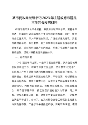 某市民政局党组书记2023年主题教育专题民主生活会发言材料根据专题民主生活会安排,我聚焦主题深化学习,坚持学深悟透,打牢开好这次年度民主生活会的思想基础。同时,紧密结合工作实际,深入开展谈心谈话,广泛征求意见建议,紧紧围绕理论学习、政治素质、能力本领等方面查找自身存在的差距和不足,深刻剖析问题产生的根源,明确了今后努力方向和整改措施。现将对照检查情况报告如下。一、存在的问题(一)理论学习方面。一是学习紧迫感不强。认为自己长期在民政系统工作,积累了丰富工作经验,仍习惯于吃老本,在思想上产生了骄傲自满和松懈的情绪,继而放松了学习。在理解领会、转化运用方面还比较欠缺、不够灵活,对创新理论蕴含的世界观、方法论掌握不好,没有完全把科学理论升华为政治信仰、内化为思想素质、转化为实践能力,导致思维理念、眼界还不够开阔,抓工作落实还存在发力不够、用力不准、效果不好等问题。如,对中央的重大决策部署,一定程度上满足于学过了、安排了,在及时结合分管工作谋划推动落实方面做得不够。二是学习举措强度不够。面对职务调整,在理论学习上满足于完成规定动作,存在着集中学习多、个人自学少的问题,学习的针对性、实效性不强,面对本领恐慌现状,不能做到如饥似渴的学习。特别是担任局党组书记以来,由于时间冲突、会议冲突、工作影响等因素,存在挤占学习时间、推迟学习计划、减少学习内容的现象。(二)政治素质方面。一是政治敏锐性还不够强。对新时代党面临的四大危险四大考验认识不深,在微信朋友圈等网络媒体上出现的一些苗头性、倾向性问题虽有一定敏感性,但对一些损害党的形象和威信的言行警觉性不够,监控、制止舆情信息传播的方法措施较少。比如,看到一些网络谣言,收到一些手机段子,只要内容不牵涉到本地,就觉得无所谓;对一些传播的错误思想和言论抵制不力,不能积极地开展批评,没有挺身而出、以理服人的勇气和自信。二是执行组织生活制度不够严格。在坚守党的双重组织生活等制度方面,还有落实标准不到位的情况,没有用好批评和自我批评这一思想武器。如,每年仅仅在民主生活会和组织生活会上,才进行全面系统地自我反思,广泛听取意见建议,平时与班子成员、与普通党员干部开展谈心谈话、听取意见建议少,特别是思想感情方面的沟通偏少,对干部职工的工作生活困难了解和关心还不够。(三)能力本领方面。一是创新思维能力不强,在工作中遇到棘手的困难,会有变通、绕开的想法。存在按部就班的思维和心理,在工作推动中习惯于循惯例、找路径,创新思维、辩证思维、前瞻思维能力有待提升,科学研判形势、把握事物本质的能力还要强化。面对繁重的工作任务,有时会有畏难情绪和疲于应付心态,担当作为的主动性和积极性不足,降低了工作标准。如,在创新优化多元救助帮扶服务改革中,特别是扩中提低改革重点领域和重点群体,缺乏积极的心态和不破不立的决心,往往有等等看、慢慢推的想法,致使部分工作推动四平八稳,成效一般。二是攻坚克难的实践本领有欠缺。在面对新时代新时期民政工作的新问题、新矛盾,缺乏前瞻性谋划、系统性布局,特别是一些长期存在的老大难问题,不敢动真碰硬,存在畏难情绪,破题解题的拼劲和狠劲不足。如,一老一小服务一直是我市工作的难点和薄弱点,我在统筹推动设施和服务下沉,构建大社区养老服务新格局上迟迟打不开工作局面,建设基本养老服务体系与群众期盼还有很大差距,无法满足群众需求和提供高品质的养老服务。(四)担当作为方面。一是政绩观还不够端正。在正确处理对上负责、对下负责和对自己负责关系上均衡用力不够,往往仰望星空多,考虑对上负责多,眼睛朝下看少,对下负责少,没有把群众满不满意、高不高兴作为工作的出发点。如,在谋划五社联动试点县(区)时,考虑更多的是做锦上添花的事情,往往在条件好、基础设施完善的地方推行,没有把社会组织数量、质量、群众需求等综合分析,把好看、好观摩作为工作的出发点和落脚点。二是主动谋划担当不足。对照先进典型和身边榜样,对工作中出现的新情况、新问题缺乏积极的探索精神,对一些重大问题深层次研究不够,破解难题的新思路、新举措不多,贯彻新发展理念还不够积极,在思想上、行动上放不开。如,对于村社组织工作事务、机制牌子和证明事项规范行动,由于牵扯部门多,政策不统一,没有牵头抓总形成工作合力,只是象征性印发了文件,在抓落实过程中有降低标准、搞变通的情况,没有达到为基层自治组织减负松绑的工作目标。(五)工作作风方面。一是工作作风不够实。在一些急难险重工作中,缺乏一以贯之、一鼓作气、一抓到底的韧劲,注随大流、看风向、搞突击的心态仍然存在。如,在结亲帮扶工作中,帮扶方式简单,停留在上门走访慰问、做资料层面,没有根据结亲户、帮扶户家庭状况、特色特点制订可行的工作方案。再如,对一些文字工作,习惯于管方向、定大局,细细推敲、字斟句酌的绣花功夫不到位。二是形式主义整治还不