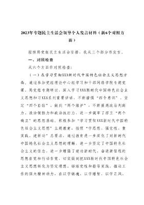 2023年专题民主生活会领导个人发言材料(新6个对照方面)按照局党组民主生活会安排,我从三个部分作发言。一、对照检查从六个方面作对照检查:(一)在学习贯彻XXX新时代中国特色社会主义思想方面。通过参加党组理论中心组学习和干部网络学院专题党课、局党组专题研讨,深入学习XXX新时代中国特色社会主义思想和习XXX系列重要讲话,不断增强四个意识、坚定四个自信、做到两个维护,不断提高政治判断力、政治领悟力和政治执行力,进一步筑牢了捍卫两个确立的思想基础。积极参加学习贯彻XXX新时代中国特色社会主义思想主题教育,按照学思想、强党性、重实践、建新功总要求,通过教育进一步深化了对新时代中国特色社会主义思想的理解,进一步坚定了中国特色社会主义的信念,进一步增强了建功新时代、奋进新征程的思想自觉和行动自觉,切实做到把XXX新时代中国特色社会主义思想转化为坚定理想、锤炼党性和指导实践、推动工作的强大精神动力,在以学铸魂、以学增智、以学正风、以学促干方面取得实实在在的成效。但也存在学不深、悟不透、与实际结合不够紧密的问题,运用XXX新时代中国特色社会主义思想分析问题、解决营商环境建设和信访积案的能力和水平还不高,需要在今后的工作和实践中不断把学习成果往深里走、往实里走。(二)在维护党中央权威和集中统一领导方面。能够不断增强四个意识、坚定四个自信、做到两个维护,不断夯实捍卫两个确立的思想基础,衷心维护党中央权威和集中统一领导。但是通过对照检视,仍存在不足和差距。一是对两个确立的逻辑把握还需进一步深化。不能有把历史、现实、未来结合起来感悟两个确立这一新时代十年最重要政治成果,没有完整、准确全面领会两个确立的历史逻辑、理论逻辑和实践逻辑二是维护党中央权威和集中统一领导还不够全面系统。虽然全心拥护XXX同志党中央的核心、全党的核心地位,拥护XXX新时代中国特色社会主义思想的指导地位,但在落实习XXX关于营商环境建设、信访维稳等方面重要论述、重要指示批示方面却做得不扎实、不到位,在协调抓好本部门营商环境落实和处理个别信访积案方面出现偏差。(三)在践行宗旨、服务人民方面。能够坚持以人民为中心的发展思想,在分管的群众工作中,认真贯彻新《信访工作条例》,在局党组全面领导下,加强形势研判常态化排查隐患,统筹组织协调,充分发挥业务优势,扎实抓好初信初访,依法化解信访积案,信访矛盾化解取得重大进展。有效化解了XXXX上访积案;按照三重新三到位要求,及时组织相关处室单位约访下访XXXX等上访群众,发挥了信访机构维稳和平安建设职能作用。经过一年的不懈努力,全系统信访稳定形势明显好转。但由于本人能力和阅力有限,加之一些信访问题持续十几年、成因复杂、矛盾交织,在处理群众来访问题时也出现了一些负面影响。比如,在接待XXXXX信访问题时,导致其在媒体上炒作,造成一定的不良影响。(四)在求真务实、狠抓落实方面。一年来,在我负责的法规处和群工处工作中,求真务实、狠抓落实,圆满完成了各项任务。着力协调推动,在相关领域营商环境建设上取得较好成绩;按照市领导部署,组织完成XXXXX(草案)起草;完成本系统常用法律法规及政策文件汇编;带领群工系统的同志攻坚破难,化解了一系列积案难案,确保了信访稳定。但由于XXXXX工作涉及范围广、协调难度较大等原因,出现了个别工作协调不顺、应诉败诉较多、个别疑难信访积案始终得不到有效化解等问题,需要在今后工作中加大工作力度、进一步抓好落实。(五)在以身作则、廉洁自律方面。能够严格执行廉洁自律准则,在相关行政工作中,认真听取有关处室单位意见,凡事拿到会上说,集体讨论研究;遇到重点问题,能及时组织相关单位提出初步意见,交局决策会讨论决定认真执行法律法规和政策规矩,注重以实际行动带动和影响所属处室廉洁从政。坚持一把尺子量长短,不搞拉关系走后门、请客送礼,对服务对像不搞远近亲疏,营造了有利于本职工作开展的良好环境。坚持对分管职责范围内的工作经常分析廉政风险,制定防范措施,做到常提醒、常督促、常教育,定期向纪检监察部门汇报工作情况,并运用微信、公文处理系统等信息手段不失时机地搞好廉政教育引导,做到警钟常鸣。但有时也放松自身廉洁自律要求如在接待上级来人时,也存在出于人情观念搞一些超标准接待的问题。(六)在履行全面从严治党政治责任方面。按照全面从严治党一岗双责有关要求,落实本级责任,筑牢廉政底线。注重发挥党组织生活党性强、互动性强的作用,在党组织生活中积极宣传优秀党员先进事迹,以案说法搞好反面典型警示教育,通过思想交流强化党员先锋队意识结合职能开展四个意识教育、两个维护教育和形势任务教育,坚持严字当头,常抓不懈,做到工作职责和掌握的权力管到哪里,就把党风党纪建设延伸到哪里但由于思想上重视程度不够,在履