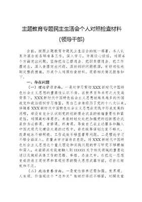 主题教育专题民主生活会个人对照检查材料(领导干部)会前,按照主题教育专题民主生活会的统一部署,本人认真开展会前各项准备工作,深入学习,开展谈心谈话,对照6个方面突出问题,坚持把自己摆进去、把职责摆进去、把工作摆进去,深入查摆突出问题,深刻剖析问题根源,有针对性地制定整改措施,形成个人对照检查材料。现将相关情况报告如下。一、存在问题(一)理论学习方面。一是对学习贯彻XXX新时代中国特色社会主义思想的重要性认识不清。在世界百年未有之大变局背景下,XXX新时代中国特色社会主义思想被越来越多的外国政党和政治组织学习借鉴,而自己亲身经历了党的十八大以来,伴随着XXX新时代中国特色社会主义思想在实践中形成发展的历程,却没有充分认识到党的创新理论武装的极端重要性和紧迫性,对照高标准要求,未能时时处处把加强党的创新理论武装作为必修课、首修课、终身课,导致自己在主动服务和融入中国式现代化建设大局的过程中,存在统筹谋划力度不够大、改革破冰不够积极、工作成效不够显著等问题。二是理论学习不够全面深入。在重点学方面存在差距,对XXX新时代中国特色社会主义思想这个重大理论和实践问题的学习研究不够精细和深入,未能将其有效地融入到XXXXXX关于相关领域的重要论述以及做好具体工作的思路、举措、办法之中,在把这一思想变成改造主观世界和客观世界的强大思想武器方面,还存在短板和不足。(二)政治素养方面。一是党性修养还需加强。世界观、人生观、价值观这个总开关有时拧得还不够紧,对照先辈先进,自己未能模范践行对党忠诚,积极工作,为共产主义奋斗终身的入党誓言,有时没有把坚定的政治信仰作为人生的首要课题,思想上存在种好自己的责任田,干好自己的一摊活,过好自己的小日子的狭隘思维,缺乏国之大者的政治意识,在坚决做中国特色社会主义共同理想与共产主义远大理想的坚定信仰者、积极倡导者和忠实实践者方面,还有一定差距。二是政治站位不高。从政治上观察、思考、解决问题的习惯尚未完全形成,与党章党规对标对表,实事求是讲,自己在时时处处事事讲政治方面有差距,特别是在日常生活中,一言一行不够严谨,没有完全做到遇事多想政治要求、办事多想政治规矩、处事多想政治影响、成事多想政治效果。在谋划工作和处理问题上,国之大者的政治意识不足。(三)能力本领方面。一是自我革命不足。革故鼎新的政治勇气锤炼得不够积极、深入和高效,缺少仰面朝天的自我审视,以及提针引线的自我修正,导致未能把自我革命精神贯穿于工作的各个方面和全过程,也没有时时刻刻保持昂扬向上的改革创新精神,进而影响了工作成效。二是满足群众诉求和需要的措施不够有效。在推进中国式现代化建设的进程中,自己未能完全适应和掌握当前的新形势、新任务、新要求,对于时代潮流下干部群众的思想观念、行为方式、价值取向,缺少准确的认知、把握和判断,做群众工作的能力和方法已经不能满足新时代的要求。(四)担当作为方面。一是调查研究存在薄弱环节。未能充分发挥出调查研究的纽带与桥梁作用,自在开展调查研究时,对标对表XXX新时代中国特色社会主义思想和党中央重大决策部署不够及时和全面,一些调研方向准度不够、调研内容新度不够、调研成果转化不够,导致自身对迅速变化的客观实际了解不深、感知不真。二是工作落实上还需下功夫。在推动工作高质量发展过程中,对过程管控不够严实,督促检查方法不够有效,有时通过留痕和台账检验干部的工作作风和工作实绩,搞周调度、日调度,导致一些干部忙于交差、疲于应付,甚至搞花架子,没有把全部心思和精力真正用在研究解决具体事上,一些工作未能实现事半功倍。(五)工作作风方面。一是自我反省的精神缺乏。经常体检不够全面,清除锈点不够彻底,在处理公私、义利、是非、俭奢、苦乐、得失等关系时,不够科学、均衡和有效,自身的权力观、地位观、利益观有虚化弱化的现象。二是自律表率发挥不够。对一些具体的人、具体的事没有严格要求,对履行一岗双责、落实全面从严治党两个责任极端重要性的认识不够到位,压力传导不够,责任意识逐层递减,红红脸、出出汗还没有成为常态。(六)廉洁自律方面。一是从严治党还需下功夫。有很多工作想到了,看到了,也安排布置了,但在抓落实上有所不足,平时工作一忙,就把大量的时间和精力投入在事务性工作中,没有狠下功夫去加强作风建设的过程监管。二是党风廉政建设还需抓实抓细。有事,对党风廉政建设的长期严峻形势认识还不够深入,注重业务工作多,党的廉政建设工作预防做的少、工作部署少。对一些风险隐患警钟敲得多,缺乏督查和跟踪问效,对各级党组织党风廉政建设抓的不够。二、问题产生的原因分析一是党的创新理论研究不够深入。对党内理论的学习缺少内生动力,存在为完成学习任务而学习的思想,对理论知识的理解和运用还没有上升到相应高度,思考问题没有上升到理论层面,也没能用学到