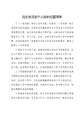 民主生活会个人剖析问题清单1.一岗双责落实上还有差距。对落实一岗双责缺乏更有针对性的措施,没有把党风廉政建设与自身业务工作放在同等重要的位置,执行各项纪律还不够严格,对部分科室干部监督教育失之于宽、失之于软。比如,对班子成员安排工作中安排部署,轻抓督促落实,致使部分存在工作虎头蛇尾的情况,整体上影响了工作的成效。2.理论学习力度不强。能够深刻地认识到学习的重要性,但由于平时忙于业务过多,主动学习不够经常,被动应付学习多,重点精读少,满足于过去的经验,没能做到学深悟透、融会贯通比如,在面对财政、项目、规划等专业性强的工作,自我学习力度不强,政策理论支撑不足,在高质量推动工作上还有较大差距3.工作创新举措不多。容易满足于工作现状和已取得的成绩习惯用传统的思维处理实情,对标新方法、新理念的意识不组。比如,在分管工作中,只是在前期推进基础性工作上做的充分,对在推进工作中遇到的难题,考虑的不全面,思考的不充分,到时后期解决推进的缓慢。4.党建责任落实有差距。班子成员在推动分管部门履行党建责任方面还有欠缺,在开展工作中,有的科室存在重业务轻党建的情况,没有很好地做到把业务工作与党建工作融合开展。比如,班子成员把较多地精力放在了谋划推动业务工作上,在党建工作方面投入精力不足,致使有的部门党建责任落实不到位。5.监督管理不够严格。传导的压力不足,有时存在掩盖矛盾的情况,缺少对分管部门的监督和指导,对出现的问题,也只是简单一说了之。比如,有时监督失之于软,部分可以规避的问题未能得到有效制止,致使工作的成效大打折扣。6.党性修养不坚定。工作中认为自己工龄长、经验多,受党教育充分,党性修养站位较高,也得到了群众居民的认可及组织的信任,工作中未出现偏差,因而对加强党性修养方面重视程度有所放松。比如,在处理复杂问题期间,考虑问题中有时存在本位主义,站在大局的角度上思考不深,在与时俱进、解放思想方面考虑不全面,创新思维与新形势还有一定差距。7.自身党性修养不坚定。工作中存在批评与自我批评运用还够不主动、氛围不浓厚,经常以自己工作经验丰富认为不会出现问题。比如,与班子之间工作交流较多、谈心谈话不足,批评和自我批评的不够经常,没有真正达到红红脸、出出汗的效果8.制度执行还有差距。在制度落实上以身作则不到位,认为党员干部能够主动自觉遵守,没有经常督促要求落到实处。比如在单位考勤方面,有时自己因工作忙,未及时签到,在表率上面做的还不到位。9.为民服务意识有所淡化。服务居民群众的自觉性不足,没有把群众最急、最盼、最难的问题铭记于心,对打基础、管长远的工作重视程度不够,对事关群众切身利益实情关注不多,落没有把维护和发展群众利益作为最根本出发点和落脚点。比如,在深入基层调研时,只是简单询问存在问题,没有真正深入居民中发现解决问题,为民服务的意识还不足。10.攻坚克难的精神不足。开展工作过程中,有时干事创业的锐气、一抓到底的魄力有所弱化,对工作的要求逐渐放松,特别是碰到棘手的工作时候,存在等靠要的思想,缺乏攻坚克难的志气、敢闯敢试的锐气。比如,在工作中遇到的急事难事,考虑不够全面,有时只是交给分管领导去处理,自己也只是在事后听听汇报,想想办法。11.工作作风不够扎实。开展工作中作风建设问题依然存在,特别是领头雁作用发挥不明显,党建引领作用不充分,推动基层党建工作质效提升有欠缺,干部监督管理不到位,抓常抓早上做的还不具体。比如,在包联的县市,只是有工作任务时候深入开展,平时只是打打电话,问问情况,不能做到亲力亲为的督促具体工作。12.对分管部门日常监督不经常。对单位监督责任压得不实,对一把手的管理不到位,未经常对分管单位行党风廉政建设主体责任进行监督检查,廉政约谈使用率不高,对在新形势下如何结合实际抓好落实思考谋划不够,长管长严方面还有欠缺。比如,对于分管的部门,出现差错,往往蜻蜓点水的处理,把问题点了就认为批评了,在深入抓、持续抓上用劲不足。