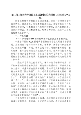 第二批主题教育专题民主生活会对照检查材料(对照新六个方面)根据主题教育专题民主生活会要求,在前一阶段理论学习调查研究、推动发展、检视整改的基础上,我紧密联系个人思想和工作实际,认真撰写个人检视剖析材料,深入查摆问题、深刻剖析原因、提出整改措施、明确努力方向,现将个人检视剖析情况报告如下。一、存在问题(一)学习贯彻XXX新时代中国特色社会主义思想方面。一是学习贯彻XXX新时代中国特色社会主义思想不全面深刻。虽然通读了学习书本和资料,也参加了集中学习和交流研讨,但是在学懂、弄通、做实上还不够。对党的基本理论、基本路线、基本方略的内在关联性认识不深,对其如何指导实践、推动工作缺少思路和方法。存在为了理论学习而学习,起不到理论指导实践的应有效果,没能将所学的理论知识完全运用到工作中去。二是在学习贯彻上尚有不足。学习方法不够科学有效,学习创新理论往往注重知其然,而忽视知其所以然,不善于从政治上分析、考量和解决问题新问题,理论学习成果与提升政治能力未实现同频共振。如,对于上级谋划的重大战略、制定的重大政策、部署的重大任务,往往只能读懂字面意思是什么,只局限于按照规定动作贯彻落实。对于背后的逻辑为什么,要达到什么样的目标,以及政策举措具有的综合性、前瞻性,缺少全面系统把握的政治能力,只能从技术路线把握发展方向,存在对老经验、老办法的路径依赖,缺少包含专业路径的政治站位,导致一些工作跟不上节拍,踩不准节奏,未能及时打造出有亮点的自选动作,这成为了制约工作高质量落实的瓶颈。三是思想认识没能够与时俱进,不能很好地顺应形势变化面对当前新形势、新挑战,反应还不够迅速,在应对市场变化下的决心还不够大,抓业务升级的力度还不够强。如在建筑行业新型管理模式下的内控体系建设比较滞后,缺少前瞻性,在党建引领、绿色发展的理念落实上举措还不够。(二)维护党中央权威和集中统一领导方面。一是贯彻落实上级组织决策部署还需加强。对于企业高速发展信心十足,但落实上级决策部的署效率和质量有待加强,存在重安排部署,缺少督查落实的情况。在创新发展上,主动谋划新方法、新举措、新思路不多,导致一些工作推动起来各部门习惯按部就班,效果不突出、特色不够亮、招数不够多、力度不够大。在人员队伍建设上,管理人员培养开发上以及价值提升上的措施和方法还不够多。对于企业两金不断增长、降杠杆工作推进困难,对企业生产经营面临的困难,深入研究不够、倾心服务不够。二是对两个确立的认识不足。虽然已经入党多年,但是政治素养方面还不够高,政治判断力、政治领悟力、政治执行力不够强,对两个确立中的理论逻辑、历史逻辑和实践逻辑,未能完全做到知行合一。从综合统筹协调以及为省领导参谋辅政工作中体现政治导向、政治要求做得还不到位。三是对党建引领落实还不够细致。政治机关意识树得还不够牢,还存在思想认识误区,对于分管处室的党建工作责任链条拧得不紧、业务和党建融合不够,对于支部组织生活会质效提升没有明确严的标准,存在两层皮的情况。(三)践宗行旨、服务人民方面。一是斗争精神不足。在新时代的重大挑战、重大风险、重大阻力、重大矛盾的伟大斗争中,自己有时缺少在复杂严峻的斗争中经风雨、见世面、壮筋骨的韧劲,以及凡事冲锋在第一线、战斗在最前沿的冲劲,不愿意当热锅上的蚂蚁,接烫手山芋,历史主动精神有所欠缺,接受思想淬炼、政治历练、实践锻炼、专业训练的主动性不够强,斗争本领养成不够充分和全面,有时在乱花渐欲迷人眼的复杂形势中,斗争的时、度、效把握得不够科学。二是应对风险的意识欠缺。面对数字化、网络化、智能化快速发展给风险防范带来的新特征,自己研究、把握事物发展总体趋势和方向的能力不足,对一些已经暴露的风险点的成因、特征和演化趋势认识不清、把握不准,做不到见微知著、一叶知秋;对一些尚未出现的风险,缺少防范化解风险的预见性和前瞻性;在将风险挑战转化为发展机遇、催生新的发展动能方面,还不够科学有效。(四)求真务实、狠抓落实方面。一是为民服务宗旨树立不牢。工作重心大多放在综合协调、业务指导上,对于正确政绩观认识不够深入,唯上不为下的风气没有根本扭转,深入实地指导也都大多到达实地现场,但是深入基层、面对面与百姓交流次数较少,对基层群众所思所盼了解不够深入。仅仅按照上级要求调研次数完成规定动作,由于调研时间较短,调研方向不准,导致调研质量并不高,通过调研深入发现群众急难愁盼问题,做得还不够到位。二是动真碰硬的劲头不足。随着年龄的增长,干事创业的劲头不足,有着瞻前顾后,求稳怕乱、思前想后的顾虑,认为工作永远也干不完,有了歇一歇、等一等的想法,有了少干事、不出事的倾向,导致领导交办事项的督办落实未完全形成多跨协同、闭环落实的工作机制。三是引领作用发挥不力。统筹作用发挥不够充分,系统性体系化抓大事谋