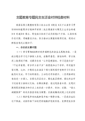 主题教育专题民主生活会对照检查材料根据县委主题教育领导小组办公室《转发《关于认真学习贯彻XXXXXX重要讲话精神开好第二批主题教育专题民主生活会的通知》的通知》要求,局党组全体班子成员围绕6个方面,认真检视存在问题,明确整改方向,努力推动主题教育取得实效。现将对照检查情况汇报如下:一、存在的主要问题(一)学习贯彻XXX新时代中国特色社会主义思想方面。一是政治理论学习还不够深入系统。在勤学善思、深钻细研、学以致用上做得还不够,还偶尔存在工作是硬指标、学习是软任务干比学重要、学多学少差不多的思想和以干带学、学用脱节等问题。比如,少数同志在浙里干部之家网络学堂的学习任务未能及时完成,学习的积极性、主动性还有待提升。二是调查研究有待进一步深入。在强化顶层设计、强化基层调研、强化外出学习交流等方面相对欠缺,在解剖麻雀、透过现象看本质、发现问题找原因的能力和方法上有待进一步提升。例如:近期,南太湖健康保相关内容咨询较为频繁,在高效解决问题上还有差距(二)维护党中央权威和集中统一领导方面。一是政治站位还不够高。对新形势下如何更好地维护党的形象、发挥党组织作用等课题思考研究还不够深,对意识形态领域的复杂性、警惕性还不够强,对网络上的消极言论抵制力还不够足。二是贯彻落实成效还不够好。在贯彻落实县委县政府部署要求上,对一些重要工作抓得紧,但对相对一般的工作推进落实还不够快,一抓到底的狠劲韧劲还不够。比如,xx经办服务离群众的要求还有差距,经办服务从做对向做优转变还不够迅速。(三)践行宗旨、服务人民方面。一是以大服务理念赋能xx公共服务作用发挥不够明显。虽然坚持贯彻xx服务也是营商环境xx服务也是增值待遇xx服务也是创新要素的大服务理念,但在具体工作中重管理、轻服务的思维定式还没完全转变,对大服务理念的认识不够到位、把握不够精准,有些还停留在被动提供服务的模式上,还没有真正实现从有什么给什么转变为要什么给什么。二是满足群众对xx政策的多样化需求还不够丰富。虽然能够持续深化医药服务供给侧改革不断提升老百姓xx获得感、幸福感和满意度,但面对人民群众对医疗需求越来越多样化的新情况,如何统筹提升xx待遇水平,妥善应对老龄化、疾病谱变化带来的新挑战,xx政策的深化研究还有待进一步加强。(四)求真务实、狠抓落实方面。一是开拓创新、敢于担当的意识还不够强。在谋划发展时,习惯搬本本、找条条,把思维局限于完成上级任务的框框里,改革创新的锐气不足,缺少自我超越的精气神。在推动工作时,对破解深层次矛盾、啃体制机制硬骨头的事情不愿触及、不敢担当,破解发展难题的勇气不足,与敢教日月换新天的拼搏精神相比还有差距。二是面对不断变化的新情况新问题,防范化解矛盾风险的创新性招法还不够多。尽管局党组在防范化解风险挑战上出台了一系列制度但一定程度存在事中事后化解多、事前防范研究还不够,应对可能发生风险的预案不够完善的情况。比如,从平时的信访反映、举报投诉、智慧xx数据分析等方面,预判可能产生的舆情风险和矛盾隐患的先手棋还不够超前。(五)以身作则、廉洁自律方面。一是改进作风还不严格。局党组严格落实中央八项规定及其实施细则精神,持续纠四风树新风,但会议多、文件多、检查多的状况没有得到根本性改变,没有完全摆脱转文套会的惯性思维,还存在会议开得频繁、以文件落实文件的现象,通过现场办公方式解决问题还不够。二是纪律规矩还没有完全树严挺硬。比如,在2023年的经济责任审计中抽查发现存在公务接待未当场开具发票及使用公务卡结算的情况,虽然事情发生在往年,处置在2023年,并已完成销号。但说明全局内部纪律规矩还没有完全树严挺硬,还需要在全系统持续开展作风整治,真正做到举一反三、警钟长鸣。(六)履行全面从严治党政治责任方面。一是一岗双责落实还不够到位。尽管局党组班子每月都开展了两个责任督导提醒,但推动全面从严治党向一线延伸还有差距,对党的建设督办指导还有待进一步加强,对苗头性问题事前监督和批评指正的狠劲还不够。二是廉政教育形式趋于固化。在如何丰富机关廉政教育方式、增强廉政教育效果方面,方法不多、途径不广。廉政教育上,会议强调得多,督促检查得少,在日常工作中抓一些制度的落实方面不能持之以恒,存在时紧时松的现象。二、典型案例剖析(一)案例简介xxx年,省纪委省监委通报了xx市xx中心原主任XXX案件。2020年5月至2022年1月,XXXX违反中央八项规定精神,先后X次接受被检查医疗机构安排的吃请。除此之外,XXX还顶风违纪,在节假日期间收受管理服务对象礼品。2021年中秋节前,某单位经XXX同意,送给市xx中心工作人员月饼和酸奶,每份价值XXX元。另外,XXX还违反组织要求,在子女调动过程中,利用职务上的影响为其谋取利益;严重违反