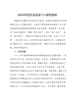 2023年民主生活会个人发言提纲根据本次专题民主生活会相关要求,我坚持以XXX新时代中国特色社会主义思想为指导,认真学习贯彻党的XX大精神,深入落实XXXXXX对XX重要讲话重要指示批示精神,深刻领悟两个确立的决定性意义,增强四个意识、坚定四个自信、做到两个维护,围绕本次专题民主生活会主题,对照六个方面,通过谈心谈话、征求意见和自己查找的方式,认真查找存在问题及不足,并逐条对照检视分析,明确了努力方向和整改措施。现对照检查如下:一、存在问题(一)学习贯彻XXX新时代中国特色社会主义思想方面。一是理论学习不全面。学习缺乏系统性、全面性,导致理论学习不深在谋划各项工作时思路不开阔、措施不够多,归根到底还是自己的理论武装不够,主观上放松了对自己学习的要求,以致于用XXX新时代中国特色社会主义思想武装头脑、指导实践、推动工作不扎实、不全面;二是学用结合上还有差距。更多的时候是把XXX新时代中国特色社会主义思想作为理论来学习,而没有深刻认识到其对指导实践推动工作的强大伟力,对其中蕴含的基本方法思维方法、工作方法等没有做到举一反三、活学活用、融会贯通面对新发展格局,还没有拿出更多管用的办法和措施,未能将理论知识贯穿到具体工作和实践中,用新知识新要求指导工作有效开展还存在不足。(二)维护党中央权威和集中统一领导方面。一是学习XXX新时代中国特色社会主义思想还不深入。领悟不够透彻,缺乏一以贯之的自觉性,在学懂、弄通、做实上功夫不够。在精读研读XXX新时代中国特色社会主义思想上下功夫不够,学懂弄通、知行合一方面还有很大差距。具体表现为虽已多次参加集中学习、专题研讨交流、撰写心得体会,但还存在被动应付学习的情况,学习的积极性和主动性不够。党坚持马克思主义同中国具体实际相结合化感悟还不深刻、对两个确立的决定性意义感悟还不深刻。二是在树立四个意识、坚定四个自信、做到两个维护上政治站位还不够高。有时放松了对自己的严格要求,在日常工作和生活中精神上有所放松、作风上有所松弛、行动上有所懈怠,对党性修养的锤炼、原则意识的秉持,认识不足、坚持不够。政治敏锐性、洞察力和判断力还有差距,辨别政治是非、保持政治定力、驾驭政治局面、防范政治风险的能力还需不断提高。(三)践宗行旨、服务人民方面。一是贯彻落实上级决策部署有差距。虽然能够坚定不移坚持以人民为中心的发展思想结合工作实际完整、准确、全面贯彻新发展理念,但在具体贯彻落实党中央和省委决策部署过程中,有时存在对上级精神领会不充分不透彻,联系自身资源禀赋不够紧密的情况。具体表现为在坚定不移推动新阶段XX事业高质量发展,锚定路线图和任务书等方面思路还不够开阔、措施还不够有力,导致一些工作缺乏特色和亮点。二是服务群众意识不牢固。在想问题、办事情上公仆意识有所下降,自身修养仍需加强。比如:在工作中,遇到蛮不讲理的,也会大发脾气并与其争个脸红脖子粗。(四)求真务实、狠抓落实方面。一是工作中存在思维受限创新意识不强。工作中存在重部署、轻落实的现象,具体表现为一些工作还是习惯于召开会议、下发文件、制定方案,在落实过程中一些工作跟的不紧、监督的不严,缺少钉钉子精神,还存在走过场、图形式、凑次数现象。二是斗争精神树的不牢。对一些小事小节能不谈就不谈,一定程度上存在好人思想。比如:对干部有时迟到、早退等情况还碍于面子装作视而不见,即便批评教育也是不疼不痒。(五)以身作则、廉洁自律方面。一是调查研究解决实际问题效果不好。与干部交流相对较少,掌握情况不够全面。结合岗位职责,虽能够紧盯工作中的热点难点和既定课题,全方位收集掌握资料,但受个人主观思维、格局视野、知识储备等因素局限文稿起草的前瞻性、预见性、针对性还不够强,指导实践、推动工作的效果不明显,对一些难点问题解决办法不多,解决实际问题的力度有欠缺。二是严于律己的标准还不够高。能够带头落实党员领导干部党风廉政建设的各项规定,注重加强个人修养,不断严格要求自己。但是发挥示范带动作用不够明显,仍然需要进一步提升标准、不断净化自我。(六)履行全面从严治党治政责任方面。政治实践缺乏担当对标新时代优秀党员干部要求还有差距,体现在:自己对党性锤炼的积极性、主动性和自觉性不够高,常常以事务工作代替党性锤炼,自我净化、自我完善、自我革新、自我提高的能力有所弱化,考虑大局、全局利益的时候少,与同志之间换位思考少,与己无关的事情过问少,落实决策部署从科室利益、个人好恶出发贯彻执行上级决策部署定力不够、韧劲不足、耐力不好,遇到困难和问题绕着走,求稳怕乱、不敢创新。四、存在问题的原因剖析(一)从思想方面看。在谋划各项工作时思路不开阔、措施不够多,归根到底还是自己的理论武装不够,主观上放松了对自己学习的要求,以致于用XXX新时代中国特色社会主义思想武装头脑、指导实