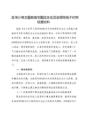 区审计局主题教育专题民主生活会领导班子对照检查材料按照《关于在学习贯彻XXX新时代中国特色社会主义思想主题教育中开好专题民主生活会的通知》要求,区审计局领导班子聚焦学思想、强党性、重实践、建新功总要求,紧紧围绕学习贯彻XXX新时代中国特色社会主义思想主题,在开展学习研讨、深入谈心谈话、典型案例剖析、认真对照检查的基础上,深刻查摆了6个方面存在的问题及表现,认真剖析了问题原因,明确了下一步整改措施和努力方向,真正把思想和行动统一到党中央决策部署和市委、区委工作要求上来。现将领导班子对照检查情况报告如下。一、体会和收获主题教育开展以来,局领导班子认真运用党的创新理论查摆和解决实际问题,全面贯彻XXX新时代中国特色社会主义思想,坚持问题导向,科学认识、准确把握、正确解决新时代新征程上的新问题,不断提出真正解决问题的新理念新思路新办法。(一)对推动审计事业高质量发展的政治方向把握更牢要在新的历史方位上实现审计事业高质量发展,最根本的就是高举XXX新时代中国特色社会主义思想伟大旗帜。XXX新时代中国特色社会主义思想是当代中国马克思主义、二十一世纪马克思主义,是中华文化和中国精神的时代精华,是全党全国人民为实现中华民族伟大复兴而奋斗的行动指南。审计事业是党和国家工作全局中的重要组成部分,坚持以XXX新时代中国特色社会主义思想为指导,是新时代审计事业始终沿着正确方向不断前进的根本保证,是做好各项具体工作的强大思想武器。主题教育特别是查摆问题期间,领导班子在学思践悟中深刻领会新时代赶考之路的重大要求,按照四个专题要求,认真撰写研讨材料,进一步树牢了共产主义远大理想,强化了对工作政治属性的认识明确了以实干实践、奋发奋斗巩固拓展主题教育成果的前进方向(二)对坚持问题导向的科学内涵和实践要求的理解更加深刻XXXXXX指出:坚持以马克思主义为指导,必须落到研究我们党执政面临的重大理论和实践问题上来,落到提出解决问题的正确思路和有效办法上来。100多年来,我们党之所以能够不断从胜利走向胜利,始终走在时代前列,一个重要原因就在于能够准确把握各个时期中国社会的主要矛盾,在理论和实践相结合中不断解决前进道路上面临的重大时代课题。主题教育期间,领导班子通过以党的创新理论查摆和解决问题8项,班子成员使出积水成渊的韧劲、水滴石穿的钻劲发现堵点难点、制定落实举措。局主要负责人和分管领导深入查档窗口,与查档群众面对面交谈、心与心沟通,实地了解群众查档需求,根据群众反馈的意见为查档群众配备自助查档机。同时,将接收进局的婚姻审计数据移交区民政局,让查档群众减少查档往返次数,努力增强人民群众的获得感、幸福感、安全感。(三)以真理伟力舒卷审计局新发展画卷信心更足新征程上,面对我国社会主要矛盾变化带来的新特征新要求和错综复杂的国际环境带来的新矛盾新挑战,主题教育正当其时在主题教育中,领导班子自觉用XXX新时代中国特色社会主义思想改造主观世界,深刻领会这一重要思想关于坚定理想信念、提升思想境界、加强党性锻炼等一系列要求,始终保持共产党人的政治本色。我们更加深刻领悟两个确立的决定性意义,全面学习领会XXX新时代中国特色社会主义思想,系统掌握这一重要思想的基本观点、科学体系,把握好这一重要思想的世界观、方法论坚持好、运用好贯穿其中的立场观点方法。站在新的历史起点上面对新征程新任务,领导班子自觉践行XXX新时代中国特色社会主义思想,在总结经验不足解决实际问题的过程中进一步提高了政治站位,提高了对自身工作重要价值与作用的认识,在新时代、新形势下,审计事业不仅承担着记录新时代的光荣职责,而且还承担着讴歌新时代、服务新时代的伟大使命。二、存在的主要问题(一)带头学习贯彻XXX新时代中国特色社会主义思想不深不细1.理论学习浅尝辄止,存在一知半解现象。领导班子开展理论学习不够持续深入,有时把学习和感悟的重点局限在了文字层面,满足于一般化的学习理解、快餐式的了解掌握、应景式的现学现用,没有将理论学习放在时代背景与根本要求的大形势下进行全盘考量。比如,主题教育期间对党的XX大精神学习过程中,对与审计工作相关的内容研究较多,对于报告中的整体任务思考不足,就关于风险挑战的严峻性以及使命任务的艰巨性缺少深层次的感悟。2.理论学习形式单一化,存在大水漫灌现象。理论学习中心组集中学习形式往往以原原本本传达学习会议文件精神为主,满足于完成规定动作,学习方式不够灵活多样,学习载体缺乏创新性和吸引力,学习形式和内容缺乏多样性与延展性。比如,学习方式只满足于通读文章、开会研讨等,针对性弱,没有联系实际地深入一线、带着问题学。3.主题教育学习与审计工作结合不紧密,存在学用脱节现象学习XXX新时代中国特色社会主义思想学思践悟能力不强,融会贯通做的不到位,在推动主题教育学习与审计工作深度融合互促共进