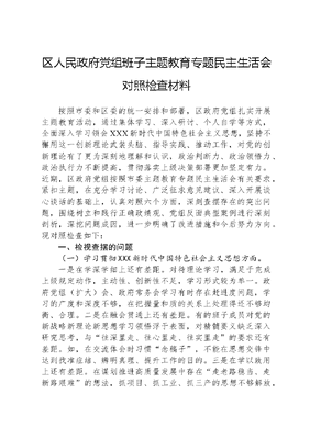 区人民政府党组班子主题教育专题民主生活会对照检查材料按照市委和区委的统一安排和部署,区政府党组扎实开展主题教育活动,通过集体学习、深入研讨、个人自学等方式,全面深入学习领会XXX新时代中国特色社会主义思想,坚持不懈用这一创新理论武装头脑、指导实践、推动工作,对党的创新理论有了更为深刻地理解和认识,政治判断力、政治领悟力、政治执行力不断提高,贯彻落实上级决策部署更加坚定有力。近期,区政府党组按照市委主题教育专题民主生活会有关要求,紧扣主题,在充分学习讨论、广泛征求意见建议、深入开展谈心谈话的基础上,认真对照六个方面,深刻查摆存在的突出问题,围绕树立和践行正确政绩观、党组反面典型案例进行深刻剖析,深挖问题成因,进一步明确了改进措施和今后努力方向。现对照检查如下:一、检视查摆的问题(一)学习贯彻XXX新时代中国特色社会主义思想方面。一是在学深学细上还有差距。对待理论学习,满足于完成上级规定动作,主动性、创新性不足,学习形式较为单一。政府党组(扩大)会、政府常务会学习有时存在赶进度问题,学习的广度和深度不够,在把握量和质的关系上处理得还不够均衡、合理。二是在融会贯通上还有差距。有的班子成员对党的新战略新理论新思想学习领悟浮于表面,对精髓要义缺乏深入研究思考,与往深里走、往心里走、往实里走的要求还有差距。如,在交流体会时习惯念稿子,不能在思想交锋中达到找准症结、辨明真理、提升工作的目的。三是在学以致用上还有差距。在谋划推进高质量发展中存在走老路稳当、走新路艰难的想法,抓项目、抓工业、抓三产的思想不够解放,思路不够开阔,突破性的实招大招不多,特别是面对新的机遇和挑战时,用新思想来指导实践、推动工作的能力尚显不足。(二)维护党中央权威和集中统一领导方面。一是贯彻党中央重大决策部署在落细落小落地上有差距。对XXXXXX重要讲话、指示批示精神和党中央重大决策部署研究不够深透,还没有完全做到融会贯通。比如,在谋划推动x高质量发展思考上,切入点和落脚点找得还不够精准,特别是农业科技成果就地转化未能形成产业化项目,有示范引领,但经济效益不明显,实践结果与上级要求还有差距。二是意识形态工作需进一步抓实。党组及成员对新时期意识形态领域的严峻形势、复杂局面以及隐蔽特点认识还不够深刻,定期专题研究、统筹协调督导还不够,对不当言行及时发声亮剑还不及时、不经常。(三)践行宗旨、服务人民方面。一是在增强群众生活福祉上做得还不够。民生优质资源总量不足、配置不均衡问题依然突出,在社会养老、托幼、教育、环保等方面还存在短板弱项,与群众的幸福期待还有一定差距。比如,在秋冬季大气污染防治方面,查找问题根源、科学精准防治的有效方法和措施还不多。二是调查研究的实效性仍需提升。党组成员深入基层开展调研不够经常,有时存在以工作检查替代问题调研的情况,到街道、村(社区)检查指导提要求较多,与镇村干部交流多,与普通群众沟通少,在坚持问政于民、问需于民、问计于民方面做得还不够到位。(四)求真务实、狠抓落实方面。一是干事创业的思想还不够解放。我区经济发展面临着优质税源培植不足、财政收支严重不平衡等亟待解决的众多问题和矛盾,需要我们不断拓展思路、创新思变,持续用力、久久为功去突围破局。比如,虽然我区今年的各项经济指标增长还不错,但经济结构并没有实质改变,工业增长乏力、现代农业效益不高等问题依然存在。二是狠抓落实的韧劲还不足。抓工作存在重部署、轻问效,没有形成闭环,上紧下松虎头蛇尾等问题不同程度存在。比如,部分工作安排部署后,督导和跟踪问效没有跟上,工作压力传导不到位,导致执行力层层打折、工作落实有差距。三是攻坚克难的锐气还不足。对于影响经济社会发展的涉及面广、情况复杂、需综合发力解决的重点难点问题,迎难而上趟新路的勇气不够,破解难题的新举措不多。比如,国有资产资源盘活利用、老旧大棚提升改造等硬骨头问题推进仍不理想、效果不明显。(五)以身作则、廉洁自律方面。一是作风建设仍需进一步强化。党组成员在转作风上坚持得还不够。比如,开展检查调研没有严格做到四不两直,往往还是提前通知、安排点位、听汇报;有时工作集中推进,多个成员同时段交织开会,基层干部疲于赶场、负担重。二是一线工作法践行力度还不够。在现场解决问题、推进工作的方法运用上还有不足,对有些能现场协调处理,或现场推进效果更好的工作难点问题,存在会议讨论研究安排布置落实的情况。(六)履行全面从严治党政治责任方面。一是主体责任落实不够坚决有力。党组在抓经济促发展等方面倾注的时间精力多,在抓好党建方面存在安排部署多、检查问效少的问题。班子成员还存在重业务轻党建的现象,相比项目建设等重点工作,对分管领域部门党风廉政建设工作指导少,跟踪问效少。二是监督管理还不够严格。落实党风廉政责任制的抓手还不够具体,监督监管的要求还不够细
