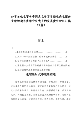 处室单位主要负责同志在学习贯彻党内主题教育精神读书班结业仪式上的交流发言材料汇编(5篇)目录1.履职新时代奋进新征程.22.用好六个必须坚持的世界观和方法论..53.坚守为民情怀处理好三个关系..94.聚焦根本实干笃行推动劳动保障监察工作再上新台阶125.凝心铸魂学思想勠力同心建新功16履职新时代奋进新征程厅党组开展这次主题教育读书班,非常及时、非常必要,充分体现了鲜明政治站位、高度政治自觉和强烈政治担当。通过x天的集体学习,共筑信仰之魂、共强理论之基、共固纪律之严、共树担当之责,厅党组全面系统的教学安排,名师大家精彩纷呈地讲授,使我学有所得、学有所思、学有所进。概括谈三点学习体会。一、坚持以学铸魂,坚定了信念、强化了武装。通过全面系统深入学习XXX新时代中国特色社会主义思想,加深了我们对其丰富内涵、科学体系、精神实质、实践要求的理解。在深学中感悟人民领袖的核心作用,更加坚定了思想认同、情感认同、实践认同;在深学中感悟科学理论的实践伟力,更加坚定了持续强化理论武装的政治自觉;在深学中感悟初心使命的历久弥坚,更加坚定了践行人民至上的思想自觉;在深学中感悟伟大建党精神的崇高伟大,更加坚定了赓续红色血脉的行动自觉;在深学中感悟自我革命的鲜明品格,更加坚定了落实全面从严治党要求的信心和决心。二、坚持以学增智,明确了职责、强化了使命。职业能力建设关系民生,关乎发展。XXXXXX强调,技能人才是支撑中国制造、中国创造的重要力量,对技能人才和职业教育作出一系列重要指示,党的XX大首次以深入实施人才强国战略为题,将大国工匠、高技能人才列入国家战略人才。倪岳峰书记、王正谱省长向全省首届职业技能大赛亲致贺信,提出明确要求和殷切希望。通过这次学习,我从战略和全局的高度,更加深刻地认识到了党中央作出人才强国战略部署的重大意义和时代背景;更加深刻地认识到做好职建工作,对于促进高质量充分就业、扎实推进共同富裕的重要作用,增强了做好工作的自觉性和主动性。三、坚持以学促干,把准了方向、增强了动力。新时代党和国家事业之所以能够取得历史性成就、发生历史性变革,根本原因在于XXXXXX作为党中央核心、全党核心的领航掌舵,在于XXX新时代中国特色社会主义思想的科学指引。就职建工作而言,我们深入贯彻落实XXXXXX致首届全国职业技能大赛贺信精神,成功举办了全省首届职业技能大赛,短短x天时间,吸引x.x万人现场观摩,直播观看超过xxxx万人次,网上阅览量达到x.x亿人次;深入实施职业技能提升行动,全省技能人才总量达到xxxx.x万人,高技能人才xxx.x万人。中华技能大奖获得者、全国人大代表李征说,我们技术工人赶上了好时代!国家和省出台的系列政策,为我们走技能成才、技能报国之路提供了保障。所有的这些,都凝结成我们履职新时代、奋进新征程的不竭动力,激励着我们不断前行。XXXXXX强调,征途漫漫,惟有奋斗。我们将以学习贯彻XXX新时代中国特色社会主义思想主题教育为契机,进一步学思想、强党性、重实践、建新功,不驰于空想,不骛于虚声,以忠诚履职、奋斗搏击回报组织的信任期待,加快推进技能强省行动。用好六个必须坚持的世界观和方法论厅机关主题教育读书班,安排紧凑、环环相扣,既有理论学习、又有实践结合,既沉下心学、静下心悟,又互动交流、碰撞思想,从淬炼思想到实干笃行,受益匪浅、很受启发。一是强化了理论武装,增进了对党的创新理论的政治认同、思想认同、理论认同、情感认同。二是淬炼了党性修养,夯实了忠诚捍卫两个确立、坚决做到两个维护的思想根基。三是明晰了工作思路,找准了劳动关系工作的重点任务、做好工作的方法路径。四是鼓足了拼搏干劲,激发了攻坚克难、干事创业的强大动力。下面,从如何用好六个必须坚持的世界观和方法论,不断推进劳动关系工作高质量发展,汇报几点认识和体会。一、站稳人民至上的价值立场坚持人民至上是贯穿XXX新时代中国特色社会主义思想的一条红线。我们党在革命、建设、改革各个历史时期,都紧紧依靠人民推进党和国家事业,始终站稳人民立场、把握人民愿望、尊重人民创造、集中人民智慧,取得了一个又一个胜利。我们要始终把人民利益摆在至高无上的地位,让改革发展成果更多更公平惠及全体人民,朝着实现全体人民共同富裕不断迈进。劳动关系工作要站稳人民至上价值立场,把解决广大劳动者最关心、最直接、最现实的利益问题作为根本出发点和落脚点,深入开展和谐劳动关系创建活动,加强企业劳动用工指导服务,推进电子劳动合同建设,扩大集体协商覆盖面,维护好劳动者合法权益,切实增强人民群众的获得感、幸福感、安全感。二、把准自信自立的三个维度坚持自信自立是XXX新时代中国特色社会主义思想的鲜明特质。从理论、历史、