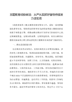 主题教育经验做法:从严从实抓好督导持续发力促实效*高度重视第二批主题教育指导督导工作,采取一系列措施强化督导实效,坚持把巡回督导作为高质量开展主题教育的有效抓手和推进引擎,将推动整改整治作为督导工作的重中之重,定期调度推进、定期分析部署、定期督促检查,切实以解决问题的实际成效让职工群众感受到主题教育带来的新气象新变化。一、抓实选优配强力量结合集团各类业务特点、党组织和党员分布等实际情况,多次研究工作机构方案,集团层面做到机构不撤、力度不减,持续加强统筹协调、沟通联络、宣传引导、整改深化;按区域组建4个巡回督导组,党群工作部、人力资源部、纪检监察组、党组巡视办公室主要负责人担任巡回督导组组长,选调20名政治素质好、工作经验丰富、工作能力强、责任意识强的党员干部担任督导组成员,确保督导工作有力有效。将遍布全国339个城市1054个区县的所有点位分到各督导组,将督导流程区分为启动筹划、实施推进、总结评估三个阶段,将督导工作细化为12项内容,确保督导区域全覆盖、督导要求全通透、督导任务全落实。通过召开巡回督导工作培训会,传达学习《关于认真学习贯彻XXXXXX重要批示精神把学习推广四下基层作为第二批主题教育重要抓手的通知》《关于认真学习贯彻XXXXXX重要讲话精神扎实开展第二批主题教育的通知》《关于认真学习贯彻XXXXXX重要讲话精神高质量开展第二批主题教育的通知》要求等,精准把握中央要求,确保贯彻落实中央部署要求不打折扣。组织各巡回督导组成员进行分享交流,详细介绍在第一批指导工作中形成的工作法、过程评价法等有益经验,为做好第二批巡回督导工作打牢基础。制定印发《巡回督导党组织信息表》《巡回督导组工作安排》《巡回督导组工作检查表》等,涵盖工作职责、纪律要求、领导讲话精神、重要会议精神等内容,为巡回督导组工作提供明确的行动指南,建立工作例会制度,定期分析研判进度成效,定期总结交流工作经验,全级次、贯通式加强对第二批主题教育的研究谋划和督导推动。二、抓实多维分类指导充分借鉴运用第一批主题教育成功经验,坚持同第一批主题教育衔接联动,创新方式方法,建立健全全链条工作机制,明确各项目标任务的时间节点、具体步骤,为第二批主题教育提供更优的方法路径、更好的办法举措,全程全力保障第二批主题教育质量和效果。针对第二批主题教育单位范围广、类型多、数量大的特点,结合三、四级单位实际,加强分层指导,区分集团党组、子公司党委、区域管理公司党委、三级公司和基层党组织及基层党员、团员青年,分别明确不同任务和要求,提高主题教育指导针对性,推动着力解决政策落地、强化内部治理、办实事解难题、化解各类矛盾、处置历史遗留问题、建强基层党组织等方面突出问题;加强精准指导,针对3种党组织类型、8种经营业态和3种业务特性,以及各单位自身所处行业属性、资产禀赋、为军保军任务等不同特点,提出主题教育精准把脉靶向治疗一企一策要求,激活基层最强大脑、实现脑洞大开,促进基层主动寻根问策、量体裁衣,防止搞万能钥匙全面通吃;加强宣传指导,深入宣传XXXXXX关于主题教育系列重要讲话和重要指示批示精神,深入宣传党中央部署要求,用好融通自有新媒体矩阵,及时传递党中央声音,全面反映主题教育工作进展和成果成效,主动对接联动中央主流媒体,形成强有力的宣传舆论态势;加强典型指导,既认真抓好中央第22巡回指导组联系点,又通过督导过程中调阅资资料、下沉现场检查、列席相关学习活动等,深入挖掘、培养基层开展主题教育的好经验好做法进行宣传推广,推动实现一花引来百花红。三、抓实现场督导检查坚持督促指导严、节奏把控严、工作要求严,对全国31个省(市、区)、102个城市的四级单位以上党组织实现督导全覆盖,每月推进一轮督导,确保一个党支部不漏。坚持做到每次督导有方案、实施有计划,每次现场检查有实效、每个片区有讲评,每次发现问题有反馈、返回有报告,实现全覆盖、按进度,每次督导检查有纪律,以督导工作的高质量,确保主题教育检整视改扎实推进。10月16日至30日已对10个省、市的226个三、四级单位党组织实施了第一轮督导,开展第一轮督导前,各巡回督导组坚持贯穿问题导向,全程直击问题、发现问题,研究问题、解决问题;注重发现典型,既发现总结好的经验做法宣传,又用反面典型以警效尤;突出指导帮带,带着真情、真感,既点问题又教方法,既面对面又手把手,以真督实导督出真感情、导出真成效。围绕7个方面22项内容通过座谈会、个别访谈、调阅资料等方式全面了解各单位主题教育开展情况。结合地理区域实际情况,召开片区点评会,进行逐一点评通报,逐一面对面反馈意见,共同研究整改措施,做到同题共答、同向发力,确保导在点子上督在关键处。特别强调对第二批查摆的单靠自身难以解决的问题,明确要主动认领、协调解决;对表