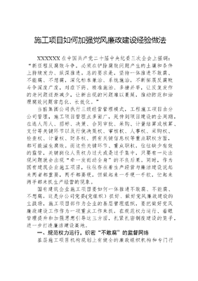 施工项目如何加强党风廉政建设经验做法XXXXXX在中国共产党二十届中央纪委三次全会上强调:新征程反腐败斗争,必须在铲除腐败问题产生的土壤和条件上持续发力、纵深推进。总的要求是,坚持一体推进不敢腐、不能腐、不想腐,深化标本兼治、系统施治,不断拓展反腐败斗争深度广度,对症下药、精准施治、多措并举,让反复发作的老问题逐渐减少,让新出现的问题难以蔓延,推动防范和治理腐败问题常态化、长效化。当前集团公司执行三级经营管理模式,工程施工项目由分公司管理,施工项目管理点多面广,延伸到项目建设的全周期,在选人用人、招标、决策、合同审批、采购、计量结算或核算、支付等关键环节以及行使决策权、审核权、人事权、采购权、检查权、计量权、财务权、拥有关键信息权等重点职权方面,都可能滋生腐败。而这些关键环节、重点职权,往往缺少有效的监管,关键岗位人员权力过大或是过于集中,只要有一处出现问题就会出现牵一发而动全身的不良后果。同时,作为国有建筑企业施工项目,往往存在着生产经营与廉洁建设说起来两者都重要,两手都要硬,但做起来一手硬一手软,忙起来两手都来抓生产经营的现象。国有建筑企业施工项目要如何一体推进不敢腐、不能腐、不想腐。这是分公司党委(党组织)抓好、做好党风廉政建设的主战场,施工项目部作为企业的基层管理组织,要把做好党风廉政建设工作作为一项重点工作来抓,在规范权力运行、着眼管理提升和加强思想引导这三方面,扎紧扎密制度建设的笼子,进一步打造廉洁建设高地。一、规范权力运行,织密不敢腐的监督网络基层施工项目机构规划上有健全的廉政组织机构和专门行使监督职责的监督人员,但这些机构或人员往往存在有名无实或名不副实的情况,没能真正发挥出监督作用或不知道如何发挥监督作用;有的项目风险防控主要围绕领导干部、重点部门和关键岗位开展,一般性岗位人员还未纳入、领导干部家属廉洁风险防控还是薄弱部位,班组对项目人员廉洁建设的反向影响监督(评估)还不够;有的项目只是把廉洁风险防控当作一般的廉洁教育工作,没有上升到有助于从业风险防范、权力运行规范、管理效益提升和保证干部、职工成长安全等高度上来认识,从而缺乏整体联动的工作机制,存在对上级不敢监督(不敢说)、同级不便监督不愿监督(不便说)、下级不能监督(不想说)、或者监督形式大于实质内容等问题,在出现问题后,相互遮掩或推责的现象比较普遍。权力运行的过程中,监督必不可少。作为施工项目,要加强对关键部门、重点岗位廉洁风险的识别,着眼重点人员、关键环节制定相应的监督措施,对症下药堵塞能够发生廉洁风险、滋生腐败的漏洞。同时,兼顾对一般性岗位人员的日常教育,加强对身边人的管理约束,做好对班组的廉洁文化宣教,进一步打造全方位穿透式的监督网络。(一)强化项目内部监督。项目党支部充分发挥全面从严治党主体责任和全面监督职责,在推动党风廉政建设与项目生产经营深度融合的同时,强化对权力运行的监督制约。项目书记要履行第一责任人责任,严格监督、严格管理、严格教育,项目经理及其他班子成员要履行项目管理责任和党风廉政建设一岗双责,算好政治账、经济账、综合账,相互监督提醒,搭好廉洁台;各部室、科室、负责人要充分履行管理职能,加强对分管人员的教育和监督,经常性与员工开展谈心谈话,对苗头性、倾向性的问题及时提醒,惩前毖后、治病救人,种好廉洁责任田。项目纪检监督员(纪检委员)要充分履行监督职责,协同做好项目干部员工的日常教育管理,提高干部员工的党性修养、思想认识;制定廉洁风险防控自查文可居文库——海量学习资料,手机电脑下载www.wenkeju.com清单,每季度组织开展一次监督检查和风险排查,堵漏洞、防风险、促提升;充分调动广大干部员工参与监督的积极性,让监督真正在项目落地,形成全员监督的良好氛围。(二)强化内外协同联动。加强与业主单位、属地政府的合作,开展廉洁共建。在工程款项计量拨付、产业工人工资发放等大额资金使用方面,开展常态化监督,确保项目顺利推进,进一步推动权力在阳光下运行。加强与相邻项目(标段)的对标交流,将劳务队、班组纳入到对项目管理过程中工、料、机等关键领域及现场管理人员日常行为的监督,以聘请班组工人党员为项目廉洁监督员,实现对施工生产全过程、全领域、全要素的监督覆盖。完善和拓展项目事务公开范围,充分发挥项目分工会、团支部的作用,进一步拓宽职工群众参与监督的渠道。(三)探索创新监督方式。通过引入外部监督,充分发挥党建在项目施工生产中的引领作用,将党建共建联建运用到项目廉洁风险防控工作中去;通过聘请党风廉政建设外部(如项目公司、项目指挥部)监督员,畅通廉情渠道,广纳廉意,发挥好外部监督员监督、宣传、参谋作用,不断强化项目廉洁风险防控,构建大监督格局。在做好监督的同时,惩处同样不能松懈。基层项目部