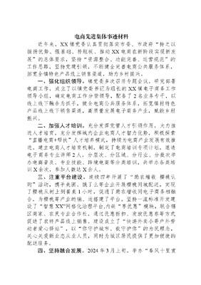 电商先进集体事迹材料近年来,XX镇党委认真贯彻落实市委、市政府持之以恒扬优势、强基础、补短板、推动XX电商在新阶段实现新发展的总体要求,坚持资源整合、功能完善、运营规范的工作思路,坚持党建引领,不断健全完善电商公共服务体系,拓宽全镇特色产品线上销售渠道,助力乡村振兴。一、强化组织领导。镇党委多次召开专题会议,研究部署电商工作,成立了以镇党委书记为组长的XX镇电子商务工作领导小组,确定电商工作分管领导,配备了2名业务专干,以线上线下融合为抓手,健全电商公共服务体系,拓宽镇村特色产品线上线下销售渠道,高质量发展电子商务产业,赋能乡村振兴。二、加强人才培训。充分发挥党管人才引领作用,大力推进人才培育,充分发挥域内企业电商人才智力优势,积极探索直播电商+帮扶人才培养模式,持续为电商产业发展有效推进。建立电商人才培育机制,制定了电商培训专项计划,邀请电子商务专业讲师2人,分层次、分区域、分行业、分批次举办电商普及、专业技能、跨境电商等分类培训,共举办各类培训X余次,参加人数达X余人。三、注重平台建设。连续四年开展了助农增收 樱桃认购活动,携手美团、饿了么等企业开展樱桃同城配送,实现了樱桃从树上到餐桌1小时,促进了助农增收同电子商务相融合,为樱桃等产业的销、运搭建了平台。坚持一流标准开发建设了智慧XX网格化治理平台,内嵌享优惠模块,联合辖区商家、农民专业合作社,通过优惠折扣、发放优惠券等方式促进了农特产品线上销售。建设成立了快递外卖小哥户外劳动者爱心驿站,以你守护城市、我守护你的为民理念,关心关爱新业态从业人员,同时为城区居民提供了更加便捷的配送服务。四、坚持融合发展。2024年3月上旬,举办春风十里赏樱花 助农增收提质效系列活动,以樱为媒,组织开展文艺演出、汉服旗袍秀和短视频、文学、摄影主题征稿等活动,吸引区内外游客达到X万人次,游客通过抖音、快手、视频号等平台打卡、直播,以XX镇樱花为主题的短视频流量火爆,XX镇樱桃产业美誉度和知名度得到大幅度提升,为下一步电商撬动农文旅融合发展开辟了新途径。文可居文库——海量学习资料,手机电脑均可下载www.wenkeju.com