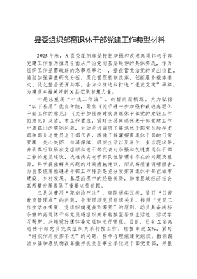 县委组织部离退休干部党建工作典型材料2023年来,X县委组织部坚持把加强和改进离退休老干部党建工作作为推进全面从严治党向基层延伸的具体实践,作为组织工作亟需破解的急事难事之一,摆在管党治党的突出位置,通过加强调查研究分析、深化管理机制改革、创新服务载体模式、优化整合资源共享,全方位推进和打造银发党建品牌,为建设幸福美好新X县汇聚智慧力量。一是注重用一线工作法,剖析问题根源。大力弘扬四下基层优良传统,聚焦《关于进一步加强和改进离退休干部工作的意见》《关于加强新时代离退休干部党的建设工作的意见》及省、市工作要求,紧盯全县离退休老干部党建工作中暴露出的实际问题,主动走访调研了离退休干部党员所在支部和部分老党员老干部代表,准确了解掌握离退休干部的日常管理、关心关怀、待遇保障、组织生活以及居住、生活现状等,并认真听取所在党组织和老干部代表对加强和改进离退休干部工作的意见建议,找准找实老干部队伍管理中存在的问题及根源,科学提出解决问题的对策措施建议,形成高质量调研报告,为县委统筹推进老干部工作特别是充分发挥离退休干部在城市建设、乡村发展、基层治理中的经验优势,助推县域经济社会高质量发展提供了重要决策依据。二是注重用靶向诊疗法,破除顽疾沉疴。紧盯日常教育管理难的问题,全面理顺党员组织关系。按照党员工作生活在哪里、党组织就覆盖到哪里的原则,动员具备转移条件的离退休干部党员将组织关系转接至居住生活地、活动学习场所、兴趣爱好团体等党组织进行管理。目前,已有X名离退休干部党员完成组织关系转接工作,转接率达X%。紧盯组织作用发挥不优的问题,科学合理组建党组织。撤销偏远乡镇和原机构改革撤并机关企事业单位老干部党支部,并根据老干部生活圈兴趣圈等特点,在现居住地、协会社团、老年大学等地,灵活设置离退休老干部党支部或功能型党支部,加强日常教育管理监督。目前,全县共设立离退休干部党组织X个,其中,社区X个、社会组织X个、企事业单位X个,另在县老年大学设立功能型党组织X个。紧盯组织服务能力不强的问题,选优配强党组织带头人队伍。注重选配党性强、威信高、身体好、经验丰富、乐于奉献、相对年轻的党员担任离退休干部党支部书记;选配政治素养和理论水平高,组织能力和服务意识强的离退休干部党员担任班子成员;同时,按照党组织隶属关系,选派1-2名党务干部担任党建指导员助理员,负责党内组织生活的提醒、筹备、记录以及影像资料的收集、整理、归档等工作。紧盯制度落实不规范的问题,严格执行党内组织生活。制定印发《关于加强新时代全县离退休干部党的建设工作的实施意见》,全面规范政治建设、组织管理、纪律监督、激励关怀、组织保障等;同时,把严肃党内组织生活作为重点,建立健全县级领导干部联系基层党建责任制、组工干部联系包抓基层六联工作制、基层党委(党组)班子成员列席指导基层组织生活、定期调阅会议记录及提醒等制度机制;并充分运用X党建信息化平台督办功能,实现离退休干部党支部组织生活制度化规范化。三是注重用建管并举法,理顺脉络症结。聚焦凝心铸魂筑牢思想根基。始终坚持把党的政治建设摆在首位,通过坚持不懈抓政治理论学习、抓思想教育引领、抓党内制度落实的三抓工作机制,全面加强离退休干部政治建设、组织建设、纪律作风建设等。2023年,X县老年大学春季、秋季2个班次累计招收学员达X余人次;组织离退休老干部集中观看网上报告会X场X余人次,邀请县委党校讲师专题举办离退休干部主题教育宣讲报告会X场X余人次。同时,坚持把政治理论学习作为第一议题,常态化推进党内组织生活制度化规范化,实现全县离退休干部党员政治教育全覆盖。聚焦强基文可居文库——海量学习资料,手机电脑均可下载www.wenkeju.com固本夯实阵地基础。注重把离退休干部活动阵地建设纳入全县党的建设总体规划,在服务保障城市建设,拆除原有老年活动中心的同时,主动适应城市发展形势,探索创新发展思路,结合打造高标准城市社区党群服务中心,一体谋划建设老干部活动场所;目前,依托文体单位和社区优势资源,统筹各类资金X余万元,先后建成集党群活动室、读书室、音乐室、书画室、康养室、百姓议事室等功能为一体的老干部活动中心X处,受益老年人群达X万余人。聚焦老有所乐丰富老年生活。健全完善党政领导干部带头经常联系、经常走访和定期听取老干部意见建议的长效机制。期间,县级领导干部带头落实四必访制度,走访慰问老党员老干部X余人,主动向老干部发放慰问信X份,实施健康体检X人等。进一步完善退休干部服务管理办法,严格落实老干部生活待遇政策,更新离退休干部信息系统,建立离休干部一人一策基本信息及服务台账,制定老干部一对一回访联系制度等,全面提升服务能力和水平;全年组织老干部参与践行党的XX