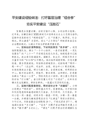 平安建设经验做法:打好基层治理组合拳夯实平安建设压舱石X镇是全国重点镇、省级百强中心镇、乡村治理示范镇。近年来,该镇坚持以XXX新时代中国特色社会主义思想为指导,坚持和发展新时代枫桥经验,以发案少,秩序好,社会稳定,群众满意为目标,通过三个到位积极探索基层社会治理新模式,以高水平安全护航高质量发展。一、坚持组织领导到位,下好风险防范先手棋。规范指挥配强队伍。健全一个中心指挥、一套系统管理、一支队伍服务的三个一平安建设规范化体系,构建党委书记统筹抓总,政法委员协调落实,调解员、执法员、网格员等多方力量参与的1+1+N工作模式,推动指挥调度顺畅、应急处置快速、服务便捷高效。衔接联动落地服务。创新构建两所一庭一中心(派出所、司法所、法庭、综治中心)联动机制,有效统筹政法力量,研讨化解之策。全面建成镇、村两级综治中心,配齐综治委员、网格员、警务助理、法律顾问,打通服务群众最后一公里。预防风险关口前移。建立重大项目风险评估打分制,着力防范重大项目后遗症,近年来该镇未发生规模性、群体性事件,一批重大项目顺利实施。二、坚持问题排查到位,用好定纷止争关键招。分时分级建立晴雨表。紧盯重点环节、要害领域,对矛盾纠纷和风险隐患特殊敏感时期天天排查、天天研判、天天报告,平时小组一周一排查、村级半月一排查一研判、乡镇一月一排查一会商,并根据化解难易程度实行红黄蓝等级分级管控。今年以来,共排查整治治安隐患23个,不稳定因素277个。精准调处探索多元解。蓝色问题矛盾由网格员开展上门服务随手调3次以上,黄色问题矛盾由村级调解队伍开展坝坝调解3次以上,红色问题矛盾由综治中心组织派出所、司法所、法庭等团队专业调解3次以上,实现小事不出村、大事不出镇、矛盾不上交。今年以来,累计化解矛盾纠纷1134件,成功率达96.51%。金牌调解打造终点站。将五老人员、致富带头人等社会力量吸纳进镇村两级调解队伍,全镇现有调解员112名。打造余热映初心调解工作室,聘请退休民警担任专职人民调解员,探索开展错时调解、情感调解、网络调解等调解方式,共调处各类矛盾纠纷800余起,调解成功率达97.13%。三、坚持群防群治到位,建好三治融合大舞台。自治强基激发治理活力。发动辖区群众、村社干部、退役军人等人员,组建治安巡逻志愿者队伍23支、共计150余人,联合派出所开展治安联防区域巡防1300余次。今年以来,辖区治安案件同比下降28%。法治护航涵养平安沃土。依托庭站点员四位一体诉讼服务网络,常态化开展一月一主题法治宣传教育和法律服务活动,成功创建省级枫桥式派出所、司法所各1个,市级民主法治示范村2个,培养法律明白人69名。德治教化引领向善向上。开展立家规、传家训、树家风、十佳星级文明户等评比活动,实行道德积分制,出台《家庭文明幸福积分细则》,引导群众由要我做转变为我要做。组建红白理事会,规范村规民约,着力推进移风易俗,弘扬和谐文明新风。文可居文库——海量学习资料,手机电脑均可下载www.wenkeju.com