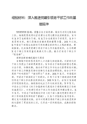 经验材料:深入推进党建引领老干部工作向基层延伸XXXXXX强调,要整合各方面资源,做好为老同志服务的工作,特别是要利用社区资源为老同志提供良好的服务。X市有X多万名离退休干部,有X万余名离退休干部党员、X多个基层党支部,他们是推动首都发展的重要力量。20X年以来,X市委老干部局站在新时代党的建设新的伟大工程的高度,积极探索,扎实推进党建引领老干部工作向基层延伸,全力构建X老干部工作高质量发展最大同心圆,着力打造老干部工作X品牌。探索创新准确把握时代要求首都城市的转型发展和人口老龄化加速推进,对新时代老干部工作提出了新的更高要求。X市委老干部局创新理念思路、方法手段、体制机制,推动老干部工作与社会化管理有效对接,将老干部工作制度优势切实转化为基层治理效能。结合全市开展的吹哨报到接诉即办改革,20X年X月,市委组织部、市委老干部局联合下发通知,在X个区X个街道启动党建引领老干部工作向基层延伸试点。20X年X月,在X区X街道召开现场推进会,持续推动试点工作向纵深发展。X年X月,市委办公厅印发《关于加强新时代离退休干部党的建设工作的实施意见》,对党建引领老干部工作向基层延伸提出要求。X年X月,市委老干部局制定印发《关于深入推进党建引领老干部工作向基层延伸的若干措施》,从X个方面提出X项任务。通过X年的探索实践,该市对党建引领老干部工作向基层延伸的内涵有了更深刻的认识,已形成一系列有效的、成熟的经验做法。党建引领老干部工作向基层延伸,就是在党的统一领导下充分发挥各级党组织作用,通过织细织密组织体系、健全运行机制、对接社区资源、促进融合发展,推动老干部工作重心下移、力量下沉,实现离退休干部党的建设、教育管理、发挥作用、服务保障向基层延伸;推动老干部工作有效融入首都基层党建大局、经济社会发展大局、老龄事业发展大局,为老同志就近学习、就近活动、就近得到关心照顾、就近发挥作用提供便利,有力破解老干部工作最后一公里难题。把握规律奋力开创崭新局面党建引领老干部工作向基层延伸,树立了大抓基层的鲜明导向,形成了整合资源破解老干部工作发展难题的良好局面。持续推进工作实践,必须牢牢把握老干部工作的政治属性,准确把握规律特点,不断创新方法路径,促进工作格局由条块分割向条块结合转变,彰显老干部工作时代担当。凝聚思想共识,夯实思想根基。党建引领老干部工作向基层延伸,是落实以人民为中心发展思想、破解最后一公里难题、主动融入首都党建大格局的生动实践,为构建综合统筹、多方联动、基层融合的老干部工作新发展格局提供了方向和路径。实践证明,只有广泛凝聚各级老干部工作部门、全市涉老部门及街道社区等相关单位的思想共识,老干部工作向基层延伸才能激发参与热情,获得持久动力。坚持党建引领,强化组织保障。老干部工作向基层延伸是一项综合性、系统性的工作,坚持党建引领,能够充分发挥各级党组织的政治领导力、思想引领力、群众组织力、社会号召力,用组织资源撬动社区资源,用组织力量凝聚工作合力,起到强有力的推动作用。实践证明,只有牢牢抓住党建引领这个关键,老干部工作向基层延伸才能得到组织保障,画出服务管理的最大同心圆,取得实实在在的成效。服务基层治理,彰显实践价值。推动党建引领老干部工作向基层延伸的重要意义,在于立足基层充分发挥老同志的政治文可居文库——海量学习资料,手机电脑均可下载www.wenkeju.com优势、经验优势、威望优势,切实把老干部工作的制度优势转化为助推首都基层治理的实践效能。实践证明,只有着眼基层治理这个大平台,以参与政策普及、平安建设、接诉即办、垃圾分类、物业管理等首都中心工作为切入点,不断拓展老同志发挥作用的领域和空间,才能凸显广大离退休干部在建设人人有责、人人尽责、人人享有的社会治理共同体中的积极作用,才能凸显老干部工作的社会价值。树立务实作风,提高能力水平。在党建引领老干部工作向基层延伸试点过程中,特别是疫情期间,全市各级老干部工作部门进一步形成了以干为主、实干为先的主流价值观,眼睛向下看、主动联系基层的多了,注重调查研究、问需于老同志的多了,积极想方设法推动资源、服务下沉的多了。实践证明,只有牢固树立务实作风,践行用心用情服务老干部的宗旨,加强老干部工作队伍的思想淬炼、政治历练、实践锻炼、专业训练,才能以更强能力、更高质量落实好老干部工作向基层延伸的任务要求。突出融合共享,拓展方法路径。推动党建引领老干部工作向基层延伸,要走出自我封闭的老路,秉持开放共享的理念,从本部门相加迈向与涉老部门、基层社区、服务行业等相融。实践证明,只有树立一盘棋思想,敞开大门做工作,提高站位谋发展,才能适应时代发展要求,在更广范围、更高层次、更深程度上推动老干部工作向基层延伸,助力老同志过上幸福美好生活。高位推进不断提升质量水平在试点实践中,