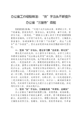 办公室工作经验做法:快字当头不断提升办公室三服务效能XXXXXX强调:对党中央作出的决策、部署的工作、定下的事情,要雷厉风行、紧抓快办,案无积卷、事不过夜,要扭住不放、一抓到底。XXX办公室认真学习贯彻XXXXXX重要讲话精神,以学促干转作风,着力在理论学习、文稿服务、督查督办、协调保障等工作中按下快进键,跑出三服务的加速度,坚决当好党委和政府的坚强前哨和巩固后院。一、坚持快字当头,理论学习要走在前、转化快理论是行动的先导。办公室作为中枢机关,在学习上级文件精神方面拥有近水楼台先得月的优势,要把这一天然优势转化为先学先用的优势,先行强化理论武装、先行转化学习成果。一是坚持先学一步,紧跟党的创新理论步伐,紧盯中央重大决策、重要会议精神和省委市委最新部署要求,同时涉猎经济社会、法律法规、科学技术等各领域知识,深入学习领会,夯实理论功底。二是丰富学习方式,把学习作为一种责任、当成一种习惯,坚持原原本本学、融会贯通学、联系实际学,向书本学、向实践学、向领导学、向群众学、向一切先进经验学。三是及时转化运用,坚持以知促行、知行合一,做到真学真信真用,及时将学习成果转化为提升办公室工作的新技能,并运用到实际工作、具体实践中去。二、坚持快字当头,文稿服务要早谋划、出稿快办公室最先了解领导的意图主张、发展思路、规划部署,有条件在文稿服务中做到见事早、动笔早。要不断提高政治判断力、政治领悟力、政治执行力,增强文稿起草、调查研究等文稿服务的预见性、前瞻性、实效性,提前思考谋划、尽早着手准备,打好主动仗、备足提前量。一是文稿起草突出预见性,加强办公室各部门之间信息的互动交流,提前准备起草会议文稿,对中央作出的重大决策部署和省委市委出台的重要政策文件,结合实际第一时间细化,制定贯彻落实文件。二是调查研究着眼前瞻性,针对全市经济社会中长期发展规划、事关全局的重大政策调整及领导关注的重点问题、群众反映强烈的热点问题开展前瞻性调研,为市委决策提供及时准确的参考依据。三是写作技能注重实效性,注重平时锤炼办公室党员干部快速领会领导意图的能力、搜集相关素材的能力、搭建框架结构的能力、初稿即终稿的能力,全过程提高写作效率,优质高效提供文稿服务保障。三、坚持快字当头,督查督办要讲效率、行动快督查行动有多快、力度有多大,在很大程度上决定了工作进展有多快、成效有多大。注重发挥督查利剑作用,对于上级党委议定的事项立说立行、抓紧快办,坚决做到决策部署到哪里,督查工作就跟进哪里。一是改进督查方式方法,灵活采取四不两直检查与随机抽查相结合、电话问询与会议座谈相结合、个别抽查与集中督查,服务保障中央重大决策和省委市委部署要求快速落地、见行见效。二是提升督办工作效能,对于领导临时批办的急件要件,即来即办、快事快办、特件特办,打破常规、快速反应、及时反馈;对于领导交办的重大突发等特殊事项,深入现场听真话、察实情,第一时间上报有关信息,为市委及时应对、迅速处置提供参考依据。三是强化督查结果运用,树立重实干、重实绩的鲜明导向,对于不作为、慢作为、乱作为而造成严重后果的,从严从快、依规依纪严肃追责问责。四、坚持快字当头,协调保障要善应急、处突快办公室经常是大事要事交织、急事难事叠加,需要强化风险防范的意识、提高应急处突的能力,做最坏的打算、最充分的准备,确保紧急时刻能够作出最及时反应、最有效处置。一文可居文库——海量学习资料,手机电脑均可下载www.wenkeju.com是事前研判预防风险,提前预判可能发生的风险隐患,时刻保持如履薄冰的谨慎、见叶知秋的敏锐。二是事中科学妥善处置,越是关键时刻越要保持头脑清醒,越是慌乱之中越要保持沉着冷静,分清问题的主要矛盾和矛盾的主要方面,抓住关键、找准症结,灵敏反应、精准施策。三是事后反思汲取教训,深刻分析产生问题的深层次原因,及时补齐短板、堵住漏洞,优化完善方案预案,切实做到举一反三、标本兼治,从源头防止类似问题的再次发生。文可居文库——海量学习资料,手机电脑均可下载www.wenkeju.com
