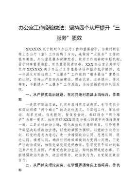 办公室工作经验做法:坚持四个从严提升三服务质效XXXXXX关于新时代办公厅工作的重要指示,为做好新征程上办公厅(室)工作指明了方向,是做好三服务工作的根本遵循。办公室是服务保障党委、政府工作运转的中枢机构,居于特殊重要地位、肩负重要职责使命。XXX办公室认真学习贯彻XXXXXX关于办公厅工作重要讲话和指示批示精神,进一步深化对新征程上三服务工作做到服务最佳重要性的认识,坚持从严抓实政治建设、理论武装、业务提升、作风转变,不断提升三服务工作质效,当好坚强前哨和巩固后院。一、从严抓实政治建设,在对党绝对忠诚上当标兵、作表率一是筑牢政治忠诚,扎实开展对党忠诚教育,引导党员干部深刻领悟两个确立的决定性意义,在谋划工作、筹办活动、起草文稿、信息报送、督促检查时,都以符合两个维护为第一要求,始终同以XXX同志为核心的党中央保持高度一致。二是站稳政治立场,强化政治机关意识教育,引导党员干部坚决站稳政治立场,以党的旗帜为旗帜、以党的方向为方向、以党的意志为意志,进一步增强政治认同、思想认同、理论认同、情感认同,确保任何时候都做到与党同心同德。三是严守政治规矩,加强党章党规党纪教育,引导党员干部时刻铭记共产党员身份,严肃党内政治生活,始终按照规矩办事,不断增强政治判断力、政治领悟力、政治执行力,自觉规范政治言行。二、从严抓实理论武装,在学懂弄通做实上当标兵、作表率一是理论学习先一步,坚持第一议题制度,开展书香机关建设,教育引导党员干部增强学习自觉性、主动性,第一时间学习领会党中央作出的决策部署、出台的政策文件,及时跟进学习XXXXXX最新重要讲话和指示批示精神,始终保持理论上的清醒和坚定。二是学思践悟深一层,坚持领学、促学,示范带动党员干部全面、系统、深入学习党的创新理论,带着问题学、联系实际学,在反复研读中深化思考,自觉从党的创新理论重找思路、找答案、找方法,力求学出新高度、新境界。三是融会贯通高一筹,坚持学以致用,做好转化应用,更加自觉地把理论学习与贯彻落实党中央、省委、市委各项决策部署相结合,推动理论学习与业务工作深度融合互促互进,不断把学习成果转化为推动XX经济社会高质量发展的具体行动和实际成效。三、从严抓实业务提升,在服务中心大局上当标兵、作表率一是统筹协调讲办法,充分发挥办公室牵头抓总作用,坚持主动靠前协调,在统筹协调重点工作、重要事项、重大活动上把握节奏,科学配置资源、调动理论、回应关切,形成上下畅通、左右协调、齐抓共管的工作格局。二是参谋辅政出点子,充分发挥办公室作为党委和政府智囊的作用,聚焦XX市发展思路,想大事、谋全局,深入调查研究,做好以文辅政,抓好各类信息报送,真正做到参到关键处、谋在点子上。三是督查检查见实效,充分发挥督查利剑作用,紧盯党中央决策部署以及省委工作部署和市委中心工作任务,建立完善常态化、闭环式工作督查机制,督任务、督进度、督成效,查认识、查责任、查作风,以督查实效保障任务落实。四、从严抓实作风转变,在勇于担当作为上当标兵、作表率一是养成马上就办、真抓实干的作风,树立重实干、重实绩、重担当的导向,引导党员干部牢固树立今天再晚也是早、文可居文库——海量学习资料,手机电脑均可下载www.wenkeju.com明天再早也是晚的效率意识和真抓实干的担当意识,做到今天的事今天办、能办的事马上办、重要的事立即办、限时的事计时办、困难的事想法设法办、所有的事认真负责办,把马上就办落实到具体行动上,让真抓实干蔚然成风。二是养成严谨细致、精益求精的作风,以开展规范化、精细化、信息化三化建设为抓手,弘扬专业精神、工匠精神,强化细致、精细、精准意识,把严谨细致、、精益求精贯穿办文、办会、办事全过程,摒弃差不多想当然思想,不忽略每一个环节、不放过每一个细节,在办文上精雕细琢、办会上精细安排、办事上精益求精。三是养成吃苦耐劳、甘于奉献的作风,坚持以上率下、领导带头,培养党员干部甘愿吃苦、甘愿奉献的精神,将吃苦奉献精神融入日常工作中,甘当默默无闻的螺丝钉、任劳任怨的老黄牛,正确处理苦与乐、名与利、得与失的关系,专心致志、心无旁骛做好三服务工作。文可居文库——海量学习资料,手机电脑均可下载www.wenkeju.com