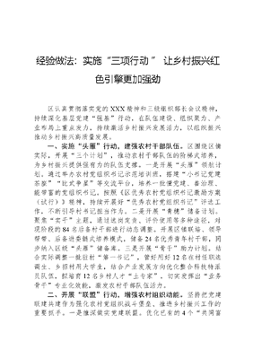 经验做法:实施三项行动 让乡村振兴红色引擎更加强劲区认真贯彻落实党的XXX精神和三级组织部长会议精神,持续深化基层党建强基行动,在队伍建设、组织聚力、产业布局上重点发力,持续激活乡村振兴发展活力,以组织振兴推动乡村振兴高质量发展。一、实施头雁行动,建强农村干部队伍。区围绕区情实际,开展三个计划,推动农村干部队伍的阶梯式培养,为乡村振兴提供强有力的队伍支撑。一是开展头雁领航计划。通过举办农村党组织书记示范培训班,搭建小书记党建茶座比武争星等交流平台,培养一批懂党建、善治理、能带富的党组织书记。按照《区优秀农村党组织书记激励方案(试行)》精神,持续开展好优秀农村党组织书记评选工作,不断引导村书记担当作为。二是开展青穗储备计划。聚焦实干主题,通过选岗定责、评价使用等多种途径,对现阶段的84名后备村干部进行动态调整。开展区镇联培、领导帮带、后备进委链式培养模式,储备24名优秀青年村干部,同步纳入区级头雁储备库。三是开展骨干助力计划。结合实际调整一批驻村第一书记,管好用好12名在村任职选调生、乡招村用大学生,结合产业发展方向优化整合科技特派员队伍,拟培育12名乡村人才土专家,切实发挥出业务骨干专业化效能,激发农村干部队伍活力。二、开展联盟行动,增强农村组织动能。坚持把党建联建共建作为强化农村党组织战斗堡垒、推进乡村振兴工作的重要抓手。一是推深做实党建联盟。优化已有的4个共同富裕党建联盟,结合集体经济类型、产业发展方向等特点,组建特色党建联盟。以党组织+的模式,跨地域、跨层级、跨类别链接资源,形成政策、资金、人才、技术的集聚效应。二是开展村居联建强组织、村企联建促发展党建共建活动。结合最强党支部建设,把握群众性教育实践活动契机,通过组织共建、以强带弱、强强联手等方式,加大农村模范党支部创建力度,实现组织强带动产业兴、产业兴促进村民富的目标。试点推动12个社区、12家非公企业党组织同农村党组织共建,为党建引领乡村振兴提供多维度输出、多元化服务。三是开展三进两包联党员群众结盟行动。持续开展好农村党员承诺践诺活动,依托村党委-网格党支部-党员中心户组织架构,推动党员进网格、进党群服务中心、进村民微信群和主动包联贫困户、产业大户的三进两包联活动,形成党员同群众常态化结盟互助机制,实现党建引领下的民富村强。三、推行专班行动,优化农村产业布局。区围绕党建+产业主题,探索专班式推进农村集体经济发展,组建5个区级党建引领农村产业发展类专班,整体谋划农村集体产业发展布局。一是以党建引领助推品牌化发展。组建区级一村一品推进专班,鼓励农村党组织因地制宜扩大乡村特色优势产业,发挥党组织+合作社+农民党员基本模式作用,调动各类新兴经营主体发展特色产业,擦亮X村百鲜农业园、X小镇等品牌,以一马当先品牌化示范带动乡村振兴全局工作的万马奔腾。二是以党建项目推进模块化运作。梳理盘活农村集体经济资源,探索资源发包型、资产经营型、村企合作型、旅游发展型4种发展模式,党组织牵头形成党建项目,纳入重点项目专班,项目化推动各类型村集体经济发展模式落实落地。三是以招商引资推进规模化布局。组建X旅游度假区创建专班,通过区级专班招商引资、农村组织推动落实的方式,形成X文旅业态、产业品质、消费平台的规模化布局。充分利用X村等村产业发展实际,形成规模化民宿产业发展布文可居文库——海量学习资料,手机电脑均可下载www.wenkeju.com局,带动休闲娱乐、餐饮购物、交通设施的裂变式发展,构建宜游乡村建设新格局。文可居文库——海量学习资料,手机电脑均可下载www.wenkeju.com