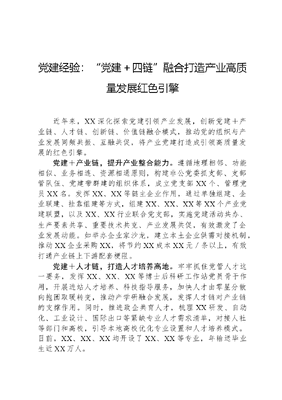 党建经验:党建+四链融合打造产业高质量发展红色引擎近年来,XX深化探索党建引领产业发展,创新党建+产业链、人才链、创新链、价值链融合模式,推动党的组织与产业发展同频共振、互融共促,将产业党建打造成引领高质量发展的红色引擎。党建+产业链,提升产业整合能力。遵循地理相邻、功能相似、业务相连、资源相通原则,构建非公党委抓支部、支部管队伍、党建带群建的组织体系,成立党支部XX个、管理党员XX名。发挥XX、XX等链主企业作用,通过单独组建、企业联建、挂靠组建等方式,组建XX、XX、XX等XX个产业党建联盟,以及XX、XX行业联合党支部,实施党建活动共办、生产要素共享、重要技术共克、产业发展共促,有效激发了企业发展动能。如举办企业家沙龙,建立本土企业供需对接机制,推动XX企业采购XX,将节约XX成本XX元/条以上,有效打通产业链上下游配套梗阻。党建+人才链,打造人才培养高地。牢牢抓住党管人才这一要务,发挥XX、XX、XX等博士后科研工作站党员骨干作用,开展进站人才培养、科技指导服务,加快人才由零星分散向抱团取暖转变,推动产学研融合发展,发挥人才链对产业链的支撑作用。同时,推进政企共育人才,梳理XX研发、自动化、工业设计、国际出口等紧缺专业人才需求清单,对接人社等部门和高校,引导本地高校优化专业设置和人才培养模式。目前,XX、XX、XX均开设了XX、XX等专业,年输送毕业生近XX万人。党建+创新链,发挥党员先锋作用。坚持把党员培育成技术骨干、把技术骨干培养成党员理念,成立党员领衔的劳模工作室、创新工作室XX余个、研发机构XX余个,设立党员责任区党员示范岗各XX个,引导党员亮身份、亮承诺,带头开展技术攻关、出金点子,把党的政治优势转化为创新优势、发展胜势,加快党建与企业创新双向奔赴。如XX党支部,结合BMS部门职能,成立攻关小组,主导或参与设备改善、工艺优化、节能等项目近XX个,为企业节约成本XX余万元。党建+价值链,力促产品质价双升。坚持以质量提升为抓手,激励党员比学赶超。如XX紧盯党员工位的质量把控,每月评选质量、安全、效能等标兵,带动职工端正态度、规范操作、提高效率,产品合格率达XX%。XX专注XX、XX及XX生产,引进高技能、高学历研发团队,发挥党员先锋队作用,紧盯行业发展动态,开发出XX,成为XX、XX等头部企业的主要供应商,在业内打响了XX造品牌。文可居文库——海量学习资料,手机电脑均可下载www.wenkeju.com