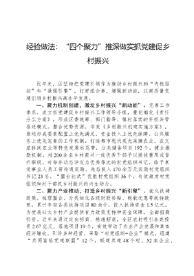 经验做法:四个聚力推深做实抓党建促乡村振兴近年来,区坚持把党建引领作为推动乡村振兴的内核驱动和最强引擎,打好组合拳,增强新动能,以高质量党建引领乡村振兴高水平发展。一、聚力机制创建,激发乡村振兴新动能。完善工作体系。成立抓党建促乡村振兴工作领导小组,量化细化《责任分工方案》,形成区委统筹、部门指导、镇村落实的齐抓共管推进模式。整合优势资源。印发《乡村振兴创建实施方案》,推动形成要素配置上优先满足、资金投入上优先保障、公共服务上优先完善的工作机制。打造都市现代观光采摘农业、农文旅休闲农业等特色发展示范带,分类储备项目192个。健全激励机制。对200余名乡村振兴一线优秀干部予以提拔重用或晋升职级。对每年动态评定为优秀等次的村党组织书记,给予享受事业人员工资待遇奖励。先后投入170余万元奖励村党组织书记23名、擂台比武优胜村党组织36个,有效激发村党组织和村干部抓乡村振兴的内生动力。二、聚力产业推动,打造乡村振兴新引擎。优化扶持政策。梳理整合、分类细化各级财政补贴、税收优惠等扶持政策,累计争取各类扶持项目80余个,投入扶持资金1.5亿元,为发展壮大乡村产业提供有力政策支持和资金保障。全面招商引资。近年来通过定向招商、精准招商,全区农村吸引各类投资2.67亿元,落地项目19个,有效带动了农业产业发展和集体经济增收。引导多种经营。采取村党组织+企业模式,组建共同富裕党建联盟12个,联建共建48个村、52家企业、13家合作社,辐射带动农户15600户,目前后窑子村等21个村实现自主经营集体产业,年增收达1300余万元。三、聚力人才引育,凝聚乡村振兴新合力。选派专业人才。精准选派14名具有涉农专业或经历的干部到村担任驻村第一书记,35名大学毕业生到村实践锻炼,推动4个软弱涣散村转化提升,7个基层治理重点村矛盾问题有效化解,10个乡村振兴重点村产业发展提质增效。强化对外引才。探索院区合作模式,联合农业科研院校建立乡村人才工作站,组建17支专家服务团队指导农业产业和特色果蔬品牌发展。深入实施引凤还巢工程,精准回引优秀人才担任村党组织书记,有效提升头雁队伍带动发展能力。注重内部育才。组织200余名村两委干部参加学历提升培训班,帮助镇村干部开拓思路眼界。充分挖掘本土人才,培育土专家田秀才500余人,锻造了一支带不走的乡村振兴队伍。四、聚力示范带动,绘就乡村振兴新画卷。培树示范带头人。开展党员引领致富项目四个一行动,引导农村党员带头发展致富产业、结对帮带群众。目前,全区已有800余名党员领办合作社293家,辐射带动农户2300余户。培树示范新业态。坚持在土特产上做文章、资源盘活上闯新路、社会化服务上要效益,目前已形成X村小杂粮种植加工项目、X村水上乐园休闲娱乐项目等新型集体经济发展示范项目16个,有效带动全区农村因地制宜发展新型产业。培树示范样板带。以五强推进分类提升行动为抓手,结合模范支部创建,选树打造20个区级坚强堡垒模范支部示范点,初步形成5条抓党建促乡村振兴示范带,辐射带动沿线50余个村发展壮大。文可居文库——海量学习资料,手机电脑均可下载www.wenkeju.com