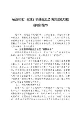 经验做法:党建引领建强堡垒 夯实基础助推治理新格局近年来,街道坚持党建引领,以夯实基础、深化创新工作为着力点,积极构建区域统筹、多方协同、以人为本的网格化治理服务体系,打通基层治理的神经末梢。这种新型的治理模式不仅提升了社区管理的效率和效果,也更好地满足了居民的多样化、个性化需求。一、党建引领织密基层治理精网细格以网格化服务管理为切入点,打造家门口的党建服务品牌,推动工作下沉到网格、暖心服务送到家门口。(一)推进干部下沉新模式街道以推进干部下沉新模式为重点,通过网格化服务管理为切入点,着力打造了家门口的党建服务品牌,让服务触手可及、温暖人心。街道常态化开展了万名干部下基层行动,积极推动642名在职党员干部到居住地小区报到,亲自投入到基层服务工作中。通过将干部下沉到网格,他们不仅更深入地了解了居民的需求,也更及时地为居民提供了服务。这种近距离的服务模式,使得党的力量真正融入到了群众的生活中,彰显了党的初心和使命。(二)构建网格管理新业态打造党工委—社区党组织—网格党支部(党小组)—党员中心户的网格化服务模式,将辖区单位、社会组织等各类网格资源和治理职能整编入网,共形成47个网格体系,1277名党员干部、志愿者组成网格服务队伍。在去年海葵台风期间,号召15个基层党组织共300多名党员主动投身到抢险救灾各项工作中,X辖区28处地下室空间无一进水,切实保障群众生命安全。(三)打造区域协同新动能以2023年为节点,着力打造了金印村金侨印象党建品牌,以党建带侨建,以侨建促党建,充分发挥了侨乡优势,不仅拓展了党建的广度和深度,也为侨乡的繁荣发展注入了新的活力。目前,街道共创建党建品牌5个,培育五星级党组织2个,四星级党组织7个,福州市级五星级党校1个,各村(社区)党组织已与28家群团组织、企事业单位签订了共建协议,联建汇聚发展合力。二、多方联合打造矛盾化解一站平台积极做好民情前哨工作,把矛盾纠纷化解在基层,把和谐稳定创建在基层。(一)搭建矛调平台街道在派出所设立了一站式矛盾纠纷调处中心,这个中心不仅集合了多个部门的力量,还吸引了社会各界的人员积极参与,形成了以司法公证为引领的1+5+N调解团队。这个调解团队的成员涵盖了乡贤调解委员会、侨联等部门工作人员,以及老党员等社会力量,他们共同致力于解决各类纠纷。中心建成以来,已经成功调解了婚恋家庭、邻里、物业等各种纠纷52件,受理了大量的12345诉求件3027件,并且办结了信访案件71件,同时还全面化解了三批治重化积案件共6件。(二)确保民呼我为采取了一系列措施加强物业队伍建设和服务能力。他们积极培育了红色物业和红色业委会,这些组织不仅提供专业的物业管理服务,还注重党建工作,将党的优良传统融入到小区管理中。除此之外,街道还搭建了小区事务听评会、楼栋议事会等议事平台,为居民提供多样化的渠道来解决问题和表达诉求。这种参与式的治理模式有效地破解了条块分割难题,让居民更加参与到社区事务中来。这种民呼我为的文可居文库——海量学习资料,手机电脑均可下载www.wenkeju.com工作理念,让社区管理更加民主、透明,为建设和谐社区、促进社会和谐稳定做出了重要贡献。(三)强化源头治理针对村(社区)无法协调的矛盾纠纷与信访事件,街道采取了逐个进行研究的方式,由主要领导牵头,分管领导包案,明确时间、任务、责任三张清单。这种严密的工作机制有效地保证了问题的及时解决和责任的明确。尤其针对敏感复杂的矛盾纠纷信访件,街道实行了联动调节,确保了各方的利益得到妥善处理,遏制了矛盾纠纷的进一步扩大。通过源头治理,这些措施不仅提高了街道治理的效率和水平,更重要的是有效地维护了社会的稳定和谐。三、以人为本推动民生工程服务到位紧抓利民便民关键点,用心用情,让民生服务升温。(一)抓细便民服务街道致力于打造十五分钟便民服务生活圈,让群众享受更便捷的服务。为此,街道制定了一张清单,办到底成为他们的工作原则。在实施过程中,他们遵循着明确的目标定位,合理选址布局,并科学规范地设置了功能和办公事项,确保了服务设施的高效运作。在这个便民生活圈内,无论是处理日常琐事还是重要事务,群众都能享受到便捷的服务。无论是小事还是大事,都可以在家门口或附近就地解决,实现了小事不出村,大事不出街的目标。(二)抓牢村财壮大街道指导X村等八个村积极利用村生产生活留用地政策,在X片区成功回购了50994平方米的物业及258个车位,这一举措不仅为村庄增添了财政收入,还拓宽了村财收入的渠道。截止到2023年,所辖的11个村经营性收入大约都能达到20万以上,其中至少有8个村的经营性收入将达到50万以上,占比将达到72%。通过抓牢村财壮大,为村民提供更多的公共服务和改善生