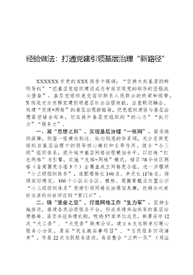 经验做法:打通党建引领基层治理新路径XXXXXX在党的XXX报告中强调:坚持大抓基层的鲜明导向把基层党组织建设成为有效实现党的领导的坚强战斗堡垒。基层党组织是党密切联系人民群众的桥梁和纽带,X街道充分发挥党建引领基层社会治理效能,注重联动融合,构建党建+网格的基层治理新格局,把党组织建设与基层治理紧密结合起来,切实提升基层党组织的向心力执行力服务力。一、凝思想之形,实现基层治理一张网。强化组织保障,织密一张横向到边、纵向到底的体系网,充分发挥党组织在基层治理中的领导核心地位和主导作用。健全小三级组织体系,提升城市基层网格治理精治水平。以打造红色网格为引擎,实施支部+网格模式,辖区78个社区网格(含商圈党小组3个)全覆盖成立网格党小组,进一步理顺小三级组织体系,选配楼栋长340名、单元长1176名。按照实际情况,106个小区在小区、楼栋、商圈等醒目位置公示小三级组织体系党建引领网格化治理信息牌,把群众对美好生活的向往回应到家门口。二、铸堡垒之坚,打造网格工作生力军。坚持全域推进,搭建各类治理服务平台,形成共建共治共享的基层治理格局。落实共驻共建机制,吸纳57家单位成员,部署召开12次大工委、大党委联席会议,建立6支包联单位暖心服务小分队,落实民生微实事项目、为民服务四项清单,开展22次为民服务活动。有效整合三所一队(司法所、派出所、市场监督管理所、城管队),实行一支队伍管执法。各社区党支部以网格为单位公示包含综合行政执法局、市场监督所、卫生服务中心、司法所、辖区民警、供水、供电、供气、供暖、物业的联系方式的网格服务管理公示栏,方便居民随时查找联系,及时解决生活中遇到的问题。三、增为民之效,提升群众宜居幸福感。全面推动在职党员到居住地社区报到发挥作用,大力推广网格吹哨、部门报道机制。扎实做好在职党员双报到工作,由网格员在网格党支部的基础上进行双报到党员摸排工作,动员632名在职党员到社区报道,其中133人担任单元长、92人担任楼栋长。各社区建立便民服务中心。X社区积极推进五社联动,常态化举办各类文体活动,丰富群众文化生活;X社区推行三必到五必访服务群众零距离工作法,按网格定指标,规定网格员对重点人群进行入户走访的户数,确保每季度全覆盖走访一遍,做到对辖区困难群体底数清、情况明,更加精准为民办实事。今后,街道党工委将始终坚持党建引领基层治理,整合各方的力量和资源,以网格为单位,加快构建信息建设、文明创建、精准服务、矛盾调解融合发展的基层治理模式,把党建触角延伸到社区的每个网格,构建为民服务微循环,让居民在社区生活得更方便、更舒心、更美好。文可居文库——海量学习资料,手机电脑均可下载www.wenkeju.com