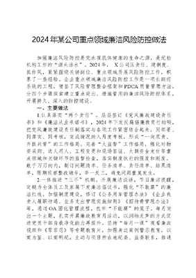 2024年某公司重点领域廉洁风险防控做法加强廉洁风险防控是党永葆肌体健康的生命之源,是纪检机构工作的源头活水。2024年, X公司压责任、建制度、抓作风,紧紧围绕关键岗位、重点领域开展风险防控工作,积累了一些经验。企业重点领域廉洁风险防控工作是一项长期而系统的工程,借鉴了风险管理整合框架和PDCA质量管理方法,分四个步骤探索建立重点突出、措施管用的廉洁风险防控体系,开展持久、深入的防控建设。一、主要做法1.认真落实两个责任。层层签订《党风廉政建设责任书》和《廉洁从业承诺书》,2024年下发反腐倡廉教育行动项,把党风廉政建设责任制落实与各项工作紧密结合起来,同部署、同落实、同考核,完成情况纳入月度考核,形成一岗双责、齐抓共管的工作格局。完善大监督工作格局,强化对物资采购、选人用人、工程变更和现场签证、大额资金支付等重点领域和关键环节的监督检查,落实制度执行的强度和刚度。敢于刀刃向内,制订问题清单、任务清单、责任清单、结果清单,限期巡察整改销号,举一反三,避免问题重复发生。2.一体推进三不机制。开展廉洁谈话,节日廉洁提醒,定期为全体员工及家属下发廉洁倡议书,强化不敢腐的廉洁红线。加强制度建设,修订《公务用车管理办法》《企业负责人履职待遇、业务支出管理实施细则》《招待费管理办法》等,通过OA固化管理流程,扎牢不能腐的笼子。每月突出一个主题,扎实开展廉政教育月活动,以润物无声的方式促进党员干部自我净化能力再提升。坚持每月一课观看廉政视频和《零容忍》等专题教育片,加强身边案例警示教育,以案为鉴、以案明纪,主动与项目所在地纪委、监委联系,推进企地协作监督,筑牢党员干部不想腐的自觉。3.持续拧紧作风建设发条。紧盯关键少数,重点整治形式主义、官僚主义,持之以恒加固中央八项规定堤坝,增强对一把手和领导班子监督实效。企业纪检机构作为监督主责机关,向党支部汇报,与班子成员达成共识,发动各职能部门查找管理漏洞,防控廉洁风险,防范损公肥私、吃里扒外、靠企吃企等违规违纪违法行为发生,先后多次查找问题,开展微权力靶向监督。充分发挥党风监督员作用,在车辆管理、物资采购、业务招待等实际工作中起到监督制约效用,促进党风政风转变。二、存在的问题和不足1.思想教育不够扎实。企业廉政教育面较窄,渗透力和穿透力不足。加之社会经济的发展促使干部职工价值观念和生活方式多元化,思想难以管控,加大了廉洁风险的防控难度。有些员工认为自己不会发生腐败行为;有些认为廉洁风险只存在于领导干部;有些今天学了明天忘,没有深入内心;还有的进行了警示教育,但仍然控制不了自己的私欲。这导致的一个后果就是监管难以延伸到基层,廉洁风险防控难以落实到神经末梢,作为具体业务工作执行者的一线党员干部职工底线意识、法治观念相对淡薄,对廉洁风险缺乏警惕,容易被渗透、被腐蚀。2.查找问题不够深入。与生产设备、作业环境、职业健康等主要安全风险的辨识、评估工作相比较,重点领域廉洁风险的识别精准度、有效性亟待提高。一方面,没有形成一套有参照标准的风险库,人为自由裁量权较大,人的思想、行为分析人云亦云,存在非线性变量而无法总结规律,导致很难进行定量的分析和评估。另一方面,部分员工还存在不愿查、不敢查、不想查的情绪和顾虑。有的员工认为自己思想觉悟高,或者认为自己手中没有什么权力,无风险可查找,不需要开展防控工作;有的员工认为只要按照规章制度办就行,没必要查;有的岗位和部门有时只是关起门来自己找问题,未充分、全面地排查,致使查找出的风险点较为肤浅和散乱,不够准确。3.监督体制机制不够完善。随着企业业务经营管理的深入推进,管理制度和内控机制的完善需要有一个过程。相对而言,廉洁风险防控工作起步晚,与企业业务流程和管理体系融合度还不够高。一方面,在企业的某些重点环节,比如物资采购、安全生产、工程建设以及各场站的管理中,原先的管理制度本身不够严密,规定零散、混乱,缺乏可操作性,无法具体落到实处。另一方面,纪检人员配备较少,无法监控到每个业务流程开展相关监督工作,导致廉洁风险防控工作可能流于形式,内控制度不完善,监督机制未完全到位,各关键流程的管控就得不到很好的落实。4.闭环管理有所欠缺。国有企业行业资金技术密集,物资设备采购量大,管理链条长,经营关键环节也多,当前廉洁风险防控形势依然严峻。一方面,廉洁风险防控建设责任制未实现有效的拓宽和深化,责任追究、考核评估等配套制度不够完善。廉洁风险防控工作较少去关注措施对风险防控是否适用有效,措施执行情况如何,效果如何。另一方面,对廉洁风险点、防控措施的动态管理不到位。2024年,企业行业新业态新产业不断涌现,企业对所涉新业务的廉洁风险防控缺乏可借鉴经验,防范治理机制和手段相对滞后,导致难以及时准确预判防控风险,实现全流程精准监控。三、