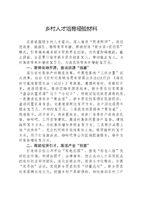 乡村人才培育经验材料县紧紧围绕乡村人才振兴,深入推进两进两回,通过优政策、强招引、精培育等举措,积极打造新乡贤+农创客模式,引育越来越多新乡贤跨界农创客,为共富加码赋能。截止目前,全县累计培育新乡贤农创客X人,带动就业X人,为村集体带来年增收X万元,为渔农民带来年增收X万元。一、聚势依地开源,盘活资源造富深化农村集体产权制度改革,开展宅基地三权分置试点改革,出台《农村宅基地自愿有偿退出办法(试行)》《渔农村宅基地管理办法(试行)》等政策,遵循所有权、资格权不变,放活经营权,推动沉睡资源活起来。新乡贤农创客聚焦盘活闲置资源这个小切口,积极实现低效资源再利用。一是激活农房变身黄金屋。新乡贤农创客锁定民宿经济,盘活闲置农房X套,宅基地面积达X平方米。农户因此获得年租金X万元,户均约X万元。二是改造村屋招来聚宝盆。找准路子,迈开步子,将闲置校舍、废弃厂房等资产改造成民宿、咖啡吧、工作室等建筑,激活村集体闲置房产X套,建筑面积X平方米,为村集体增加年租金X万元。三是聚沙成塔土地边角料。充分利用碎片化村集体土地,租赁面积约X平方米,用于打造游泳池、咖啡吧等公共区域配套服务,每年为村集体增收X万元。二、聚能招贤引才,激活产业创富打造综合性公共平台X电创园,营造拎包入驻良好创业环境。构建由团干、法律青年、创业成功人才共同组成的农村创业导师团队,深化农银合作,提供全方位帮扶。开展双寻找活动,实现新乡贤农创客归雁成行。新乡贤农创客深耕在地文化,挖掘乡村产品新供给,加快推动农村三产融合发展。一是擦亮民宿金名片。以民宿高质量发展为着力点,着眼品牌建设,推动单一住宿向乡村综合体转型,辐射带动行业升级。我县共有农创客参与的省级银宿及以上民宿x家,其中新乡贤农创客经营的x家,占比X%。二是打造文创新风口。聚焦文化赋能美丽乡村,培育影视拍摄、研学教育、活动策划等新业态,打造x节品牌效益,建设新消费场景,单次吸纳x余户农户参与集市,户均创收约x元。三是插上电商云翅膀。整合x家民宿力量,创建x电商品牌,构建电商平台+物流+基地全产业链服务模式,帮助各类农产品搭上互联网快车,让民宿业主旺季忙民宿,淡季忙带货,助力实现农旅融合和利益共赢。三、聚力精耕细作,用活头雁带富建立县、乡镇、村三级联动机制,开展人才培养、技术培训、学历提升、成果转化四位一体订单式培育。成立x创客联盟,举办创业论坛,搭建交流合作、抱团发展的共享平台。精准导入新乡贤农创客资源,实施点亮乡村行动,探索共富联结机制多元实现形式,积极打造共建共享共富圈。一是牵手共富合伙人。举办共富合伙人发布会,促成x对新乡贤农创客与村集体共富联姻,立足当地一村一品产业特色,开展深入合作。新乡贤农创客带领公司团队与村集体合办强村公司,开辟村级集体经济发展新路径。二是扩容就业蓄水池。新乡贤农创客返乡创业,发展精品民宿、特色种植、规模养殖、乡村旅游等产业,做优做精创业项目x个,提供就业岗位x余个,带动渔农民人均工资性年收入增加约x万元。三是构建养老幸福圈。以x乡为试点,创新推行民宿农创客幸福公约计划,为老人提供自住房间+装修服务+基础照料等服务,实现全乡民宿农创客与70周岁以上老年人、60周岁以上残疾人结对帮扶全覆盖。