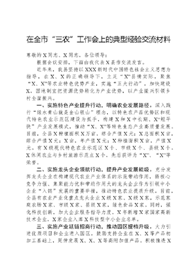在全市三农工作会上的典型经验交流材料尊敬的X同志、X同志,各位领导:根据会议安排,下面由我代表X县作交流发言。近年来,我县坚持以XXX新时代中国特色社会主义思想为指导,在X、X的正确领导下,立足X县情实际,聚焦X、X等农业特色优势产业,实施五大行动,加快建设X,因地制宜把资源优势转化为产业优势,以产业振兴引领乡村全面振兴。一、实施特色产业提升行动,明确农业发展路径。深入践行绿水青山就是金山银山理念,以特色农产品优势区和现代特色农业示范区建设为抓手,构建X和X中长期、X短平快产业发展模式,推动X、X等特色生态产业高质量发展。目前,全县X种植面积X万亩,综合产值X元;X总面积X亩,综合产值X元;X亩,年产值X元;X种植面积X亩,产值X元。有X级现代特色农业示范区X个、市级X个、县级X个。X休闲农业与乡村旅游示范点X个,先后获评为X、X等荣誉。二、实施龙头企业领航行动,提升产业发展能级。充分发挥龙头企业在构建现代农业产业体系的示范带动作用,将核心竞争力强、集聚能力优和带动作用大的龙头企业作为引领中小企业入链发展的重要举措,推动特色农业提质升级。目前,全县有农业产业化重点龙头企业X级X家、X级X家,示范家庭农场X家、市级X家、县级X家,绿色食品X家。同时,强化科技创新,加大企业服务指导力度,X年新增X家国家高新技术企业,X家企业入库X科技型中小企业名单。三、实施产业延链招商行动,推动园区提档升级。大力引进优质项目和企业进入园区,鼓励支持企业在X、X等产品初加工基础上,延伸发展X、X、X等高附加值产品。积极推进X项目建设,X年新建标准化加工厂房X个,新增面积X平方米,X入选X。坚持把农业和农产品加工项目招商作为推动高质量发展的强大引擎和重要支撑,坚持走出去和引进来相结合,实施产业链招商和以商招商模式,X新签约特色农业招商项目X个,引进外部资金X元。四、实施优势品牌培育行动,打造区域公共品牌。充分发挥X作为X字号X作用,制定地方性法规《X》,出台《X》等标准文件,不断规范特色产业品牌建设。结合X资源特色、品质特色、功能特色和文化内涵,着力打造X区域公用品牌。积极参加X产品推介活动,全面打响X品牌,X牌X系列产品获得X。X家企业和X个产品分别入选X农业品牌目录和产品品牌目录。五、实施营销渠道拓宽行动,补齐产业发展短板。积极开展农特产品推介活动,建设X培育基地,推动电商+农产品发展,X入驻供应商X家,销售金额X元,排名X。开展X和X推介,帮销农畜牧产品和特色手工艺产品X元。聚焦产业帮扶和消费帮扶,X采购和帮销X农特产品X元,特别是在XX专场直播中,X个小时帮助X带货X元。下一步,X将坚定不移以XXX新时代中国特色社会主义思想为指导,深入贯彻落实X、X农村工作会议精神,坚持把农业高质量发展作为主攻方向,大力实施特色产业提质行动,积极做好土、特、产文章,促进实体经济健康发展,为推进中国式现代化X实践贡献X力量。