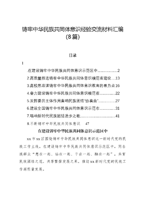 铸牢中华民族共同体意识经验交流材料汇编(8篇)目录1.在建设铸牢中华民族共同体意识示范区中..22.高质量推进铸牢中华民族共同体意识模范省建设..133.高校思政课铸牢中华民族共同体意识教育的着力点164.奋力建设铸牢中华民族共同体意识模范省225.发挥委员主体作用奏响民族团结协奏曲..276.建设全国铸牢中华民族共同体意识示范市317.唱响新时代民族团结进步之歌..418.不断铸牢中华民族共同体意识47在建设铸牢中华民族共同体意识示范区中xx市xx区围绕铸牢中华民族共同体意识这一新时代党的民族工作主线,在建设铸牢中华民族共同体意识示范区中,同各族群众想在一起、站在一起、干在一起、融在一起,共育民族团结之花,共享繁荣发展之果,推动xx新时代党的民族工作高质量发展。一、想在一起,凝聚思想共识,汇聚建设合力建立工作机制。将铸牢中华民族共同体意识教育纳入干部教育、国民教育、社会教育全过程。制定《xx区建设铸牢中华民族共同体意识示范区实施方案》,成立工作领导小组,定期研究和解决工作中遇到的难题。将XXXXXX关于加强和改进民族工作的重要思想,中央、省委、xx市委民族工作会议精神纳入各级党委(党组)理论学习内容,把铸牢中华民族共同体意识工作纳入党的建设和意识形态工作责任制。夯实思想基础。将铸牢中华民族共同体意识纳入xx区委党校、xx区社会主义学院课程体系,组织开展x期相关培训,共千余人参训。在全区xxx所中小学及幼儿园推动铸牢中华民族共同体意识进课堂、进评价体系工作,开展主题教育实践活动、五旗五徽五认同教育活动等进校园xxx余场(次)。按照月月有主题、月月有精彩的工作思路,组织开展铸牢中华民族共同体意识主题系列活动xxx场次,夯实铸牢中华民族共同体意识的思想基础。推进示范创建。完成xx等xx个民族团结进步示范点建设,并积极申报创建省级示范单位,xx区xx镇、xx区第一高级中学被省民宗委命名为xxxx年度全省民族团结进步示范区示范单位。xx区第十一中学入选xxxx年xx省铸牢中华民族共同体意识教育示范学校建议名单。二、站在一起,改善民生福祉,共筑幸福家园办好民生实事。xx区民生支出占一般公共预算支出比重逐年攀升,为民办十件实事全面完成。推动一圈两场三改,城市品质颜值持续提升,城市魅力更加彰显。提高五治工作的针对性和实效性,加快补齐工作短板弱项,真正把农村五治工作做到群众心坎上,共筑幸福家园,让群众得到更多实惠。深化政务服务改革。推动xx分钟政务服务圈建设,全面落实政务服务一表办、一网办、一窗办、一次办、一站办,让群众在家门口就能办成事。xxxxx群众诉求答复率、满意率均达xxx%。加强x商易招商易平台推广和应用,优化六大服务套餐内容,畅通政企沟通渠道,打造一流营商环境。发挥法治保障作用。纵深推进依法治区及法治政府建设,全力推进行政诉讼两降一保攻坚行动,扎实做好行政诉讼案件诉源治理,不断优化公共法律服务体系,推动普法宣传教育走深走实,切实提升基层治理体系和治理能力现代化,发挥法治建设的保障作用,使法规实施得到切实的保障。三、干在一起,聚焦民族特色,提升群众获得感持续打造民族特色村寨。整合民宗、农业农村、住建、生态等部门力量,积极争取各类资金推动民族聚居村寨的基础设施提档升级。完成xx民族团结示范村寨一期建设项目。在基础设施完善、和美乡村建设、产业植入等方面进行统一规划、业态植入,推动xx村建设民族特色村寨,持续改善民族聚居村寨群众生产生活条件,不断提升群众获得感。持续挖掘民族文化资源。对苗绣、蜡染等民族文化资源进行深入挖掘、收集和整理。扶持民族聚居村寨建设非遗展览陈列室,鼓励非遗传承人、民俗工艺传承人开设乡村记忆工坊等传承工作室。围绕翁井村、毛栗村、长冲村民族传统手工技艺,协调相关部门积极申报各归口有关资金、引入社会资金,打造了一批民族文化创意产品和优质品牌商品。着力打造xx民族特色村寨的旅游精品路线。四、融在一起,共建互嵌社区,共享精神家园共建互嵌社会结构。实现城镇、乡村基本公共服务共建共享、基础设施互联互通。发挥基层党建引领作用,加大对xx等社会民间公益组织的扶持。落实就业帮扶、户籍管理、权益保障等措施,引导各族群众在不同行业、不同层次工作中更好地就业发展,共建互嵌式社会结构,促进各民族交往交流交融。实施三项交流计划。开展xx·塔城一家亲暨红石榴夏令营活动及跨区域学生夏(冬)季农训营、xx民族传统手工艺领军人才传承创新培训班、青