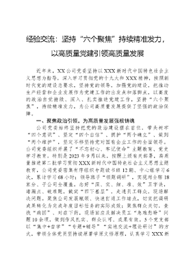 经验交流:坚持六个聚焦持续精准发力,以高质量党建引领高质量发展近年来,XX公司党委坚持以XXX新时代中国特色社会主义思想为指导,深入学习贯彻党的十九大和XXX精神,按照新时代党的建设总要求,坚持党的领导,加强党的建设,把推动生产经营和企业发展作为党建工作的出发点和落脚点,以高度的政治自觉持续、深入、扎实推进党建工作,坚持六个聚焦,持续精准发力,为公司高质量发展提供了坚强的政治保障。一、聚焦政治引领,为高质量发展强根铸魂公司党委始终坚持把党的政治建设摆在首位,带头树牢四个意识、坚定四个自信、拥护两个确立、做到两个维护,坚定不移坚持党对国有企业工作的全面领导。公司党委组织开展了不忘初心、牢记使命主题教育、党史学习教育。特别是2023年9月以来,按照上级有关部署,高质量推进第二批学习贯彻XXX新时代中国特色社会主义思想主题教育,公司党委密集有序组织专题读书班12期、中心组学习6次,累计学习68小时;领导班子领题调研,实现对全辖18家分、子公司全覆盖。念好深、实、细、准、效五字诀,堵漏点、破难题,做实四下基层,走进员工群众,现场解决问题。聚焦公司发展瓶颈、快速打通工作堵点,切实把调研成果转化为完成年度目标任务的实际成效;聚焦群众关切,查找病因、对症下药,现场回应及解决员工急难愁盼问题10余项,做到作风扎实、群众认可、成果有效。5个党支部以集中+自学专题+辅导实地交流+理论研讨的方式,带领全体党员坚持读原著学原文悟原理,认真学习XXX新时代中国特色社会主义思想,严格贯彻党的XXX精神,坚持用党的创新理论武装党员,突出政治教育和政治训练,补充红色钙质,坚定理想信念。通过实地参观延安革命纪念馆、北大红楼、中国共产党历史展览馆、浙江革命烈士纪念馆、林则徐故居及乌兰夫纪念馆等红色教育基地,品读革命历史,感悟红色情怀,传承红色基因;通过党员走上台活动、业务骨干党员讲党课、党员业务攻关、支部共建等党建活动,搭建起共建互促、优势互补的党建交流平台,切实提高了政治站位、增强了政治能力、涵养了政治生态、防范了政治风险,为公司高质量发展奠定了坚实的基础。二、聚焦组织建设,为高质量发展固本培元公司党委认真贯彻落实新时代党的建设总要求和党的组织路线,坚持和加强党的全面领导,提高党的建设质量,推动公司高质量发展。充分结合公司实际,制定落实全面从严治党主体责任清单,切实将涉及的具体任务责任分解,进一步明确党委书记、副书记、党委委员及党的工作部门具体职责任务,压实各级责任;明确党委成员、管理层成员及所属单位负责人一岗双责责任,要求切实履行分管领域党建责任,开展经常性思想教育,抓早抓小,从源头上防止问题出现。公司党委按照两个1%的要求,单独设立党群工作部,配备3名专职党务工作人员,专责抓好党建工作;2023年,根据党建促经营、总分联动、京内京外结合和数量相当的原则,重新调整5个党支部,便于有效联动,消除地域障碍,高效开展支部工作,推动党建与经营工作更好地融合;选优配强党支部书记,明确基层党支部书记为抓党建工作第一责任人,要求党支部书记牢固树立抓好党建是本职、不抓党建是失职、抓不好党建不称职思想;注重选拔政治素质好、熟悉经营管理、作风正派、在职工群众中有威信的党员骨干从事支部党建工作,提高党建文可居文库——海量学习资料,手机电脑均可下载www.wenkeju.com工作水平;加强党建责任制检查考核,开展党支部达标晋级、实现党支部书记抓党建述职评议考核全覆盖,有效压实党建责任;推进基层党建三基本建设与三基工作有机融合,以党员先锋岗为抓手,激发党员在公司经营管理各条战线发挥先锋模范作用;始终把提升党员质量作为发展党员工作的基础,严把入口关、程序关、考察关和责任关,2023年发展党员7名。近年,公司1名党员勇夺集团公司庆祝中国共产党成立100周年知识竞赛桂冠,2名党员、党务工作者受到集团直属党委表彰,4个基层党支部受到上级党委表彰,56名党员、党务工作者受到表彰。三、聚焦人才建设,为高质量发展蓄势赋能公司党委认真落实集团党组和上级党委的决策部署,在人才队伍建设上不断完善体制机制,转变人员观念,激发员工活力,奋力建设高质量、高素质的人才队伍,锻造新时代中坚力量,为公司高质量发展提供强劲动能。大力推进人才强企工程、中长期人才发展规划落地,健全制度保障体系。加速专业人才引进,近5年共招聘员工137人,其中6级以上骨干26人,占新入职员工的19%;选拔、调整中层管理人员82人次,80后中层管理人员21人占比达51%,形成合理的干部队伍梯队;加大高级销售人才、保险经纪、风险咨询、公估、信息技术核心技能人才引进和培养力度,2021年新任领导班子上任以来,提拔管理人员26名。其中