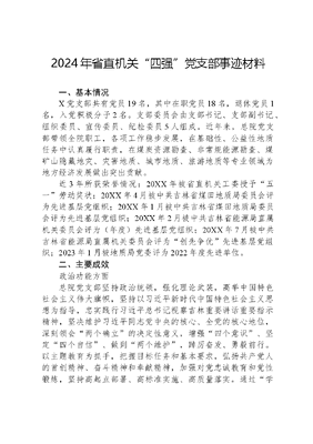 2024年省直机关四强党支部事迹材料一、基本情况X党支部共有党员19名,其中在职党员18名,退休党员1名,入党积极分子2名。支部委员会由支部书记、支部副书记、组织委员、宣传委员、纪检委员5人组成。近年来,总院党支部带领全院职工,各项工作稳步发展,在基础性、公益性地质任务中认真履行职责,在煤炭资源勘查、非常规能源勘查、煤矿山隐藏地灾、灾害地质、城市地质、旅游地质等专业领域为地方经济发展做出突出贡献。近3年所获荣誉情况:20XX年被省直机关工委授予五一劳动奖状;20XX年4月被中共吉林省煤田地质局委员会评为先进基层党组织;20XX年1月被中共吉林省煤田地质局委员会评为先进基层党组织;20XX年2月被中共吉林省能源局直属机关委员会评为(年度)先进基层党组织;20XX年7月被中共吉林省能源局直属机关委员会评为创先争优先进基层党组织;2023年1月被地质局党委评为2022年度先进单位。二、主要成效政治功能方面总院党支部坚持政治统领,强化理论武装,高举中国特色社会主义伟大旗帜,坚持以习近平新时代中国特色社会主义思想为指导,忠实践行习近平总书记视察吉林重要讲话重要指示精神,坚决维护习近平同志党中央的核心、全党的核心地位,深刻领会两个确立的决定性意义,增强四个意识、坚定四个自信、做到两个维护,踔厉奋发、勇毅前行。以主题教育为抓手,把握目标任务和基本要求,弘扬共产党人的首创精神、奋斗精神和奉献精神,加强对党忠诚教育和党性锻炼,坚持高起点部署、高标准实施、高质量落实。通过学思想、强党性、重实践、建新功不断深化主题教育成效,突出党支部政治属性、政治功能和政治任务。总院党支部不断夯实党建基础,推进支部标准化建设,增强组织活力和凝聚力。按照坚持标准,保证质量,改善结构,慎重发展的十六字方针,20XX年来共发展党员5名,为组织吸收了新鲜血液,增添了新的活力。按时缴纳党费,三年共收党费20532元。在省直机关工委开展的争先创优和质量提升工程行动中,对标吉林党支部标准体系(BTX)建设,20XX年、20XX年总院党支部通过省能源局机关党委、省直机关工委考评,达到五星级标准。支部班子方面总院党支部严肃党内政治生活,严格执行民主集中制和三会一课等组织生活制度。2022年9月完成支部换届选举工作,支部委员从3人增加到5人,进一步夯实支部班子建设支部书记积极发挥带头作用,落实岗位职责,发挥专业特长。支部委员主动履职尽责,特别是2023年省能源局机关党委加大纪检监察干部教育整顿,支部委员查短板、找问题,强化学习和岗位职责认知,加强思想淬炼、实践锻炼、专业训练,不断提高政治领悟力和政治执行力,筑牢理想信念根基,坚守理想信仰。总院党支部坚持全面从严治党,持之以恒正风肃纪,认真履行一岗双责,严格执行述责述廉、个人重大事项报告等制度,持续加固中央八项规定精神堤坝,紧盯四风新表现,紧盯重要时间节点,开展正反典型教育。组织支部党员签订党风廉政建设责任书强化党员同志责任意识和担当,扎实推进以案促改警示教育。建立廉政档案7份,落实抓基层党建工作主体责任,以财务管理、物资采购、工程建设、人事任免、干部选拔等为重点,精准掌握相关政策,制定防范措施,保证廉洁从政,廉洁生产。按照大事共议、实事共办、要事共决、急事共商的议事原则,保证党支部议事和决策严格按程序规范运行。坚决防范和杜绝了违纪违法问题的发生,努力营造了总院风清气正的政治生态。党员队伍方面总院党支部党员按照讲政治、守纪律、负责任、有效率总要求,牢记三个务必,理想信念坚定,始终忠诚尽职走在前,奋勇争先作表率。在面对突如其来的新冠肺炎疫情,总院党支部党员快速行动,分别在东光社区等10余个社区开展抗疫工作,主动捐款捐物;结合项目施工特点,在野外施工期间积极与公主岭刘房子街道联系,为地方抗疫贡献力量;在我为群众办实事活动中,支部党员主动到仙台社区认领微心愿服务;组织党员参观四平战役纪念馆、在地质大厦一楼开展党史教育宣传展览、参加解放纪念碑缅怀革命烈士、南湖公园歌唱祖国快闪、在吉林杨靖宇干部学院、红石抗联蒿子湖密营进行党史学习教育、重走抗联路专题培训等丰富多彩的党建活动。在地质局举办的庆祝新中国成立七十周年知识竞赛活动中获得团体第一名;在全国地质勘查行业地质调查员技能竞赛活动中,取得团体、个人吉林省赛区第二名好成绩。培养2名全国优秀地质队员,1名省青年技术能手,5名省国土地质工匠。先后有2名同志获得吉林省五一劳动奖章,1人被省能源局授予基层优秀共产党员。作用发挥方面总院党支部坚持党建工作与中心任务融合发展,以党建统领全局,地勘事业稳步发展,生产经营连续多年完成地质局下达的考核指标。20XX年以来,总院以广域电磁仪为代表的生产性设备其