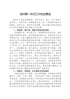 驻村第一书记工作先进事迹X村位于X区X镇西部,全村共X户、X人,村两委成员X人,党员X名,耕地面积X亩,是一个典型的传统农业种植村。驻村以来,始终牢记抓党建、促乡村振兴的职责使命,以实干担当助推X村各项事业全面发展。一、抓基础、重引领,建强支部堡垒筑根基一是建强支部,提升战斗力。坚持硬件软件两手抓,推动基层支部建设标准化、基本制度落实规范化、党组织学习活动开展常态化、后备力量储备培养专业化、党建工作机制创新化,推动派出单位和帮包党组织联学共建,开展庆祝中国共产党成立101周年,庆七一等系列活动,提升基层党组织凝聚力、战斗力和向心力。X村党支部连续两年被X区评为五星级党支部。二是培强队伍,提升组织力。通过建立学习机制、丰富学习内容等形式,重点抓好村两委班子成员、党员和村级后备人才三类重点人群培养,充实年轻后备力量X人,党员X名,发展入党积极分子X人,提交入党申请书X人,激发内生动力,为乡村留下一批本领过硬的人才队伍。三是创新机制,提升凝聚力。探索党员中心户、党员先锋岗、无职党员设岗定责等工作机制,激励党员充分发挥先锋模范作用,提高为民服务本领。成立党员志愿者服务队X支,积极开展志愿服务。X村被授予X年度最美志愿服务村居荣誉称号。二、探路径、强举措,壮大集体经济助增收一是规范集体资产管理,夯实发展基础。全面盘活村级闲置资产,抢抓三资清理、阳光行动契机,收回村集体土地X亩,并根据土地类别以不同价格对外承包实现村集体增收。二是推进党支部领办合作社,激活发展动力。立足耕地资源丰富和毗邻枣庄港区位优势,推进X村养殖种植合作社和劳务合作社扩面提质,开展土地规模化集约化经营、粮食作物全流程托管、物流运输服务,实现村集体增收。三是实施屋顶光伏式发电项目,铸就发展引擎。充分利用光照充足和电网接入条件较成熟等优势,整合各类资金在本村及临近村投资建设分布式光伏发电项目,实现村集体增收。三、惠民生、解民忧,办好民生实事暖民心一是聚焦老有所乐,拓展农村养老服务内涵。X村是有名的长寿村,为解决老年人一餐热饭问题,开办暖心食堂,为75岁以上的老人提供爱心午餐。在暖心食堂周边配套建设老年人娱乐室和日间照料中心,充分满足养老需求。二是聚焦美丽宜居,持续改善人居环境。积极争取各类资金,统筹实施农村污水治理、自来水管网改造、路域环境提升、电力设施改造等七大工程,铺设污水管道X米,改造自来水主管网X米、支管网X米,铺设沥青路面X㎡、硬化路面X㎡、垒砌花池X米、粉刷地漆X㎡,建设文体广场1处X㎡、安装体育器材X件,安装高标准太阳能路灯X盏,美化墙壁X㎡,村容村貌焕然一新,村民生活品质持续提升。三是聚焦弱势群体,开展帮扶走访慰问。重点关注老、弱、病、残、留守儿童等特殊群体的生活状况。争取上级资金X万元,建设农村留守儿童服务站X处。争取棉被、大衣、米、面、油等走访物资累计X余件,常态化走访慰问困难党员群众X余人次。四、讲诚信、弘美德,倡树文明乡风促和谐一是推行信用赋能,建设文明X。探索党建+社会信用+乡村治理模式,研究制定《X村信用积分和信用评价管理办法》和《X村信用信息评价标准》,将诚信涵养融入志愿服务、人居环境整治、移风易俗等基层治理领域,实施积分管理。二是推广全民阅读,建设书香X。围绕塑造乡村文明新风尚,丰富乡村精神文化生活,提升农民文化素养,在市图书馆支持下,打造藏书X册的X区首家村级图书馆,积极开展各类阅读、朗诵活动,引领乡村阅读新风尚。三是推动文化润心,建设美德X。注重传承保护、挖掘利用乡村文化,推进X文可居文库——海量学习资料,手机电脑均可下载www.wenkeju.com剧团民族舞舞蹈队两支民间艺术团队提档升级,在重要节日举办了富有中国传统民俗特色的文化活动,凝聚社会共治力量,构建自治、法治和德治相结合的乡村善治格局。路虽远,行则将至;事虽难,做则必成。作为一名普通的机关干部,能够经历第一书记的淬炼,学习成长,已是一生之荣光;能为乡村振兴尽一份绵薄,做一些贡献,更是一生之自豪。两年的驻村工作,充实而又难忘,让我感到是最光荣、最自豪的事业。今后,我将带着这一份驻村财富,继续砥砺前行、不懈奋斗!文可居文库——海量学习资料,手机电脑均可下载www.wenkeju.com