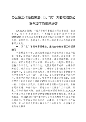 办公室工作经验做法:以实为要推动办公室各项工作提质增效XXXXXX强调:党员干部干事创业必须实事求是、求真务实,来不得半点虚浮。XXX办公室认真学习贯彻XXXXXX关于办公厅工作重要讲话和指示批示精神,坚持以实为要、向实而行、务实作为,不折不扣推动党中央各项决策部署落实见效。一、以实学筑牢思想根基,推动办公室各项工作提质增效一是原原本本学,把深化理论武装作为做好办公室工作的第一需要,持续深入读原著、学原文、悟原理,反复研读、仔细琢磨,深刻把握核心要义、实践要求,确保精准理解、精准落实,真正从思想上正本清源、固本培元。二是及时跟进学,坚持工作学习化、学习工作化,巩固主题教育成果,在服务保障党委、政府落实第一议题、理论学习中心组集体学习中加强学习,在完成综合文稿起草、调查研究等任务中加强学习,在严格落实三会一课、读书班、个人自学等制度中加强学习,紧跟党的理论创新步伐,紧跟党中央最新决策部署,确保在思想上政治上行动上同以XXX同志为核心的党中央保持高度一致。三是融入实践学,弘扬理论联系实际的优良学风,坚持学思用贯通、知信行统一,紧密结合三服务工作实践,聚焦工作中的瓶颈问题,自觉从党的创新理论特别是XXXXXX关于办公厅工作的重要讲话和指示批示精神中找答案、找办法、找路径,把XXX新时代中国特色社会主义思想作为全部工作的科学指引,贯穿和运用到想问题、办事情、干工作的全过程各环节,努力把学习成果及时转化为干好本职工作、推动事业发展的有效招法。二、以实干推动工作落实,推动办公室各项工作提质增效一是在参谋服务中谋实事、出实招,把实事求是、求真务实融入文稿起草、信息报送、调查研究等实际工作中,坚持问题导向、结果导向,用放大镜查找问题,用显微镜分析问题,用望远镜谋划思路,摸实情、讲实话、办实事、求实效,当好党委和政府的千里眼和顺风耳,为科学决策提供第一手资料和最可靠依据。二是在督办落实中做实功、动真格,认真履行抓落实的职责,保持真抓的实劲、敢抓的狠劲、善抓的巧劲、常抓的韧劲,将党中央决策部署和省委、市委工作要求细化实化,分解为项目书责任状,拧紧责任链条,逐项跟踪推进。三是在服务保障中求实效、提质效,在办文办会办事中,注重科学规范,减少不必要环节,做到运转有序、快速高效。在协调运转中,注重听实话、摸实情,为领导决策提供参考。在推进各项工作中,解决好笔宝和桥的问题,既要提出问题,又要提供解决问题的方法,当好黏合剂催化剂,凝聚各方面协调推进的强大合力。三、以实改转变工作作风,推动办公室各项工作提质增效一是实打实整治形式主义,深刻领悟XXXXXX关于整治形式主义为基层减负的重要指示精神,牢固树立和践行正确政绩观,着力解决精文减会、督查检查中存在隐性和显性问题,保持量的刚性约束,推动质的优化提升。完善考核方法,推动从简单考材料、查痕迹向重点考成效、看潜绩转变。二是实打实补齐作风短板,聚焦三服务工作中存在的堵点、痛点、难点问题,学习先进地区经验做法,深入查找思想观念、方式方法、作风形象等方面存在的差距不足,以正视问题的自觉和刀刃向内的勇气,着力在补短板、强弱项上下功夫,能解决的立即解决,一时解决不了的列出时间表限时解决,确保取得实实在在的成效。文可居文库——海量学习资料,手机电脑均可下载www.wenkeju.com三、以实绩检验工作成效,推动办公室各项工作提质增效一是勇于创先争优,始终保持站排头、当先锋的思想自觉和行动自觉,树立一流工作标准、保持一流精神状态,绝不能满足于一般化、过得去。紧盯中心工作,找准三服务工作的切入点、结合点、着力点,争当深化改革、加快发展的尖兵。二是锻造过硬队伍,以提笔能写、开口能讲、问策能对、遇事能办为标准,不断提高干部队伍业务技能,努力打造办文办会办事的行家里手,建设忠诚干净担当的高素质专业化干部队伍,满足三服务工作实际需要。三是建设模范机关,把创建模范机关作为全面加强机关建设的重要抓手,坚持以创促建、以创促改,为高质量、高标准、高效率完成各项工作任务提供重要保障。文可居文库——海量学习资料,手机电脑均可下载www.wenkeju.com