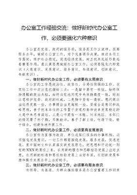办公室工作经验交流:做好新时代办公室工作,必须要强化六种意识办公室是党委、政府的服务部,服务是工作主旋律。提高服务水平,做好办公室工作,对于完善领导决策,推动各项工作落实,维护社会稳定,促进经济发展,树立机关良好形象起着重要作用。我认真要想做好办公室工作,必须要强化六种意识(大局意识、发展意识、服务意识、参谋意识、创新意识、奉献意识)。一、做好新时代办公室工作,必须要有大局意识办公室的工作是政治性、政策性、全局性很强的工作。在实际工作中应注意把握好三点:一是脑中要有一根弦。始终保持清醒的政治头脑,始终自觉地同党中央保持高度一致,时刻注意维护党委、政府的权威。二是胸中要有一盘棋。想问题应当站得更高一些,办事情应当更超脱一些。要有全局意识和战略思维,善于把本单位的工作置于宏观形势和改革发展稳定的大局中来思考谋划。三是心中要有一本账。对本地区、本部门的情况要了然于胸,耳熟能详,善于了解上情,吃透下情,精于结合,创造性地开展工作。二、做好新时代办公室工作,必须要有发展意识办公室作为直接为政府、单位或部门服务的办事机构,必须强化发展意识,一切工作都要围绕发展,服务发展,促进发展。要牢固树立和认真落实新发展理念,把思想和行动统一到党的XXX的要求上来,在用新的理念和思路指导发展上出好主意,在用新的标准和要求检验发展上当好参谋,在创新发展举措和提升发展水平上当好助手。三、做好新时代办公室工作,必须要有服务意识为领导、为基层、为群众搞好服务是办公室重要工作职责做好办公室的工作,必须强化服务意识,提倡奉献精神。服务工作搞得好不好,能不能让领导满意、基层满意、群众满意,是衡量办公室工作的根本标准。这就要求办公室自觉做到标准上求高,措施上求严,工作上务实,不断拓宽服务层面,提高服务水平。一是在为领导服务上要实现三个转变。即:努力实现由处理具体事务向善于谋全局、当高参转变;由满足于做好眼前工作向把握经济社会发展大势、积极做好超前服务转变;由被动完成领导交办的任务向主动提供全方位、多层次的服务转变。二是在为群众服务上要牢固树立群众利益无小事的政治立场和政治态度。把群众的呼声作为我们工作的第一信号,充分发挥办公室作为领导联系群众的桥梁和纽带作用,确保人民群众的意愿能够为领导所了解,确保领导的决策体现人民群众的根本利益。三是在为部门和基层服务上要平等协商,端正态度。对兄弟部门,要相互尊重、相互支持;对基层的同志,要满腔热情,放下架子,坚决克服门难进、脸难看、话难听、事难办的衙门作风。四、做好新时代办公室工作,必须要有参谋意识办公室是一级领导决策的参谋部,办公室的同志都是参谋长。既然是参谋长,就不能混同于一般的小兵,不能只是坐等指示,奉命办事,被动工作,而应围绕中心工作,贴近领导思路,积极做好决策服务。当好参谋应做到四个方面:一要贴近领导,与领导同频共振。想领导之所想,谋领导之所虑,力争谋在关键处,谋在点子上;二要超前运作,不做事后小诸葛。在决策前要提前介入,先行调研,结合实际,提出一些建议和意见,供领导决策参考;决策中,要注意了解社会动向,及时反馈信息,确保决策客观可行;三要敢于进言,善于出谋划策。作为参谋就要敢为领导出谋划策,拾遗补缺,既能发现问题,又善于提出解决问题的办法和建议。当然进言时,要注意方法,不可把自己观点强加于领导,做到献计不决策;四要出于公心,不向领导进谗言。参谋人员文可居文库——海量学习资料,手机电脑均可下载www.wenkeju.com只有出于公心,参谋的东西才有价值。办公室人员切忌出于私心进谗言,这样不仅会导致领导决策出现偏差,而且会影响干群团结,影响领导形象。五、做好新时代办公室工作,必须要有创新意识创新,是一个国家、一个民族、一个单位前进发展的内在动力。创新不是一句空话,要落实到具体工作中。信息调研要密切关注及时反映社会、经济活动中的新观念、新变化、新动向;出谋划策要紧紧围绕中心和人们关注的问题,提出新思路、新对策、新举措;督查协调要有新办法、新手段、新途径;在文字工作上要有新思想、新观点、新语言。只有这样,才能提高工作质量和工作效率,更好地发挥办公室的职能作用。六、做好新时代办公室工作,必须要有奉献意识有人把办公室称为不管部,无事不管,无事不问,从年头忙到年尾,常常有假难休,有夜难眠,加班加点,既辛苦又清贫。没有吃苦耐劳的作风,没有无私奉献的精神,是难以做好办公室工作的。办公室人员必须树立不计较个人得失、为事业而献身的崇高精神,要正确处理苦与乐、得与失、个人利益与集体利益的关系,吃苦在前,享受在后,乐于奉献;要不为名利、埋头苦干、任劳任怨;要经受得起各种误解、委屈和挫折,包容得起酸甜苦辣;要有强烈的事业心、责任感和荣誉感,以只争朝夕、无私奉献的精神投入工作。文可居文库