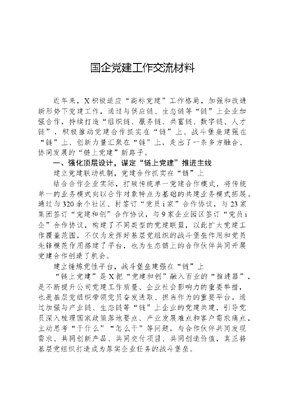 国企党建工作交流材料近年来,X积极适应高标党建工作格局,加强和改进新形势下党建工作,通过与供应链、生态链等链上企业加强合作,持续打造组织链、服务链、共富链、数字链、人才链,积极推动党建合作抓实在链上、战斗堡垒建强在链上、创新力量汇聚在链上,走出了一条多方融合、协同发展的链上党建新路子。一、强化顶层设计,谋定链上党建推进主线建立党建联动机制,党建合作抓实在链上结合合作企业实际,打破传统单一党建合作模式,将传统单一的业务模式向以合作对象特点为基础的共建业务模式拓展。通过与320余个社区、村签订党员i家合作协议,与23家集团签订党建和创合作协议,与9家企业园区签订党员i企合作协议,构建了不同类型的党建联盟,以此扩大党建工作覆盖范围,不仅为发挥好基层党组织的战斗堡垒作用和党员先锋模范作用搭建了平台,也为生态链上的合作伙伴共同开展党建合作创造了机会。建立锤炼党性平台,战斗堡垒建强在链上链上党建是X把党建和创融入百业的推进器,是不断提升公司党建工作质量、企业社会影响力的重要举措,也是基层党组织带领党员奋发进取、担当作为的重要平台。通过加强与产业链、生态链等链上企业的党建共建,引导党员深入梳理国家政策落地要点、产业发展难点和客户需求痛点,主动思考干什么怎么干等问题,与合作伙伴共同发现需求、共同创新产品、共同交付项目、共同创造价值,真正将基层党组织打造成为落实企业任务的战斗堡垒。建立产业联盟制度,创新力量汇聚在链上积极利用市未来工厂联盟这一党建和创平台,充分发挥好党员先锋模范作用,以标杆企业为样板,积极推进高校、工程服务商、金融机构间的交流与合作,切实解决企业现实问题,构建合作共赢的党建和创未来工厂生态圈。二、聚力打造五链,助推链上党建落地落实按照平台共建、品牌共筑的要求打造组织链一是聚焦规模,提升组织链价值。全面梳理九大行业龙头客户和各级直管客户党建和创清单,打造党建和创共建联盟,形成了以信息共享、互相协作和资源整合为重点的1+NN+1N+N共建模式。同时建立完善共建联盟定期沟通、协同工作的机制,发挥好共建联盟的辐射效应。二是找准领域,实现组织链突破。深度挖掘与组织链共建单位合作潜力,扩大合作范围,增强合作黏性,促进共同利益的持续扩大。三是加强运营,打造组织链招牌。充分发挥党建和创党员i家党员i企等党建共建品牌优势,突破业务合作范围,强化共建品牌对各企业党组织的影响力,持续增强链上党建运营价值。按照心系发展、情为群众的要求打造服务链一是夯实基础,打造统领服务链。结合岗区队建设,有针对性地建设党员示范岗、党员责任区和党员突击队,更大力度地组织党员深入企业一线、深入建设一线,形成党员素质不掉链、服务运转不脱链的全链条管理模式。二是品质提升,打造精准服务链。在智慧社区建设以及家庭、个人客户服务等重点任务上,整合市场、网络等不同专业,分别组建不同的联合服务专班,针对未来乡村、未来社区和智能工厂等重点聚类场景持续开展服务攻坚。三是品牌培树,打造示范服务链。重点聚焦行业龙头客户,评选优秀党员示范岗和业务能手,以品牌服务牵引推动实现收入增长、降本增效、品质提升。文可居文库——海量学习资料,手机电脑均可下载www.wenkeju.com按照共享共赢、产业富民的要求打造共富链一是联建共享,打造乡村振兴云大脑。积极发挥数字乡村建设、未来乡村(社区)探索的先发优势,联合320余个合作社区、村开展党员i家合作,让数字经济创新提质一号发展工程推进到社区、惠及到乡村。二是抱团共赢,打造共同富裕新举措。通过加强企业间的业务协作和资源整合,共同开展党员i家·乡村共富优质农产品进社区活动,加大农产品城乡供需对接力度,打通农产品销售绿色通道。截至目前,党员i家·乡村共富优质农产品进社区活动已在X个区县的多个社区铺开,线上线下已累计举办活动70余场,共上架农特产品超100种,累计销售额超200万。三是多向发力,打造精准帮扶新成效。充分发挥产业链优势,汇聚科研院所、企业等各方资源,借助人才、资金、技术等帮扶举措,推进经济薄弱村的结对帮扶。按照产业融合、数智赋能的要求打造数字链一是强化落地,全面提升行业价值。与行业龙头客户开展的数字链和创活动,在5G、新基建等重点领域先行先试。二是强化融合,全面提升客户价值。牵头成立了市未来工厂联盟党建和创平台,为企业提供标准化、通用型、低成本的数字化转型解决方案。三是强化支撑,全面提升公司价值。通过数字链和创活动,积极推广更有影响力的链上党建品牌,落地更高质量的项目,锻炼更高水平的发展能