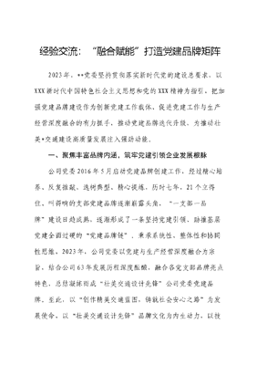 经验交流:融合赋能打造党建品牌矩阵2023年,**党委坚持贯彻落实新时代党的建设总要求,以XXX新时代中国特色社会主义思想和党的XXX精神为指引,把加强党建品牌建设作为创新党建工作载体、促进党建工作与生产经营深度融合的有力抓手,推动党建品牌迭代升级,为推动壮美*交通建设高质量发展注入强劲动能。一、聚焦丰富品牌内涵,筑牢党建引领企业发展根脉公司党委2016年5月启动党建品牌创建工作,经过精心培养、反复推敲、选树典型、精心提炼,历时七年,21个立得住、叫得响的支部党建品牌逐渐崭露头角,一支部一品牌建设日趋成熟,逐渐形成了一条坚持党建引领、助推基层党建全面过硬的党建品牌链。秉承系统性、整体性和协同性思维,2023年,公司党委以党建与生产经营深度融合为宗旨,结合公司63年发展历程深度酝酿,融合各党支部品牌亮点特色,总结凝练而成壮美交通设计先锋公司党委党建品牌。至此,以创作精美交通蓝图,铸就社会安心之路为发展使命,以壮美交通设计先锋品牌文化为内生动力,以技术领先化、管理高效化、服务集成化、产品数智化为导向的党建品牌矩阵初现雏形,形成了1+N党建品牌核心,实现品牌效益横向到边、纵向到底、覆盖全域,不断筑牢党建品牌建设强健生长根脉。二、聚焦品牌培育管理,激发基层党建工作活力公司党委着力强化品牌创建的谋篇布局,对重点培育的党建品牌进行实时跟踪、及时反馈、强化提升,以党建品牌建设激发基层党建工作活力。1+N融合赋能,激发党建品牌矩阵发展力。坚持统筹规划,加强顶层设计,精心制定壮美交通·设计先锋党建品牌创建方案。通过开展深化党建品牌创建专项工作,指导各党支部充分结合公司党建品牌方案内容,进一步深化支部党建品牌内涵,通过支部品牌升级达成主品牌+子品牌协同联动的良好效应,进而通过深度发挥品牌作用凝神聚力,切实做到党建品牌矩阵质量和效能双提升。丰富建设路径,深耕厚培全面强化品牌意识。近三年,公司党委通过选育、宣传、表彰等方式多渠道多种类开展党建品文可居文库——海量学习资料,手机电脑均可下载www.wenkeju.com牌建设工作。2016年起每年不定期,公司召开党建品牌展示评比交流会、优秀党建品牌经验分享会、说出你的品牌故事演讲比赛等,搭建党支部间相互学习借鉴的平台,厚植品牌创建意识,营造比、学、赶、超的干事创业氛围。通过重点培育与支部所辖部门、子公司主业专业融合度高,坚持党建引领促生产经营成效明显的支部品牌向上级党委推荐,推动支部品牌影响力带动部门、子公司专业技术服务取得更大更深远的社会效应和经济效益。细化管理模式,以品牌效应检验支部工作成果。公司党委始终致力于把党建工作融入生产经营,将品牌创建引领经营成效纳入年度大党建考核指标,充分发挥考核风向标作用,鼓励基层党支部不断加强支部标准化规范化信息化建设,创新党建工作模式,配齐配强党务工作团队,进一步激发企业经营能动性。要求各党支部品牌建设有LOGO、有创建方案、有特色活动支撑,逐年深化支部品牌内涵,积累建设经验,实现提炼总结升华。通过党建品牌创建与业务品牌打造工作有机结合,持续丰富党建品牌文化亮点,影响支部党员、职工立足岗文可居文库——海量学习资料,手机电脑均可下载www.wenkeju.com位创先争优,形成昂扬向上、拼搏奋进的支部文化氛围,以先锋旗帜力量凝聚人心,促使更多精品工程不断涌现。三、聚焦党建经营深度融合,释放党建品牌效能价值公司党委围绕新时代党的建设新的伟大工程,树立融入业务抓党建、抓好党建促业务的一盘棋思维,推动党建工作与生产经营相融并进、同向发力。先锋力量助力打造先锋工程。始终以抓好党建促生产作为鼓励各党支部做好党建工作的指导思想,激励党员干部做表率、亮身份、挑担子,依托公司桥梁、水运、数字、道桥等生产部门党支部的特色党建品牌建设,由党员带头组建党员突击队,发挥党建带团建作用,组建青年突击队,高质量完成世界第一拱平南三桥、世界上最大跨径劲性骨架混凝土拱桥——天峨龙滩特大桥、贺州至巴马高速公路、荔浦至玉林高速公路、柳州(鹿寨)至南宁高速公路改扩建工程、老挝万万高速公路等一系列精品工程设计。承担新时代国字号工程平路运河第五标段两阶段勘察设计,并依托该项目参与交通运输部和*交通运输厅、科学技术厅等主管部门文可居文库——海量学习资料,手机电脑均可下载www.wenkeju.com的各类课题、指南研究近10项,编制地方标准获批立项2项。截至目前,*交通设计集团党委共组建有党员突击队33个、党员集体示范岗31个、党员示范岗98个、青年突击队14个,真正实现了哪里有党组织哪里就有先锋工程,为生产经营注入强大红色动力,助推党建与生产经营双融双促、深度融合。勇担急难险重任务彰