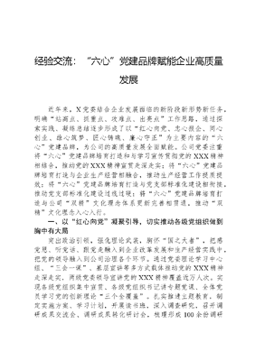 经验交流:六心党建品牌赋能企业高质量发展近年来,X党委结合企业发展面临的新阶段新形势新任务,明确站高点、抓重点、攻难点、出亮点工作思路,通过探索实践、凝练总结逐步形成了以红心向党、忠心报企、同心创业、雄心筑梦、匠心铸魂、廉心守正为主要内容的六心党建品牌,为公司的高质量发展全面赋能。公司党委注重将六心党建品牌培育打造和与学习宣传贯彻党的XXX精神相结合,推动党的XXX精神宣贯走深走实;将六心党建品牌培育打造与企业生产经营相融合,推动生产经营工作提质提效;将六心党建品牌培育打造与党支部标准化建设相衔接,推动党支部标准化建设过线过硬;将六心党建品牌培育打造与公司双精文化理念体系更新完善相贯通,推动双精文化理念入心入行。一、以红心向党凝聚引导,切实推动各级党组织做到胸中有大局突出政治引领,强化理论武装,胸怀国之大者,把感党恩、听党话、跟党走融入到企业改革发展和生产经营实践中,把党的领导融入到公司治理各个环节。通过党委理论学习中心组、三会一课、基层宣讲等多方式载体推动党的XXX精神走深走实,两级党委领导宣讲党的XXX精神覆盖近万人次。实现各级党组织集中宣贯、各级党组织书记讲专题党课、全体党员学习党的创新理论三个全覆盖。扎实推进主题教育,制定实施方案、学习计划,开展读书班,深入调查研究,召开调研成果交流会、调研成果转化研讨会,梳理形成100余份调研报告169个问题400多条整改措施。对照四个有没有标准,严格落实第一议题制度,推动制度落实由有没有向实不实、优不优转变。2022年以来组织召开38次党委会、22次党委理论学习中心组集体学习研讨,学习研讨XXXXXX有关讲话和指示批示精神219篇,汇编学习资料86万余字,全局共享、上下贯通、一体落实。双引双建多项亮点工作和特色做法在外媒得到宣传展示。修订完善了《党委议事规则》《三重一大决策办法》,并明确考核标准、形成落实模板、压实各级责任,把方向、管大局、保落实领导作用有效发挥。党委在集团党委党建责任制考核中连续两个年度获评优秀。二、以忠心报企凝聚引导,切实推动各级党组织做到爱企有行动加大公司十四五战略规划宣贯力度,实现三个管理层级宣贯全覆盖,持续强化战略引领。总结凝练并持续完善双精企业文化体系,制作文化手册,开展文化上墙,深入一线宣讲,推进六心入脑入心。牢固树立富强 职工安康的人本理念,营造职工爱企如家、爱岗敬业氛围,厚植感恩企业、忠诚企业、回报企业情怀,成为推动高质量发展的强大精神动力。公司党委组织开展再创业,让强大!解放思想大讨论活动,公司本部、二级单位和项目部三级组织讨论全覆盖,举办主题讨论260余场次,形成心得体会、思想交流等逾百万字。通过讨论解放思想、迸发活力、凝聚共识,以大讨论促进大解放、以大解放推动大转变、以大转变助推大发展。先后多次组织不同层级晒疤会务虚会反面案例剖析会,推动解放思想在公司广大党员干部职工中持续走深走实。成功举办了庆祝建局65周年系列活动,凝聚全体干部职工回顾光辉历程、展望美好前景、共筑强企之梦。通过活动开展,员工对的认同感和归宿感普遍提高、文化对的驱动力和引领力更加凸现、社会对的关注度和美誉度显著提升。文可居文库——海量学习资料,手机电脑均可下载www.wenkeju.com三、以同心创业凝聚引导,切实推动各级党组织做到奋斗有成效党组织持续教育引导广大党员干部争做胸怀伟业守初心、忠诚企业担使命、干事创业当先锋、勤勉敬业做表率、聚焦主业显作为、廉洁从业强作风的六业干部。六业干部是六心党建品牌落地的重要支撑,是落实国企好干部20字标准的重要体现,是新时代水电党员干部的重要遵循。快速完成了12家分(子)公司领导班子整体换届,总部瘦身健体和总部换届先后高质量高效率推进完成;落实好任期制和契约化管理,举行总部集体签订仪式,层层签订责任书,推动企业中层管理人员和总部员工年度现场述职全覆盖;干部人才队伍质量与结构不断优化,修制订了涉及选送优秀青年干部到公司总部和重大项目重要岗位学习锻炼、干部挂职锻炼和领导人员考评不胜任退出、领导人员管理规定等一批干部选用育管制度,五型总部建设持续推进,人才红利持续释放。党建工作聚焦四大主业,围绕高质量履约主题,在全公司范围开展了西藏DG水电站建设先进经验集中宣讲活动,树立了项目全生命周期管理的标杆与样板。推动西藏DG水电站和派墨公路、贵州数博万达城市广场、广东石马河水环境治理等一批社会关注度高、行业影响力大的重点项目良好履约。四、以雄心筑梦凝聚引导,切实推动各级党组织做到干事有目标党委明确了推动高质量发展、建设现代化强企这一发展目标。坚持目标引导,保持战略定力,按照主