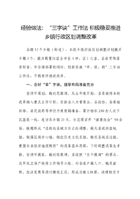 经验做法:三字诀工作法 积极稳妥推进乡镇行政区划调整改革县辖13个乡镇(街道),本轮乡镇行政区划调整计划撤并乡镇3个,撤并数量位居全市县(市、区)之首。县在贯彻落实好省、市安排部署的同时,创新实施早、统、稳三字诀工作法,平稳有序推进改革。一、念好早字诀,提早布局准备充分坚持早谋划,做到思路清。从去年底开始,县委就将本轮改革纳入重点工作日程,安排县人大常委会、县政协、县委组织部、县民政局等单位开展前期准备,累计组织200余人次下沉基层一线,走访各乡镇35天,小范围召开诸葛亮会90余场,梳理形成总体向县城方向正向调整、做大县政府驻地镇、做强区域中心镇、做优历史文化名镇、做实县域沿边镇、重塑全县经济地理版图的改革基本思路,下好调整改革先手棋。坚持早摸底,做到底数清。县按照五个摸清的要求,及早成立清产核资工作领导小组,对全县户籍人口、幅员面积、经济发展等进行摸底汇总,形成台账130册,清理核实乡镇(街道)实物资产45万余宗。今年6月初,县委书记、县委组织部部长分别对乡镇党委书记、乡镇其他领导班子成员一对一谈话,县委组织部牵头开展乡镇领导班子综合分析研判调研,从思想上打牢调整改革强基础。坚持早论证,做到情况清。委托中国社会科学院牵头组成43人的专家团队,针对乡镇科级干部、一般干部、群众等群体,以乡村振兴为题分别设置访谈问题,累计走访干部群众9000余人、发出收回调查问卷7000余份,形成了详尽充分的论证报告,从策略上打好调整改革主动仗。二、念好统字诀,统合力量助力改革坚持统一领导,牢牢掌握主导权。成立以县委书记为组长的调整改革领导小组,组建综合部门牵头的综合协调、机构设置和干部安置、债权债务和国有资产处置等7个专项工作组,抽调精干力量118人(涉改乡镇前任主要领导67人)组成县领导挂帅的23个督导组,形成县委抓总、政府负责、部门牵头、分类指导的领导格局。坚持统分结合,广泛凝聚正能量。按照分层分类原则,分县、乡镇、村社三个层级召开调整改革工作文可居文库——海量学习资料,手机电脑均可下载www.wenkeju.com会和业务培训会,分系统召开部分人大代表、政协委员、老干部会议,切实做到三个不发生、两个确保。层层召开会议1200余场次,座谈走访老干部、在职干部、普通群众、工商界、社会组织代表3万余人次,各涉改乡镇还通过微信等新媒体向流动党员、在外乡友、农民工代表等发送信息2万余条,广泛征求意见,完善改革方案。坚持统筹兼顾,科学制定总方案。县在设计区划调整方案时,既立足产业分布、资源禀赋,又考虑交通布局、水系流域,更展望发展前景、经济流向,实现天时、地利、人和的有机统一。坚持中心城区、交通干线低密度布局,做大县政府驻地镇、区域中心镇9个,相应撤并调整乡镇11个,打造县域发展主干;坚持县域沿边高密度布局,成建制保留沿边乡镇8个,打造县域治理前沿;坚持加强文化遗产保护传承,做优历史文化名镇2个,打造县域文化名片。三、念好稳字诀,措施有力平稳推进全方位排查风险,精准管控重点人群。乡镇区划调整改革之初,县就逐一摸排乡镇干部、项目业主、市场主体和重点信文可居文库——海量学习资料,手机电脑均可下载www.wenkeju.com访对象等重点人头,掌握利益诉求和信访动向,建立风险清单,逐一明确措施,分类化解销号。针对在外X籍成功人士,落实县领导和乡镇党委书记电话、微信联系,沟通感情、疏导情绪、引导预期。全天候监测舆情,精准把握社会舆论。坚持内宣外宣结合、线上线下并联,组建宣传和舆情管控组,落实专人监测舆情并落实日报制,及时掌握网络舆论动态。加强属地各类网络平台监管,专门召集活跃微信群、QQQ等群主30余名召开专题会,宣传政策、宣讲法规,坚决查删各类不实涉改信息,形成正向舆论场。全过程监督指导,精准落实法定程序。按照法定程序不减、规定动作必做的原则,23个督导组放下原单位工作,全面进驻乡镇,开展征集意见、综合协调、联系指导、政策解读等工作,面向信访群众,坚持讲感情、讲法纪、讲程序、望前景的三讲一望,有效化解信访矛盾,赢得了群众支持。文可居文库——海量学习资料,手机电脑均可下载www.wenkeju.com
