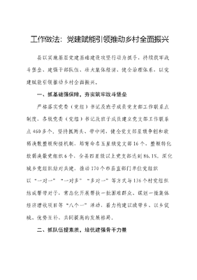 工作做法:党建赋能引领推动乡村全面振兴县以实施基层党建基础建设攻坚行动为抓手,持续筑牢战斗堡垒、建强干部队伍、壮大集体经济、健全治理体系,以党建赋能引领推动乡村全面振兴。一、抓基础强保障,夯实筑牢战斗堡垒严格落实党委(党组)书记及班子成员党支部工作联系点制度,各级党委(党组)书记及班子成员建立党支部工作联系点460多个。坚持抓两头、带中间,健全党支部星级争创和软弱涣散整顿衔接机制,培育命名五星级党支部16个,整顿转化软弱涣散党组织6个,全县四星级以上党支部达到86.1%。深化城乡党组织结对共建,推动170个市县直部门单位党组织以一对一一对多多对一等方式与136个村党组织结成帮带对子,常态化开展帮扶一批困难群众、谋划一批集体经济增收项目等八个一活动,着力构建以城带乡、以乡促城、优势互补、共同提高的发展格局。二、抓队伍提素质,培优建强骨干力量建立新任村党组织书记一对一导师帮带培养机制,组织211名村干部和后备干部参加学历提升教育,实现一村一名大学生村干部目标。深入实施双十双百培育计划,评选表扬10名担当作为好支书、20名乡村振兴带头人,大力营造比学赶超、团结奋进的良好氛围。实施人才助力乡村振兴十业百社万才计划,组织10个专家服务团下沉乡村一线指导,促进147名专家人才与62个重点产业基地、乡村振兴示范点结对联姻,培育高素质农民250名,评选乡村工匠240名。三、抓产业促增收,不断激发内生动力持续深化党建引领、村企共建发展模式,连续两年支持25家企业与49个村建立利益联结机制,统筹安排资金扶持63个项目村、薄弱村发展壮大村级集体经济,2023年全县100%的村集体收入达到10万元以上,村均达到21.12万元。深化党建+产业组织振兴模式,采取单独组建、村村共建、指导帮建等方式,组建区域化功能型党组织10个,产业链党组织2个,实现链上资源高效配置、互利共赢。不断强化人才支文可居文库——海量学习资料,手机电脑均可下载www.wenkeju.com撑,采取遴选乡村产业发展人才组团帮扶、选择试点镇村先行带动等形式,顾问团成员每人联系一个镇或一个村定期下沉点对点把脉问诊,吸纳20多名专家人才为发展壮大村级集体经济献智出力。四、抓治理强服务,持续推动基层善治认真落实组织引领、一网统管、常态走访、定期说事、码上响应、接诉即办工作法,制定《党建引领乡村治理工作指南》,通过现场观摩、交流经验、互动提升、探索创新,打造党建引领乡村治理示范镇村8个。全面推行发现、吹哨、报到、会商、办理、反馈、评价民事7步接办工作流程,通过部门领办、会议会商、联合执法等方式,推动形成民情处置闭环管理机制。制定《网格员积分奖励管理办法(试行)》,对网格员日常走访、民情处置、志愿服务等情况采取线上活动积分、线下积分兑换实物或换取服务的方式,有效激发网格员参与基层治理的积极性。文可居文库——海量学习资料,手机电脑均可下载www.wenkeju.com