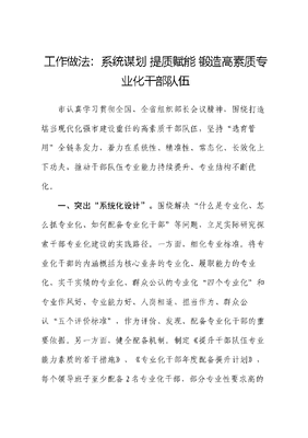 工作做法:系统谋划 提质赋能 锻造高素质专业化干部队伍市认真学习贯彻全国、全省组织部长会议精神,围绕打造堪当现代化强市建设重任的高素质干部队伍,坚持选育管用全链条发力,着力在系统性、精准性、常态化、长效化上下功夫,推动干部队伍专业能力持续提升、专业结构不断优化。一、突出系统化设计。围绕解决什么是专业化、怎么抓专业化、如何配备专业化干部等问题,立足实际研究探索干部专业化建设的实践路径。一方面,细化专业标准。将专业化干部的内涵概括为核心业务的专业化、履职能力的专业化、实干实绩的专业化、群众公认的专业化四个专业化和专业作风好、专业能力好、人岗相适、担当作为、群众公认五个评价标准,作为评价、发现、配备专业化干部的重要依据。另一方面,健全配备机制。制定《提升干部队伍专业能力素质的若干措施》、《专业化干部年度配备提升计划》,每个领导班子至少配备2名专业化干部,部分专业性要求高的单位配备率不少于50%。建立红黄绿动态预警机制,对专业化干部配备率低于50%的挂黄牌,低于30%的挂红牌,在专业化干部配备上优先倾斜,全市范围内统筹调配。二、突出精准化训练。围绕解决专业培训抓手少、抓不实等问题,建立常态化培训赋能机制,让干部在日浸月染、潜移默化中提升专业能力素质。一是抓好部门内训。建立健全部门单位领导干部上讲台、业务科长轮流讲等制度,实行核心业务月讲评、季授课,经常性开展比武练兵、专业知识测评,做到以讲促学、以研促学、以赛促学、以考促学。二是抓好业务专训。聚焦现代化强市建设八大战略,围绕招商引资、经济金融、科技创新等需求,推行课堂选学+思维训练+研讨交流+现场教学+调研实践培训模式,做到干什么学什么、缺什么补什么。三是抓好历练实训。启动实施沂蒙薪火百名优秀年轻科级干部挂职实训工程,健全与国家部委、金融机构互派干部挂职锻炼机制,常态化开展市县骨干双向锻炼、干部助企服务、实战训练营等,在火热实践中增强专业能力和实战本领。文可居文库——海量学习资料,手机电脑均可下载www.wenkeju.com三、突出常态化储备。围绕解决人选从哪里来、怎么发现人选的问题,采取日常掌握一批、年度考核推选一批、重点任务发现一批方式,多渠道发现储备专业化干部。一是考。健全干部专业能力考核评价体系,结合年度考核开展市管干部专业能力专项考核,实行专业能力正反向测评,同步开展专业能力突出干部无任用推荐。二是储。通过谈话了解,综合干部日常表现、工作实绩,分级分类建立专业化干部储备库,指导县区(开发区)抓好专业化干部梯队建设,为专业化干部培养、选拔、使用储备充足人才。三是引。开展专业人才需求情况摸底统计,针对性制定公务员(选调生)招录、事业人员招聘、遴选(选聘)计划。研究制定高层次人才周转编制管理使用办法,实行专编专用、动态管理、人走编收、循环使用,涵养专业化干部一池活水。四、突出鲜明化激励。围绕解决专业化建设被动要求多、主动开展少的问题,加大专业化干部选拔使用和激励约束力度,激发干部内生动力。一方面,匡正用人导向。对实干实绩突出的专业化干部,优先提拔使用、晋升职级。对专业文可居文库——海量学习资料,手机电脑均可下载www.wenkeju.com能力较弱、不适宜担任现职的干部,及时调整岗位;对作风虚浮、不研究业务、分管工作在省对市高质量发展考核中排名末位的,及时谈话提醒;连续2年排名末位的,退出现任领导岗位,倒逼干部比学赶超、创先争优。另一方面,强化典型引领。按照专业作风好、专业能力好、工作实绩好、群众口碑好的标准,评选业务突出好干部,宣传典型事例。引导干部加强在职学习,支持考取教育部认证的本科以上学历学位和国际国内职业资格证书,每年评选100名左右学习型好干部,积极营造学习业务、研究工作、提升能力的浓厚氛围。文可居文库——海量学习资料,手机电脑均可下载www.wenkeju.com