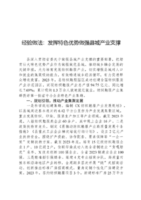 经验做法:发挥特色优势做强县城产业支撑县深入贯彻省委关于做强县城产业支撑的重要部署,把培育壮大特色优势产业作为做强做优县城、推动城乡融合发展的关键举措,大力培育发展纺织鞋服产业,切实增强县城对人口和就业的集聚吸纳能力,有效畅通城乡经济循环,有力促进群众增收致富。2023年,县纺织鞋服园区成功创建全国纺织服装产业示范园区,实现纺织鞋服产业总产值94.75亿元、同比增长7.69%;累计吸纳1.3万余人就地就近就业。纺织鞋服产业集群获评第一批省中小企业特色产业集群。一、规划引领,推动产业集聚发展一是科学规划建集群。编制《X纺织鞋服产业发展规划》,以县城周边基本连片的6.42平方公里作为产业发展集聚区域,重点发展纺织、印染、服装生产加工等产业领域。截至2023年底,入驻纺织鞋服类企业60余户,其中规上企业16户。二是政策扶持育龙头。制定《县推动纺织鞋服产业高质量发展十条措施》《县重点工业企业梯次培优行动计划》,设立2亿元产业扶持资金,围绕扩产提能、协作配套、要素保障等一企一策定制扶持方案。截至2023年底,培育15亿级纺织鞋服企业1户、10亿级2户,佳联印染成功入选全省制造业贡嘎培优名单、X技术创新100强企业、全省2023制造业企业100强。三是精准招引强链条。组建4支专业招商分队,高质量对接东部沿海地区产业转移,全周期多层次开展链式招商活动。创新推出标准厂房招商模式,量身定制个性化厂房建设方案。2023年,签约纺织鞋服项目3个,新建标准厂房25万平方米,12家企业拎包入驻。二、科技创新,赋能产业提质增效一是校企合作共建研发基地。与西安工程大学、X纺织研究院等科研院所合作共建研发平台,联合开展关键核心技术攻关。截至2023年底,成功创建全国专精特新小巨人企业1家,建成省级技术中心4个、工程技术中心1个,获专利授权100余项、国省级科技进步奖10项。二是技改扩能促进转型升级。实施创新引领工程,协助企业申领省市县技改资金,推动企业加快智能化改造升级。引导链主企业入股参与配套企业项目规划建设,全面提升行业技术水平。截至2023年底,园区实施技改扩能项目5个、更新生产线30条。三是数智融合建设绿色园区。建立水土气协同预警智慧平台,对固体废物存放场所、污水排放口、废气排放口实时在线监测、监控,实现环境集中监控与管理。截至2023年底,园区绿色产业企业已达10余家,创建省级绿色工厂2个,获评省级绿色工业园区。三、人才支撑,激发产业内生动能一是构建全方位引才体系。出台《县支持重点产业企业人才队伍建设若干措施》,为企业提供引才策划和经费保障,通过带编入企、开设企业引才专场、柔性揽才等方式,精准招引鞋服纺织人才。截至2023年底,支持纺织鞋服企业成功引进本科和硕士人才60余名,引进行业高层次专家1名、创新团队4个。二是构建全链条育才体系。推行订单式培养,依托X职业技术学校,开设纺织服装专业课程,探索职业学校为企业代加工零部件等校中厂职业教育模式,实现纺织鞋服企业用工需求和学生就业需求无缝衔接。截至2023年底,定向培养纺织鞋服企业专业技术工人6000余名。三是构建全要素爱才体系。实施X州英才计划,细化制定《县柔性引进人才认定支持办法》等具体操作细则,为多名纺织鞋服行业人才发放X州英才卡,提供金融服务、医疗保健、子女就学等12项服务,全力解决人才后顾之忧。文可居文库——海量学习资料,手机电脑均可下载www.wenkeju.com四、环境创优,增强产业发展活力一是创优服务环境。创新建立一站式行政服务窗口和职能部门每周定期到园区集中办理未授权事项工作模式,下放施工许可、竣工验收等27项行政权力,实现企业办事不出园。截至2023年底,为纺织鞋服类入园项目办理各类审批手续200余件,办件周期平均缩短4-5个月。二是创优政务环境。创新开展局长面对面活动,开设行政审批、公共服务、要素保障、金融服务专场活动,邀请工信、财政、交通运输等12个县级部门一把手与纺织鞋服企业面对面交流。2023年,共收集问题20余个,现场解决17个。三是创优法治环境。深入开展清淤治乱·清风护航专项行动,推进法律服务进园区进企业,设立园区企业营商环境监测点,严厉打击侵犯知识产权、制售假冒伪劣商品等违法行为,以法治化营商环境护航企业高质量发展和高效能治理。文可居文库——海量学习资料,手机电脑均可下载www.wenkeju.com