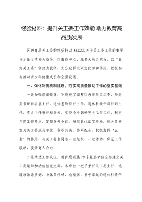 经验材料:提升关工委工作效能 助力教育高品质发展区教育局关工委始终坚持以XXXXXX关于关工委工作的重要指示批示精神为指导,以围绕中心、服务大局为宗旨,以五好关工委创建为载体,充分发挥老同志优势和作用,积极参与推动青少年健康成长和全面发展。一、强化制度机制建设,夯实高质量推动工作的坚实基础一是加强组织领导。不断充实调整区教育局关工委,局党委书记任名誉主任,退休老局长任主任,退休科级干部任副主任,党办主任兼任秘书长。党委会专题研究关工委工作,制定年度工作要点,定期召开会议,研究具体落实举措。机关各科室为关工委成员单位,各尽其责,协同配合,积极发挥五老的作用,与关工委老同志一起组织、一起活动,保证工作联动,提升育人合力。二是精选工作队伍。教育局所属79个基层单位全部建立关工委组织和功能性党支部,各单位一把手兼任关工委主任,选聘政治素质好、身体条件好、有情怀、甘于奉献的退休科级干部任常务副主任。选聘在职中层干部任秘书长,发挥他们与师生接触多、对学生情况掌握全面的优势,切实把关工委工作融入日常、做在经常。三是落实工作保障。各级关工委设置独立办公室,配备办公桌、电脑电话、打印机等办公必需品,创造舒适的办公环境,让老同志们有归属感。局党委坚决落实老同志关工委工作补贴,自2024年1月开始,调整标准,保证按时到位。二、扎实开展主题活动,拓宽学生全面成长的有效路径一是常规活动抓质量。79个基层关工委组织10万余名中小学生参加新时代好少年传承经典·筑梦未来主题教育读书活动,260余件作品获区级奖励,25个单位或个人获市级奖励,教育局关工委获优秀组织奖。组织小学生开展劳动小模范比赛,64件作品获市关工委奖励,10余件作品在市关工委作品专栏展示。二是联办活动抓融合。在第二届金色的信念—社会主义核心价值观手指谣微视频、作文大赛中,30篇作文、17个手指谣微视频获市关工委奖励。联合区关工委开展《讴歌新时代文可居文库——海量学习资料,手机电脑均可下载www.wenkeju.com同心颂党恩》主题摄影作品征集活动,90幅作品获奖并在区图书馆展览,其中包括30幅五老作品和60幅学生作品,充分展现了五育并举教育成果。三、立足学校发展实际,发挥五老作用创特色亮点一是打造精品青少年育才基地。目前我区已整合建成育才基地29个,极大调动了五老的积极性,丰富了青少年课余生活,五老人员根据各自爱好和特长纷纷走进基地,指导学生开展丰富多彩的特色活动。比如X街泥塑艺术育才基地,老同志们的宣讲激发了学生们创作灵感,一批批红色作品纷纷出炉,基地组织编写的《泉尚艺塑》一书,目前已作为X街X小学美术校本教材。二是做实做细五老家庭教育。去年《市家庭教育促进条例》施行后,五老人员立即行动,累计开展宣讲170余场,在宣传条例过程中发挥了积极作用。另外,聘请全国关心下一代先进工作者、全国最美家庭、市首届最美五老、区住建委退休老党员丁俊岩,担任20多所学校校外辅导员,走进学校,开展家庭家风教育。文可居文库——海量学习资料,手机电脑均可下载www.wenkeju.com三是深入开展助学捐赠活动。我们积极配合区关工委,自2012年以来每年开展朝阳工程助学活动。截至去年,共资助品学兼优、生活困难的大中小学生1200人、幼儿园20所,累计捐助善款214万元,以实际行动在全社会营造了良好风尚。2024年,区教育局关工委将全面贯彻落实立德树人根本任务,在全区继续努力创建更多更好的五好关工委,打造特色品牌活动,让关工委事业发光发热。文可居文库——海量学习资料,手机电脑均可下载www.wenkeju.com