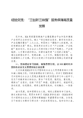 经验交流:三创新三做强服务保障高质量发展近年来,XX党委围绕健康产业重组整合平台和医养健康产业领军企业的定位,确立供应链综合服务、数字技术服务、产业投融资服务三大主业,牢固树立围绕中心抓党建,抓好党建促发展理念,聚焦更好发挥公司产业保障、产业赋能使命定位,结合企业人员相对较少但资产规模大、产业领域新、人才需求高的特点,部署实施党建三创新三做强,通过创新理论学习、党建品牌、人才工作,做强思想引领、组织保障和人才支撑,努力以党建工作创新服务保障公司高质量发展。一、坚持理论学习创新,做强思想引领,以XXX新时代中国特色社会主义思想领航企业发展大力实施XXX新时代中国特色社会主义思想教育培训工程和凝心铸魂工程,不断探索理论学习新形式,将学习XXX新时代中国特色社会主义思想主题教育与党委理论学习中心组学习、党员干部教育培训相结合,紧扣学思想、强党性、重实践、建新功总要求,创新四思举措,把理论学习、调查研究、推动发展、检视整改、建章立制贯通起来,有机融合、一体推进。读书思源,筑牢理想信念之基。制定主题教育学习清单,排定4期读书班,原原本本学习《XXX著作选读》《XXX新时代中国特色社会主义思想专题摘编》等重要理论书籍,全体党员干部通过专题学习研讨进一步坚定理想信念,筑牢信仰之基。开展党建工作科学化、标准化、精细化专题培训,充实党(总)支部书记、专兼职党务工作者理论知识储备,提高党建工作水平。编发主题教育简报,及时传达上级精神,交流工作经验,凝聚思想力量。对标思措,谋划高质量发展之策。坚持问题导向,大兴调研之风,通过设立党建联系点、班子成员现场办公等形式,摸准急难问题,做好调查研究文章。实施对标对表提升工程,班子成员结合工作实际和分管条线明确个人调研课题,制定调研方案和调研清单,深入基层一线,了解基层需求,力争找准问题,提出对策。聘请外部专业机构,对标国内行业头部企业,优化类金融、大宗贸易等业务流程,控风险、提效率。建立调研成果转化运用清单,将调研成果与实际工作紧密结合,建立健康资本数字运营管理平台健康产业供应链管理提升等4项创新举措,根据调研实际制定《关于开展鑫·融党建品牌创建活动提升党建工作科学化标准化精细化水平的意见》《合规管理工作推进实施方案》《市场化协同全员营销工作方案》等制度文件3项,切实解决企业发展中遇到的迫切问题。面题思过,常怀克己自省之心。聚焦中央提出的6个方面问题和省委针对国有企业提出的3个方面问题,聚焦调研发现和巡视巡察、来信来访、督导考核等反馈的具体问题,坚持一把钥匙开一把锁,边学习、边检视、边整改,梳理12个方面15条突出问题。制定主题教育问题清单和靠企吃企、医药领域腐败、基层治理不良现象及不担当不作为乱作为假作为等问题专项整治方案,明确整改时限,实行台账式销号管理。立足实际,持续推动作风转变,组织开展面题思过活动,62名领导干部对照思想品德、素质能力、工作作风、廉洁自律4个方面14条问题自我画像,深刻反思,警示提升,营造人心思进、与人为善、阳光向上、文明和谐的良好政治生态。文可居文库——海量学习资料,手机电脑均可下载www.wenkeju.com见贤思齐,弘扬向上向善之风。组织30余人赴焦裕禄纪念馆开展大力弘扬焦裕禄精神,推动健康资本高质量发展党性主题教育,学英模、强党性。开展发现身边榜样活动,组织开展两优一先评选推荐工作,深入挖掘身边优秀党组织、模范人物,发挥先进典型示范效应,全面激活干事创业热情。二、坚持品牌建设创新,做强组织保障,增强党建工作影响力凝聚力党委以党建品牌建设为抓手,持续全面挖掘党建工作特色亮点,全力打造鑫·融党建品牌,着力构建一个理念、四心(新)、四融、三金1443党建品牌整体框架。通过打造品牌矩阵,筑牢战斗堡垒,丰富志愿服务,为党建品牌增添新的生命活力。培育鑫·融党建品牌矩阵。不断丰富提升鑫·融党建品牌内涵,立足党委、党支部、党员三个层面,着力构建1+9+N金字塔党建品牌矩阵,深入推动9家党支部党建品牌迭代更新,深化培育金算盘金牌销售数字先锋等具有类金融特色的党建品牌。全面推进党支部政治思想引领、规范组织生活、党员创新创效、创造一流业绩、办实事砺作风五个示范建设,广泛开展党员示范工程党员责任区党员模范岗特色实践活动,推动创先争优与企业中心工作、干部人才队伍建设和基层党组织建设有机融合、持续改进提升。权属单位各支部围绕生产经营中心,以目标、责任、计划、步骤、考核、成效六到位为整体目标,审核立项党支部领办创办创新创效示范项目优秀项目9个,融资租赁公司党支部SPV公司跨境租赁项目、大数据公司党支部健康管理企业协同项目作为案例在集团范围内推