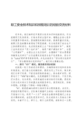 职工安全技术知识和技能培训的经验交流材料近年来,我们始终把开展安全技术知识和技能培训,作为提高职工队伍素质、打造本质安全型矿井、增强企业核心竞争力的重要手段来抓,坚持围绕机制抓创新,提高质量求实效,使职工队伍的整体素质有了明显提高,有力地促进了安全生产工作的顺利进行。先后荣获煤炭工业科技创新矿井、煤炭工业科技进步双十佳矿井、特级高产高效矿井、全国文明煤矿、全国企业文化示范矿、全国煤矿安全思想宣传教育先进单位以及省煤炭系统安全生产先进集体、安全评估AAA级矿井等荣誉称号,并先后被评为安全培训先进单位、安全教育培训优秀单位。我们的主要做法是:一、推行631模式,激活教育培训机制创新是一切工作的动力和源泉。为确保培训计划和任务的有效落实,我们着力在机制创新、狠抓运行上下功夫、做文章。我们在学习先进、不断总结经验的基础上,结合我矿实际,探索运行了631培训模式,这是根据职工不同岗位、不同工种,区分层次、划分类别,分级实施安全培训的运行机制,是把岗位安全技术培训工作的重点放到基层单位,落实到区队、班组和现场,实现重心下移的一种培训模式。6,就是把60%的职工培训任务分配到基层,由区队、班组组织教育培训。区队每月根据矿上的统一安排排定详细的月度培训计划,利用一三五班前安全教育和星期天上安全技术课的时间,由区队党支部书记、队长或技术人员结合工种实际,本着干什么、学什么、精什么的原则,采取每日一主题、每周一案例、每月一测试等方法,进行应知应会知识、煤矿安全法律法规等内容的自培。矿上制定了相关的督察考核制度,职工人人建立了学习笔记,达到了学习时间、人员、内容和质量的四个保证;班组参照区队计划,结合职工工作岗位制定旬培训计划,由班组长或工人技师担任教师,在现场同职工手把手地进行实物安全技能培训。3,就是30%的职工培训任务由矿负责落实。充分发挥三级培训中心的职能作用,在严格按照安全监察局计划指标和规定课时要求,采取电化教育、模拟演示、微机网络教学等现代教育手段,认真对特殊工种进行培训的基础上,坚持对本矿新工人、转岗人员、三违人员、一般工种的定期培训和全员脱产轮训。新工人入矿后,首先进行为期72课时的煤矿法规、职业道德、矿规矿纪、入井须知等井下安全常识和安全防护知识的培训。然后,按照一徒三师的标准人人签订师徒合同,由师傅带入井下进行实践操作实习,满四个月再次培训,考试合格后方可上岗独立作业;凡是调整工作的人员,根据新岗位工种特点确定培训内容,必须进行不少于32课时的转岗培训,不进行转岗培训的,一律不得上岗;每月组织一次违章人员集中培训。所有发生违章行为的职工,除由区队按照程序进行三违帮教外,根据违章性质的不同分类进行24课时的集中培训;对于全员脱产培训,我们按照法规的培训时间要求,采用分期脱产5天的培训形式进行培训,同时导入了16课时的准军事化训练项目,使职工在接受安全理念、法规体系、企业制度、职业道德、应知应会知识、事故案例、事故救护、工程质量标准等安全技术知识教育的同时,受到良好的行为规范训练,全矿x多名职工年年保持轮训一遍。先后组织新工人培训434人次,转岗培训154人次,培训三违人员1476人次;全员培训5239人次。年年超额完成培训计划,期期培训合格率达到98%以上。1,就是将10%的安全管理人员、特种作业人员和青工,文可居文库——海量学习资料,手机电脑均可下载www.wenkeju.com送到上级培训机构和各大院校进行培训教育。矿按年度计划定期组织安全管理干部、特种作业人员接受外委培训学习,2023年至今派送安全管理人员99人次,特种作业人员244人次,输送30多名青工分赴中国矿大、山东矿院等院校进行培训深造。为确保631培训模式的有效运行,我们逐步建立完善起了一整套教育培训精细化管理制度,不断加大责任落实和奖惩考核力度,促进了职工培训工作的健康发展。一是实施教考分离,保证培训质量。我们始终坚持教考分离制度,即培训中心只负责日常教育,安监处负责对职工进行阶段考试,考试不及格的进行补考,一次补考不合格的重新进行培训。并将班级培训合格率直接与包班教师收入挂钩,奖优罚劣。同时,建立了特种作业人员计算机考试局域网络机考程序,实现了出题、阅卷随机自动化,保证了培训考核质量。二是强化监督考核,严格奖惩标准。狠抓日常培训,做到矿考核组根据631实施意见的运作标准和考核要求,每天分三班对区队培训情况进行督查,详细检查区队正职授课、培训内容、参加人数和培训方法等落实情况。每月对三违比率、工程质量、运作记录的培训效果进行一次检查,将日巡查和月检查的考核计分情况,一并纳入季度考核,兑现奖惩。仅今年一季度,就对培训效果好的综采一队、综采二队等8个单位奖励56