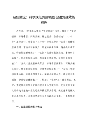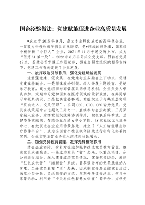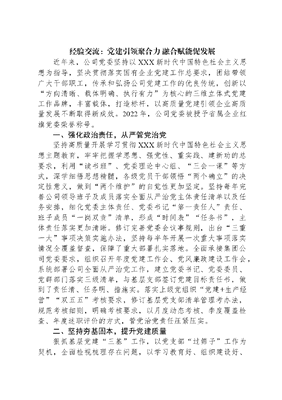 经验交流:党建引领聚合力 融合赋能促发展近年来,公司党委坚持以XXX新时代中国特色社会主义思想为指导,坚决贯彻落实国有企业党建工作总要求,团结带领广大干部职工,传承和弘扬公司党建工作的优良传统,创新以方向清晰、载体明确、执行有力为核心的三维立体式党建工作品牌,丰富载体,打造标杆,以高质量党建引领企业高质量发展不断取得新成效。2022年,公司党委被授予省属企业红旗党委荣誉称号。一、强化政治责任,从严管党治党坚持高质量开展学习贯彻XXX新时代中国特色社会主义思想主题教育,牢牢把握学思想、强党性、重实践、建新功的总要求,利用读书班、党委理论中心组、三会一课等方式,深学细悟思想精髓,各级党员干部领悟两个确立的决定性意义,做到两个维护的自觉性更加坚定。坚持每年完善公司领导班子及成员落实全面从严治党主体责任清单以及任务安排,细化党委主体责任、党委书记第一责任人责任、班子成员一岗双责清单,形成时间表任务书,主体责任落实更加清晰。修订完善党委会议事规则,出台三重一大事项决策实施办法,坚持每半年开展一次重大事项落实情况全覆盖督查,保障了重大部署扎实落地。全面承接集团公司党委要求,组织召开年度党建工作会、党风廉政建设工作会,系统部署公司全面从严治党工作,建立党委书记、党委委员、党群部门落实三级清单,与基层支部签订党建目标责任书,做到了责任清、任务明、措施实。落实上级党组织党建+生产经营双五五考核要求,修订基层党支部清单管理考办法,规范考核细则,明确考核要求,以月度动态考核、季度覆盖检查、年度述职评价的方式,管党治党责任压紧压实。二、坚持夯基固本,提升党建质量狠抓基层党建三基工作,以党支部过筛子工作为契机,全面检视梳理存在问题,以学习教育好、组织建设好、活动开展好、党风廉政好、作用发挥好五好支部创建为抓手,细化措施、整改推进、示范推广,基层工作全面进步、全面过硬。实施党小组+班组党员嵌入工程,把党小组建在班组,让党员、干部、入党积极分子、团青骨干等在各小组合理分布,全面建强基层组织,打通基层最后一公里。对34家支部一支部一特色一品牌创建工作开展评比,通过全面对比分析、打分排名,把成绩靠前的纳入七一表彰评选范围,推动了创建工作提档升级,有力夯实了基础工作。开展支部书记工作论坛,围绕信访、稳定、舆情等难点堵点,模拟情景案例、集体讨论思路、提出解决建议,为基层提升业务能力提供了重要平台。探索建立党建工作室,组建以业务骨干+政工干部为主的研究团队,通过学习培训、技术指导、业务交流等方式,锤炼队伍、提升能力、破解难题。深化党建项目化建设,以部门+支部的形式,开展课题研究,在2022年煤炭企业管理创新优秀成果评选中,4项党建成果成功上榜,其中《围绕三重三搭提升国有企业基层党支部综合能力的探索与实践》荣获一等奖。三、健全制度机制,加强队伍建设认真落实新时期好干部20字标准和国有企业领导干部20字要求,修订完善公司管理人员管理办法,对选拔任用条件、选任方式程序、后备人才培养、纪律监督等方面予以明确,推动干部选拔任用科学化、规范化。出台管理人员末等调整和不胜任退出管理规定,形成了能者上、庸者下、劣者汰的鲜明导向。坚持每月、每季度对干部综合考核评价,对全公司副队以上干部加强监督考核。组织党群业务部门骨干,为新任支部书记手把手传授工作方法和技巧,抽调有经验的副队长,采取一带一方式传帮带,培养生产一线年轻干部,强化了基层管理力量。坚持党管人才原则,通过晨光工作室师带徒、岗位技能竞赛、进队送培等载体,搭建起多层次、多岗位、多领域技能人才培养平台,人才建设更加合理。健全文可居文库——海量学习资料,手机电脑均可下载www.wenkeju.com公司后备干部管理培养体系,建立正职、副职及其他特殊岗位后备人才库,选派经验丰富的一线管理人员,指导帮扶年轻职工成长成才。四、强化正风肃纪,打造清廉国企落实全面建设清廉国企要求,提出清廉国企·廉洁国企建设目标,细化十大行动44项工作安排,成立工作专班,坚持月度动态落实,清廉建设持续深化。加强新时代廉洁文化建设,组织开展清风徐来·廉洁花开廉政主题书法绘画摄影作品展,连续21年开展党风廉政建设宣传教育月活动,通过党委书记、总经理带头讲廉政专题党课,开展线上答题,讲学送考廉政教育,夯实不想腐思想基础。持续开展吃空饷背黑牛专项整治,对收到的信访举报予以处置,对业务部门的核查处理情况严格把关,严厉打击不正之风,不断营造风清气正的环境。聚焦元旦、春节、五一、端午、中秋、国庆重要节日和关键节点,以节前提醒、节中督查、节后通报三步走工作法,纠治群众反映强烈的四风突出问题,坚决筑牢廉洁防线。五