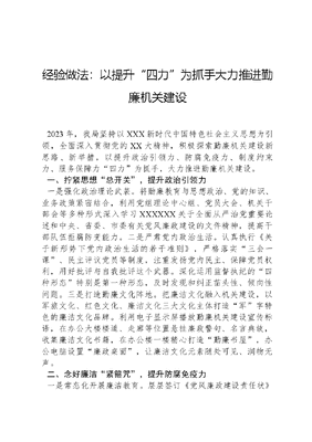 经验做法:以提升四力为抓手大力推进勤廉机关建设2023年,我局坚持以XXX新时代中国特色社会主义思想为引领,全面深入贯彻党的XX大精神,积极探索勤廉机关建设新思路、新举措,以提升政治引领力、防腐免疫力、制度约束力、服务保障力四力为抓手,大力推进勤廉机关建设。一、拧紧思想总开关,提升政治引领力一是强化政治理论武装。将勤廉教育与思想政治、党的知识、业务政策紧密结合,利用党组理论中心组、党员大会、机关干部会等多种形式深入学习XXXXXX关于全面从严治党重要论述和中央、省委、市委有关党风廉政建设的文件精神,提高干部队伍拒腐防变能力。二是严肃党内政治生活。认真执行《关于新形势下党内政治生活的若干准则》,严格落实三会一课、民主评议党员等制度,注重发扬党内民主、保障党员权利,用好批评与自我批评这个武器。深化运用监督执纪的四种形态特别是第一种形态,及时发现和纠正苗头性、倾向性问题。三是打造勤廉文化阵地。把廉洁文化融入机关建设,以军旅文化、红色文化、廉洁文化三大文化主体打造军字特色的廉洁文化品牌。利用电子显示屏播放勤廉机关建设宣传标语,在办公大楼楼道、走廊等位置悬挂廉政警句、名言典故,收集廉洁文化书籍,在办公楼一楼精心打造勤廉书屋,办公电脑设置廉政桌面,让廉洁文化元素随处可见、润物无声。二、念好廉洁紧箍咒,提升防腐免疫力一是常态化开展廉洁教育。层层签订《党风廉政建设责任状》和《廉洁自律承诺书》X份,更新完善干部廉政档案X份,确保全面从严治党各项工作落到实处。开展《涵养良好家风筑牢廉洁防线》廉政党课,及时传达学习X纪委监委关于党员干部违规违纪的通报文件,使党员干部明纪律、知底线。二是发挥红色资源育人功能。充分借助X内独特红色资源优势,利用好X纪念馆、X等红色教育基地,组织机关党员干部参观学习,深切缅怀革命先辈的丰功伟绩。通过沉浸式体验感悟红色文化,增强廉洁自律信念。三是开展多形式警示教育活动。组织党员干部到X廉溪馆接受教育、观看反腐倡廉警示教育片、进一步增强机关党员廉洁从政意识和法纪观念,始终绷紧廉洁这根弦,营造警钟长鸣的廉政氛围。三、筑牢纪律防火墙,提升制度约束力一是全面压实责任链条。健全一把手负总责,分管领导各负其责,各股室负责人齐抓共管的领导体制和工作机制,将党风廉政建设与业务工作同部署、同落实、同检查,每半年召开一次党风廉政建设专题会,分析研判制定党风廉政建设工作。二是完善廉政风险防控机制。认真贯彻民主集中制,落实三重一大事项集体决策制度,主动邀请派驻纪检监察组全程监督,确保决策的科学化、民主化。开展廉政风险大排查X次,梳理存在的薄弱环节和潜在的风险点X个,同时以廉政风险提醒卡的形式张贴在各办公室醒目位置,时刻提醒机关干部注意廉政风险防范,为权力行使安全、资金运用安全、干部成长安全提供有力保障。三是强化日常监督管理。坚持严管厚爱,加强干部八小时外的监督管理,对干部全覆盖开展政治家访。开展六一家庭助廉活动,邀请X名干部子女读廉文,书写廉洁书签,同时发放家庭助廉倡廉书X份,引导干部家属当好守门员和廉内助,通过小家廉洁助推单位清廉。四、锤炼实干硬作风,提升服务保障力一是加强服务建设。组织各乡镇服务专干开展每月工作例会和业务技能大比武,实现服务人员基本情况一口清、业务政策问不倒。局党组定期到服务大厅督查检查及各服务站指导工作,坚决杜绝以权谋私、假公济私、吃拿卡要等问题,确保严格按照工作程序办事,积极践行为退役军人及优抚对象服务承诺,树立公正、清廉的良好退役军人队伍形象。二是优化服务流程。持续推进一件事一次办联办工作机制,针对退役报道、补助发放、社保关系转接等X个方面事项,实行一窗受理,内部流转,一次办结,只跑一次的全流程服务。主动探索完善安置办法,积极协调安置岗位及编制,通过双向选择+跟班见习方式提高人岗匹配度,实现部队、接受单位、安置对象三满意。2023年,圆满完成X名符合政府安排工作条件的退役军士选岗任务。三是强化服务当担。深化我为群众办实事实践活动,积极打造双拥一条街、拥军商城等双拥品牌,发展拥军门店X余家,为广大军人军属、退役军人、优抚对象提供高质量的优惠优待服务。依托X云平台,免费为企业、退役军人搭建供需平台,帮助X余名退役军人及军人家属解决就业。在今后的工作中,我们坚持将勤廉机关建设变成机关党员干部的自觉行动,增强机关党员干部廉洁从政意识,规范廉洁从政行为,引导党员干部发挥先锋模范作用,提升为民服务责任感,切实打造忠诚、廉洁、担当的干部队伍,不断推动退役军人工作高质量发展。