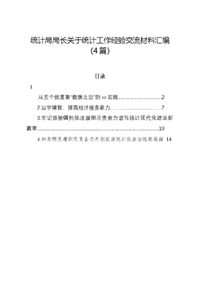 统计局局长关于统计工作经验交流材料汇编(4篇)目录1.从五个维度看数据之治的xx实践.22.以学增智,提高统计服务能力..73.牢记领袖嘱托依法履职尽责奋力谱写统计现代化建设新篇章..104.知责明责履职尽责全力开创依法统计依法治统新局面14从五个维度看数据之治的xx实践新征途号角已然吹响,中国式现代化的画卷正次第铺开。刚刚召开的xx省委xx届x次全会对进一步深化新时代新征程xx现代化建设作出具体部署,xx统计部门要把握规律、把握主动,着力激活改革、开放、创新三大动力,充分发挥政府统计在数据开发、数据共享、数据治理中的牵引作用,为推动国家治理体系和治理能力现代化贡献统计智慧。近年来,xx统计部门始终秉持科学精神和法治理念,以现代信息技术为支撑,以现代统计科学为核心,以统计制度方法为基础,以高质量统计数据为产品,形成具有现代化水平的统计工作体系,更高水平展现中国式现代化xx实践成果,以落实数据之治的实际行动助推xx经济社会高质量发展。维度一:数据采集的科学性与创新性科学性是提高统计数据质量的重要方面。中国统计信息化从19xx年的机械式手摇计算机起步,发展到今天完备的国家统计数据体系;从19xx年的电子计算中心发展到统计数据管理中心;从人工填报数据到当前拥有千亿笔数据的基础数据库;以企业一套表改革为核心的统计四大工程建设到统计云建设,统计生产方式发生翻天覆地的变革。xx统计部门顺应信息技术发展大势,致力于建设获取直接、手段先进、智能便捷、运行安全的统计数据采集与处理系统,目前xx省统计业务专网已实现与国家、省、市、县等各级信息系统的互联互通;建成国家统计联网直报系统xx省节点和省、市统计联网直报系统,为开展人普、农普、经普等大型普查以及地方调查提供技术条件。建成xx省综合统计数据库,运用大数据、云计算建立xx智能普查管理平台,有效赋能四经普,将继续为五经普保驾护航。构建全国首个人口行政资料整理系统,归集多个行政部门数据资源xx多亿条,基本摸清全省x.xx亿常住人口信息。当前,xx正以数字政府和一网统管(xxx)建设为契机,推进统计数据采集、传输、处理、分析、发布全流程的数字化改造,全面推进大数据、遥感等技术转化应用与创新。维度二:服务高质量测度的统计创新与变革立足新发展阶段,必须牢牢把握高质量发展这一首要任务近年来,xx统计部门深刻把握高质量发展的重要论述,不断加强统计监测能力,着力改革创新,加快构建与国家治理体系和治理能力现代化相适应的统计调查体系。聚焦粤港澳大湾区、深圳先行示范区和横琴、前海、南沙等重大合作平台进行监测评价;有效开展高质量发展综合绩效评价,推动数据真实反映经济发展质量变革、效率变革和动力变革进程。推进统计制度方法和调查体系创新,形成一批体现南粤统计的改革措施、案例:不断拓展以统一核算为重点的三大核算改革成果,率先建立xx省新经济统计制度及增加值核算;积极推进x+n统计改革创新,首创分性别统计、双百信心调查,创新一地两统、结果双用工作机制,推进数据生产要素统计核算、数字经济统计监测、电子统计台账、投资当月统计改革等试点工作,共取得xx多项成果;推进七个一基层统计规范化建设,加快形成体系完善、队伍稳定、调查规范、技术先进、保障完备的统计基层基础工作体系;加快构建部门统计数据共享平台和工作机制。维度三:解构立足新发展变化的统计规律与方法新发展理念就是发展的指挥棒,立足新发展阶段、贯彻新发展理念、构建新发展格局,必须遵循科学统计规律提供高质量统计服务。数据时代,经济社会信息瞬息万变,每月每季每年统计监测的数据都在不断变化之中,特别是构成地区生产总值的xx多个基础指标,涉及农业、工业、投资、贸易、服务业等多专业,需要及时监测分析,精准反映经济发展变化规律。近年来,xx统计部门先后撰写《xx》《九表诠数》《xx》《xx》《xx》等xx多篇有深度的季度年度分析,通过由表及里分析数据变化研判经济特征与规律,服务全省经济稳进提质,强化经济运行预测预警。通过宏观快报、签报、统计信息、统计报告等形式,及时向省委、省政府反映经济运行问题与短板。聚焦企业需求,为企业发展把脉问诊,提升企业运营状态诊断精度。组织开展增值税留抵退税、保交楼等快速调查,为省委、省政府及时出台惠企纾困政策提供及时扎实的统计依据。从数库到数库+智库
