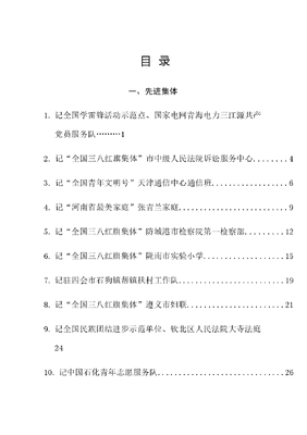 目录一、先进集体1.记全国学雷锋活动示范点、国家电网青海电力三江源共产党员服务队………1 2.记全国三八红旗集体市中级人民法院诉讼服务中心..4 3.记全国青年文明号天津通信中心通信班6 4.记河南省最美家庭张青兰家庭..9 5.记全国三八红旗集体防城港市检察院第一检察部12 6.记全国三八红旗集体陇南市实验小学.15 7.记驻四会市石狗镇帮镇扶村工作队.19 8.记全国三八红旗集体遵义市妇联..21 9.记全国民族团结进步示范单位、钦北区人民法院大寺法庭24 10.记中国石化青年志愿服务队26 11.记河南省巾帼文明岗平燃公司卫东营销分公司.29 12.记全国学雷锋活动示范点南县消防救援大队.32 13.记山西省三八红旗集体浮山县人民检察院第三检察部34 14.记临汾市公安局交警支队女警集体36 15.记全国检察机关集体一等功获得者市人民检察院第一检察部39 16.记全国纪检监察系统先进集体厦门市纪委监委党风政风监督室..42 17.记全国学雷锋活动示范点武警长沙支队望城中队46 18.记全省第三批枫桥式公安派出所北旺庄派出所.48 19.记全国三八红旗集体临汾市公安局交警支队50 20.记全国三八红旗集体市公安局交警支队.52 二、先进个人文可居文库——海量学习资料,手机电脑均可下载www.wenkeju.com21.记全国公安机关成绩突出女民警杨静55 22.记市交警支队仙女湖大队景区中队负责人刘国良58 23.记全省爱警母亲潘慧珍60 24.记江苏最美志愿者张倩倩.62 25.记全国三八红旗手、东华大学纺织学院教授覃小红64 26.记江西省高端会计人才廖志花.67 27.记2023年第四季度中国好人周姿龙..70 28.记中国地质科学院矿产资源研究所所长王登红..73 29.记新时代担当作为好干部提名奖获得者孔伟77 30.记浑江区城南街道党工委副书记樊莹莹..80 31.记长治市交警支队女子铁骑中队中队长宁静.82 32.记新时代担当作为好干部赵振84 33.记新时代担当作为好干部刘锐87 34.记2023山西公安最美基层辅警翟文婷91 文可居文库——海量学习资料,手机电脑均可下载www.wenkeju.com35.记全国岗位学雷锋标兵、太原汇丰派出所综合中队副中队长陈虹92 36.记玉树州玉树市隆宝镇代青村驻村第一书记桑吉卓玛..95 37.记第十批广东省岗位学雷锋标兵黄本洲..97 38.记黄南州泽库县和日镇羊旗村第一书记张文成..99 39.记抚顺市第十八届百姓雷锋张宝付..101 40.记2023年度三农人物、农行贵州安顺平坝支行行长洪明.104 41.记安徽省六安市裕安区人大代表万世东..107 42.记市公安局交警支队直属二大队党总支书记、大队长万鲲109 43.记江麓集团