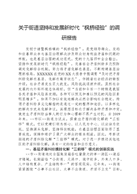 关于街道坚持和发展新时代枫桥经验的调研报告发轫于诸暨枫桥镇的枫桥经验,是党领导群众、发动和依靠群众参与基层治理解决涉及群众切身利益矛盾和问题的样板,也是基层治理的成功范式。党的十九届四中全会指出,坚持和发展新时代枫桥经验,完善社会矛盾纠纷多元预防调处化解综合机制,努力将矛盾化解在基层,不断构建基层治理新格局。XXXXXX在党的XX大报告中强调要及时把矛盾纠纷化解在基层、化解在萌芽状态。伴随着社会经济的转型升级,社会矛盾发生巨大改变,风险挑战逐渐升级,虽然社会发展的内外部环境总体趋好,但当前和今后一个时期是我国各类矛盾和风险易发期,各种可以预见和难以预见的风险因素明显增多,如果不加以有效地解决必然会影响社会稳定。所谓矛盾纠纷多元化解指的是通过一定的程序和途径,以多样化的解决方式来化解争议,其理想目标在于解决各种矛盾和冲突,使发生矛盾纠纷当事人的行为和心理都不再产生对抗。自2019年来,××市以××街道为试点,探索出矛盾纠纷化解的三前移模式,它以党建引领为核心、以人民为中心、以法治为依托、坚持源头化解、坚持科技赋能,在基层治理层面取得了显著成效,保障和维护了最广大群众的根本利益。因此,考察该街道的矛盾纠纷化解三前移模式,对于进一步推动其他地区的矛盾纠纷化解,具有一定的借鉴和启示意义。一、基层矛盾纠纷摸排化解三前移模式的创新实践××市××街道地处全国集装箱吞吐量最大的单一港区××港后方陆域,长期面临小街道、大港口、城中村多、外来人口多、人口结构复杂、产业结构单一的客观现实。近年来,××街道紧紧围绕小事不出社区、大事不出街道、矛盾不上交目标,坚持和发展新时代枫桥经验,积极探索将信息摸排前移、宣传引导前移、多元调解前移的矛盾纠纷排查化解三前移工作法,做到矛盾纠纷及时响应、就地化解、源头治理、跟踪问效,及时把矛盾纠纷化解在基层、化解在萌芽状态,有效破解基层矛盾多发易发难解问题。(一)信息摸排前移,矛盾纠纷早发现。社会矛盾纠纷因其多发性、隐蔽性、突然性及不可预测性,依靠传统的等矛盾纠纷找上门,容易被动陷入头痛医头、脚痛医脚的治理模式,主动把矛盾纠纷信息排查工作前移到群众家门口,能够有效避免小事拖到大、大事变恶化问题。一是强化队伍建设,打造矛盾纠纷排查专业化团队。××街道按照理想信念坚定、熟悉政策法规、热心社会公益、有一定专业知识水平等基本要求,发动和组织辖区五老热心人士(老党员、老干部、老战士、老教师、老劳模)15人,组成高素质的特邀排查员队伍,覆盖辖区6个社区、75个小区(城中村),为矛盾纠纷排查工作落地实施提供了队伍支撑。二是注重建章立制,健全矛盾纠纷排查常态化机制。建立健全特邀排查员队伍管理、能力培训提升、矛盾纠纷排查化解、排查员聘任与退出制度等10余项规章制度,着重提升特邀排查员深入融入社区小区发现与化解矛盾纠纷的工作能力和技巧,让随机性的矛盾纠纷排查工作有章可循、有制度约束和规范。三是创新排查机制,打造矛盾纠纷信息排查双渠道。实行矛盾纠纷排查弹性工作制,让特邀排查员结合群众生产生活节奏,灵活安排时间到小区公园、综治中心服务室、群众诉求服务中心(站)等主动发现矛盾纠纷。同时,在小区门口、建筑工地等重点区域和显著位置主动公示特邀排查员的电话、微信等信息海报,积极收集矛盾纠纷信息,形成矛盾纠纷信息主动抓取和定向收集双渠道。(二)宣传引导前移,夯实法治生态基础。我国的现实国情决定了我们不能成为诉讼大国,XXXXXX指出:要推文可居文库——海量学习资料,手机电脑均可下载www.wenkeju.com动更多法治力量向引导和疏导端用力。因此,有必要坚持宣传引导前移,夯实法治的生态基础。法治建设是维护社会稳定、促进社会和谐的关键一环,积极营造良好的法治环境,让广大群众形成自觉守法、遇事找法用法的意识,可以有效避免极端个人案件、非法上访等问题。一是紧跟矛盾,做好当事人的普法宣传。特邀排查员在日常矛盾纠纷信息排查中,针对发现的各类矛盾纠纷,及时向双方当事人做好法律宣讲,必要时邀请专业律师开展咨询式普法,积极引导双方依法解决矛盾纠纷,避免矛盾纠纷升级。二是以案普法,做好重点领域的普法宣传。结合辖区内物流行业、建筑工地较多、城中村人口复杂等矛盾纠纷易发多发场所特点,围绕合同纠纷、劳资纠纷、家庭矛盾等典型案件,在园区、工地、小区内不定期开展法律法规现场宣讲会,不断提高矛盾纠纷易发群体知法守法用法的能力和水平。三是线上普法,做好新形势下的普法宣传。结合当下短视频越来越成为当代人获取信息的重要渠道,积极开展线上系列普法活动,通过制作短小精悍的普法视频、典型案例宣传等群众喜闻乐见的内容和方式,把《民法典》《婚姻法》《人民调解法》等送到居民群众身边,用宣