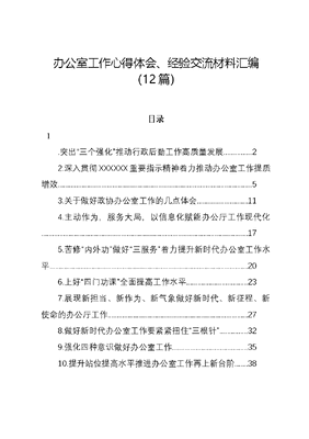 办公室工作心得体会、经验交流材料汇编(12篇)目录1.突出三个强化推动行政后勤工作高质量发展22.深入贯彻XXXXXX重要指示精神着力推动办公室工作提质增效.53.关于做好政协办公室工作的几点体会.114.主动作为,服务大局,以信息化赋能办公厅工作现代化..175.苦修内外功做好三服务着力提升新时代办公室工作水平.206.上好四门功课全面提高工作水平237.展现新担当、新作为、新气象做好新时代、新征程、新使命的办公厅工作..278.做好新时代办公室工作要紧紧扭住三根针329.强化四种意识做好办公室工作..3510.提升站位提高水平推进办公室工作再上新台阶.3811.关于办公室秘书工作的所思所感.4112.干中求进,干中出彩43文可居文库——海量学习资料,手机电脑均可下载www.wenkeju.com突出三个强化推动行政后勤工作高质量发展XXXXXX对新时代办公厅工作作出重要指示,强调提高政治站位、强化政治担当、提升政治能力、落实政治责任,为做好新征程上办公厅工作指明了方向、提供了遵循。近日,行政处党支部召开专门会议,进行深入学习。同志们认为,要深学笃用XXXXXX重要指示精神,突出三个强化,推动行政后勤工作高质量发展,展现出应有的新担当新作为新气象,为全面推进办公厅和人民政协工作作出新的更大贡献。进一步强化政治属性,始终把旗帜鲜明讲政治摆在首位。早在2014年5月8日,XXXXXX在考察中办工作时提出了五个坚持的要求,第一条就是坚持绝对忠诚的政治品格;这次,XXXXXX又提出了四个政治要求。由此可见,讲政治,是办公厅最重要、最突出、最鲜明的属性,是做好办公厅工作的生命线和根本点。要增强理论自觉,学懂弄通做实XXX新时代中国特色社会主义思想,深刻领悟两个确立的决定性意义,以理论上的清醒保持政治上的坚定,把坚决做到两个维护内化于心、外化于行。要牢记国之大者,坚持从全局谋划一域、以一域服务全局,既善于从大处着眼,分析全局、研究大势、加强谋划,又善于从小处着手,抓好具体工作、做好具体事情,为全局工作服务。要提高政治三文可居文库——海量学习资料,手机电脑均可下载www.wenkeju.com力,深刻认识到政治的基本着力点就是具体工作,练就过硬的政治判断力、政治领悟力、政治执行力,真正做到一切工作从政治上看、从政治上抓。进一步强化责任担当,始终把撸起袖子加油干作为常态。在省政协机关,办公厅位于承上启下、联系左右、统筹内外、协调各方的特殊位置,肩负着统筹协调、参谋助手、督促检查、服务保障的重要职能。行政处工作事务繁杂交叉,任何事情等不得、拖不得、慢不得,必须苦干、实干、巧干,才能跟上节拍、适应节奏。要树牢效率意识,紧盯服务保障重点工作、重大项目、重要事项,大力倡导马上就办、办就办好唯实争先、埋头苦干的工作精神,对具体工作一件一件推动、一项一项实施、一个一个解决,切实把工作速度提起来。要培养创新思维,聚焦服务保障职能,坚持守正创新,推动制度机制更加完善、运转流程高效便捷,力争完成的每一篇文稿成为精品、每一次保障工作成为样板、每一项服务工作成为标杆,切实把行政处工作质量提起来。要发扬斗争精神,围绕既定的目标任务,落实任务清单、形成工作闭环,从任务的发起到结束,定期调度、及时反馈、全程督办,不当差不多先生,不做过得去干部,切实把