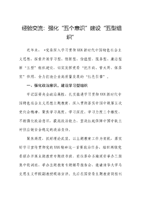经验交流:强化五个意识建设五型组织近年来, *党委深入学习贯彻XXX新时代中国特色社会主义思想,探索开展学习型、创新型、价值型、服务型、廉洁型新五型组织建设,切实发挥党委把方向、管大局、保落实作用,全力打造企业高质量发展的红色引擎。一、强化政治意识,建设学习型组织牢记国资央企政治属性,扎实推进学习贯彻XXX新时代中国特色社会主义思想主题教育,深入贯彻落实中国中铁第五次党代会精神,聚焦学习高度、学习深度、学习力度三个维度,不断强化政治意识,提高政治能力,坚决扛起保障中国中铁主材供应链安全稳定的政治责任。聚焦高度,抓好理论武装。以主题教育工作为契机,落实好学习宣传贯彻党的XXX精神这一首要政治任务,组织两级党委联合开展主题教育专题读书班,前往革命圣地延安举办三期集中轮训班,举办主题教育专题辅导报告会,邀请清华大学马克思主义学院副教授现场宣讲。先后在国资委主题教育简报刊登物贸有关经验做法,在中央主题教育领导小组网站刊稿2篇,在学习强国等平台刊发经验理论文章20余篇。聚焦深度,打造四大讲堂。创新打造开路先锋文化大讲堂、供应链大讲堂、卓越讲堂、法治讲堂四大讲堂品牌,广泛宣传党的创新理论,分析物贸行业前沿形势,强化合规化法治化理念,巩固行业人才优势。聚焦力度,巩固专业优势。深入研讨党的XXX报告着力提升产业链供应链韧性和安全水平重要指示,班子成员先后到所属创新型、平台型企业实地调研,到供应链上下游企业调研交流,将典型案件作为提升业务能力的活教材。二、强化发展意识,建设创新型组织立足全国第一批供应链创新应用示范企业新起点,时刻牢记打造成为中国中铁又一张亮丽名片的殷切期望,以服务数字中国交通强国质量强国等国家战略为导向,加强前瞻研究,深化改革创新,推动实践应用,争当高质量发展的先行军排头兵。文可居文库——海量学习资料,手机电脑均可下载www.wenkeju.com激发人才活力。结合建设平台服务型企业实际需要,创新与华为公司合作,积极借鉴应用华为公司在数据治理、数据资源开发应用方面的先进经验和优势资源,在引进技术咨询的同时在深圳华为坂田基地组织开展领导人员经营管理培训班,深化平台经济认识。加强前瞻研究。优化组织部门设置,积极整合信息化、平台运营、数据管理资源优势,努力探索建筑行业供应链体系新机制、新模式、新技术,不断为行业生态注入新活力、催生新动力。先后入选全国货运供应链产网数实融合优秀案例、全国公共采购优秀案例、全国供应链创新与应用示范案例。制度创新放管服。全面研究梳理党建考核、新闻宣传、支部建设等工作新情况新任务,突出制度层面融合创新,以创新性、时代性、融合性、系统性、科学性和可量化可操作原则,全面删繁就简立改废释,修订党建工作责任制考核评价办法,明确十个一具体举措,构建1+10+2+X大商务管理工作格局等,形成了一批靶向性强的政策措施。文可居文库——海量学习资料,手机电脑均可下载www.wenkeju.com三、强化担当意识,建设价值型组织深刻理解对主业的支撑是最大价值所在,扎实推进大商务管理,聚焦职责定位,坚持保障服务、降本增效,为中国中铁系统贡献物贸价值;坚持以客户为中心,创新打造安全优质高效的供应链体系,全面提升市场竞争能力,进一步夯实物贸价值品牌。坚持主责担当,助推大国基建。锚定主力军、国家队、排头兵定位,明确54321目标,大力推进两个市场,坚持一张蓝图绘到底,先后承担了国内外数千项铁路、公路、市政、水利、房建和城轨等工程的物资集采服务,提供了数千亿元的工程建设物资,努力发挥在建筑业供应链领域深耕细作的独特优势。坚持行业担当,引领行业革新。自主研发打造的建筑业供应链全品类数字化生态平台——集物平台上线运营,组织部门以平台上线为契机,树立行业一流目标,深入剖析企业转型发展面临的难题,找准职转型升级契合点,建立健全长效机制。文可居文库——海量学习资料,手机电脑均可下载www.wenkeju.com坚持社会担当,推动社会和谐。组织群团组织带头开展以青年无偿献血活动、属地社区服务为代表的系列志愿服务,让热爱公益、奉献社会成为物贸青年追逐的新风尚。四、强化宗旨意识,建设服务型组织持续加强资源渠道建设,丰富经营品种,提升应急响应,进一步强化市场服务能力;积极践行以人民为中心的发展思想,建立为群众做实事长效机制,进一步强化组织作风建设,树牢一切工作到基层的意识,加大激励支持力度,为基层送服务、传经验,建强基层战斗堡垒。服务基层导向更鲜明。广泛开展五保一树劳动竞赛,创新开展踔厉奋发保目标,百日大干争前列党建引领办实事服务一线解难题激发活力、破除暮气等行动。优化考核评比标准,按照部门性质及工作